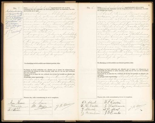No. 5. No. 5. Echtscheiding uitgespraken b. vonnis der recht. bank te Amsterdam van 30 Juli 1964. ingeschreven te Amsterdam, heden, 28 augus- tus 1964 CJ. Vorrbi Heden vijf en twintig Augustus negentienhonderd acht en dertig verschenen Voor mij, Ambtenaar van den Burgerlijken Stand van Amsterdam, ten einde een huwelijk aan te gaan: van Meurs Aldert assistent- accountant, geboren te sloten in Noordholland, wonende alhier oud zes en twintig jaar, meerderjarige overleden en Passer Theodora zoon van: van Meurs Aldert, oud vijf en vijftig jaar, winkelierster wonende alhier en Magrijn Johanna kantoorbediende geboren en wonende alhier oud dertig jaar, meerderjarige dochter van Magrijn, Johannes Marinus en Kers Maria Diederika Adriana Hermina, beiden zonder beroep en wonende alhier. De moeder des bruidegoms verklaarde mij toestemming tot dit huwelijk te geven. De afkondiging tot dit huwelijk is onverhinderd geschied, alhier, Bruidegom en bruid verklaarden mij, elkander aan te nemen tot echtgenooten en getrouwelijk alle plichten te zullen vervullen, welke door de wet aan den huwelijken staat zijn verbonden: Daarop heb ik in naam der wet, verklaard, dat zij door het huwelijk aan elkander zijn verbonden. Als getuigen waren tegenwoordig: van Meurs Maartje, zuster des bruidegoms zonder beroep oud dertig jaar en Magrijn Marie zuster der bruid, Zwemonderwijzeres oud acht en twintig jaar beiden wonende alhier. Waarvan akte, welke overeenkomstig de wet is voorgelezen. No. 6. Heden vijf en twintig Augustus negentienhonderd acht en dertig verschenen voor mij, Ambtenaar van den Burgerlijken Stand van Amsterdam, ten einde een huwelijk aan te gaan: staal Rinus Dinus motot schipper, geboren te Standdaarbuiten wonende alhier, oud zes en twintig jaar, meerderjarige zoon van staal, Jan, oud drie en zestig jaar en Rosenbrand,Jacoba oud vier en vijftig jaar,- beiden zonder beroep en wonende alhier en Carléé Sophia Wilhelmina zonder beroep, geboren en wonende alhier, oud vijf en twintig jaar meerderjarige dochter van: Carlée Thomas Petrus, oud twee en zestig jaar werkman en Walthouwer Grietje oud twee en vijftig jaar, zonder beroep beiden wonende alhier. Beider ouders verklaarden mij toestemming tot dit huwelijk te geven. De afkondiging tot dit huwelijk is onverhinderd geschied, alhier. Bruidegom en bruid verklaarden mij, elkander aan te nemen tot echtgenooten en getrouwelijk alle plichten te zullen vervullen, welke door de wet aan den huwelijken staat zijn verbonden. Daarop heb ik, in naam der wet, verklaard, dat zij door het huwelijk aan elkander zijn verbonden. dis getuigen waren tegenwoordig: Staal Antoon Pieter broeder des bruidegoms schipper oud negen en twintig jaar en Carlie, Jean Baptiste broeder der bruid, houtbewerker oud zes en twintig jaar beiden wonende alhier. Waarvan akte, welke overeenkomstig de wet is voorgelezen. Mv Heure Aan Meurte J Rde TMagryn MM. Wegg Th. v. Paser. D. Staal. W. J Cailie Rdoo S. W. Carlee G Wolthauwer J Ataal A P. Staal J Rosenbram JB Carbee