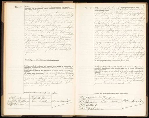 No. 11 Heden een en dertig Augustus negentienhonderd acht en dertig verschenen voor mij, Ambtenaar van den Burgerlijken Stand van Amsterdam, ten einde een huweljk aan te gaan; Smit, George tremmer geboren en wonende alhier, oud twee en dertig jaar, meerderjarige zoon van Smit George, zonder beroep wonende x te Medemblik en Kroon Cornelia Susanna overleden en van Wattingen Johanna Martha Francisca zonder beroep, geboren en wonende alhier, oud drie en twintig jaar meerderjarige dochter van: van Wattingen, Gerardus Joannes oud zes en vijftig jaar, kleermaker wonende alhier en Tiemens Pennigje, overleden De vader der bruid verklaarde mij toestemming tot dit huwelijk te geven. De afkondiging tot dit huwelijk is onverhinderd geschied, alhier. Bruidegom en bruid verklaarden mij, elkander aan te nemen tot echtgenooten en getrouwelijk alle plichten te zullen vervullen, welke door de wet aan den huwelijken staat zijn verbonden. Daarop heb ik, in naam der wet, verklaard, dat zij door het huwelijk aan elkander zijn verbonden. dis getuigen waren tegenwoordig: Kroon Helena Catharina Wilhelmina, tante des bruidegoms oud vier en zestig jaar en Smit Lespoldina Cornelia, zuster des bruidegoms oud drie en destig jaar, beiden zonder beroep en wonende alhier. Waarvan akte, welke overeenkomstig de wet is voorgelezen. No. 12 Heden een en dertig Augustus negentienhonderd acht en dertig verschenen voor mij, Ambtenaar van den Burgerlijken Stand van Amsterdam, ten einde een huwelijk aan te gaan: Aelberts, Wilhelmus Johannes Maria handelsreiziger, geboren te Helmond wonende alhier, oud negen en twintig jaar meerderjarige zoon van: Aelberts Joannes Kenier, oud negen en vijftig jaar, — mandenmaker en Habraken, Alberta Francina oud negen en vijftig jaar, - zonder beroep beiden wonende alhier en Scheepers, Lamberdina Johanna zonder beroep, geboren te Helmond wonende alhier, oud vijf en twintig jaar meerderjarige dochter van Scheepers Albertus, bankwerker en Vogels, Wilhelmina Antonia zonder beroep beiden wonende te Helmond. De ouders des bruidegoms verklaarden mij toestemming tot dit huwelijk te geven. De ouders der bruid hebben toestemming verleend bij authentieke akte De afkondiging tot dit huwelijk is onverhinderd geschied, alhier. Bruidegom en bruid verklaarden mij, elkander aan te nemen tot echtgenooten en getrouwelijk alle plichten te zullen vervullen, welke door de wet aan den huwelijken staat zijn verbonden. Daarop heb ik, in naam der wet, verklaard, dat zij door het huwelijk aan elkander zijn verbonden. uis getuigen waren tegenwoordig: Aelberts Hendrikus broeder des bruidegoms reiziger oud een en twintig jaar en Huis in 't Veld, Simon, zonder beroep, oud drie en zestig jaar, beiden wonende alhier Waarvan akte, welke s voor G. Smit H„ C. W. Kroon J M F v Wattingen Z.L. mit Van soest. NWangen W. Geekens H Aelberts Vansoest SHuisin & Veld Lo v Scheepers J R. Aeberts AT Habruken
