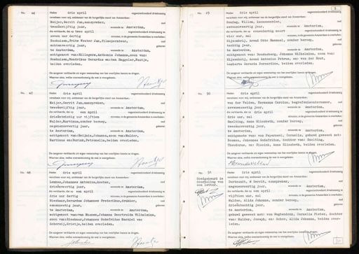No. 46 Heden drie april negentienhonderd drteënzestig; verscheen voor mij, ambtenaar van de burgerlijke stand van Amsterdam: Meijer, Gerrit Jan,aanspreker, oud tweeënvijftig jaar, wonende te Amsterdam, die verklaarde, dat op twee april negentienhonderd drieënzestig te zeven uur dertig minuten, in de gemeente Amsterdam is overleden: Boshuizen, Frits Wouter Jan,filmoperateur, oud achtenveertig jaar, geboren wonende te Amsterdam, te Amsterdam, echtgenoot van: Hillegers, Anthonia Johanna,zoon van: Boshuizen, Hendrikus Gerardus en:ten Heggeler,Naatje, beiden overleden. De aangever verklaarde uit eigen wetenschap van het overlijden kennis te dragen. Waarvan akte, welke overeenkomstig de wet is voorgelezen. Haartj Greyery No. 49 Heden drie april negentienhonderd drieenzestig verscheen voor mij, ambtenaar van de burgerlijke stand van Amsterdam: Sondag, Willem, incasseerder, oud zevenenveertig jaar, wonende te Amsterdam, die verklaarde, dat op eenendertig maart negentienhonderd drieënzestig te vier uur, nul minuten, in de gemeente Amsterdam is overleden: Rijsenbrij, Arend Otto Emanuel, zonder beroep, oud: geboren: tachtig jaar, te Amsterdam, wonende te Amsterdam, echtgenoot van: Doorneberg, Johanna Wilhelmina, zoon van: Rijsenbrij, Arend Antonius Petrus, en: van der Hout, Lamberta Gerarda Bernardina, beiden overleden. De aangever verklaarde uit eigen wetenschap van het overlijden kennis te dragen. Waarvan akte, welke overeenkomstig de wet 's voorgelezen. toog No. 47 Heden drie april negentienhonderd drieënzestig verscheen voor mij, ambtenaar van de burgerlijke stand van Amsterdam: Meijer, Gerrit Jan,aanspreker, oud tweeenvijftig jaar, wonende te Amsterdam, die verklaarde, dat op een april negentienhonderd drteënzestig te drieëntwintig uur vijftien minuten, in de gemeente Amsterdam is overleden oud Mulder, Martinus,zonder beroep, geboren negenenzeventig jaar, wonende te Amsterdam, te Amsterdam, echtgenoot van: Heijnis, Johanna,zoon van: Mulder, Martinus en: Burink, Petronella,beiden overleden. De aangever verklaarde uit eigen wetenschap van het overlijden kennis te dragen. Waarvan akte, welke overeenkomstig de wet is voorgelezen. Bood Opmreyeer No. 50 Heden drie april negentienhonderd drieënzestig verscheen voor mij, ambtenaar van de burgerlijke stand van Amsterdam: van der Velden, Hermanus Carolus, begrafenisondernemer, oud zevenenzestig jaar, wonende te Amsterdam negentienhonderd drieënzestig te die verklaarde, dat op drie april drie uur, nul minuten, in de gemeente Amsterdam is overleden: Snelting, Anna Elisabeth, zonder beroep, oud geboren tweeënzeventig jaar, te Amsterdam, wonende te Amsterdam, echtgenote van: van Peperzeel, Cornelis, gehuwd geweest met: Bosman, Johannes Godefridus, dochter van: Snelting, Theodorus, en: Niesink, Anna Elisabeth, beiden overleden. De aangever verklaarde uit eigen wetenschap van het overlijden kennis te Sragen. 7 Waarvan akte, welke overeenkomstig de wet is voorgelezen. He van de Vellar No. 48 Heden drie april negentienhonderd drieënzestig verscheen voor mij, ambtenaar van de burgerlijke stand van Amsterdam: Lemkes, Johannes Antonius,koster, oud drieënveertig jaar, wonende te Amsterdam, die verklaarde, dat op een april negentienhonderd drieënzestig te drie uur dertig minuten, in de gemeente Amsterdam is overleden: Bieshaar, Gerardus Johannes Frederikus,drukker, oud, geboren eenenzestig jaar, te Amsterdam, wonende te Amsterdam, echtgenoot van:van Maanen, Johanna Geertruida Wilhelmina, zoon van:Bieshaar, Johannes Godefridus Machiel ens Schorsij,Grietje,beiden overleden. De aangever verklaarde uit eigen wetenschap van het overlijden kennis te dragen. Waarvan akte, welke overeenkomstig de wet is voorgelezen. Baante Jaremker No. 51 Goedgekeurd de doorhaling van een letter. — Por 7 Heden drie april negentienhonderd drieënzestig verscheen voor mij, ambtenaar van de burgerlijke stand van Amsterdam: Dortmundt, H Gerrit, aanspreker, oud negenenveertig jaar, wonende te Amsterdam, die verklaarde, dat op een april negentienhonderd drieënzestig te vijftien uur, nul minuten, in de gemeente Amsterdam is overleden Mulder, Alida Johanna, zonder beroep, oud geboren drieëntachtig jaar, te Amsterdam, wonende te Amsterdam, gehuwd geweest met: van Wagtendonk, Cornelis Pieter, dochter van: Mulder, Joseph, en: Schoo, Alida Johanna, beiden overleden. Oe aangever verklaarde uit eigen wetenschap van het overlijden kenntie dragen Waarvan akte, welke overeenkomstig de wet is voorgelezen. Cotman