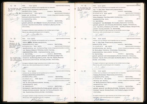 No. 58 de doorhaling van een woord goedgekeurd. Preler Haart Heden vier april negentienhonderd drteënzestig; Belser,Dirk Ferdinand,aanspreker, oud verscheen voor mij, ambtenaar van de burgerlijke stand van Amsterdam: tweeënvijftig jaar, wonende te Amsterdam, die verklaarde, dat op drie april negentienhonderd drieënzestig te negen uur vijftien minuten, in de gemeente Amsterdam is overleden oue Hoolwerf, Doortje,zonder beroep, geboren vierentachtig jaar, te Amsterdam, wonende te Amsterdam, gehuwd geweest met: Klieer Kaiser,Christiaan Jacobus, dochter van: Hoolwerf, Peter en: Mahler,Maria,beiden overleden. De aangever verklaarde uit eigen wetenschap van het overlijden kennis te dragen. Waarvan akte, welke overeenkomstig de wet is voorgelezen. Haantj J Belsee No. 6 de doorhaling van een woord goedgekeurd. . Deb Naar negentienhonderd drieenzestig Heden vier april verscheen voor mij, ambtenaar van de burgerlijke stand van Amsterdam: van 't Hek,Iman Franciscus,aanspreker, oud zesenvijftig jaar, wonende te Amsterdam, die verklaarde, dat op drie april negentienhonderd drteënzestig te dertien uur vijf minuten, in de gemeente Amsterdam is overleden: Bree, Johannes Jacobus,radió-technicus, oud geboren negenenveertig jaar, te Amsteddam, wonende te Amsterdam, echtgenoot van:Hellinki Hollinski, Charlotte Gertrud, gehuwd geweest met:Schulze,Wilhelmina Sophia Petronella, zoon van:Bree, Johannes,overleden en:Noé, Johanna Margaretha, zonder beroep,wonende te Amsterdam. De aangever verklaarde uit eigen wetenschap van het overlijden kennis te dragen. Waarvan akte, welke overeenkomstig de wet is voorgelezen. Haant W: Het No. 59 (VIlkS renvooi en de doorhaling van een woord goedN gekeurd. oe vp Bentf O de doorhaling o van twee woorden goedgekeurd 3 ƒ 7 negentienhonderd drieënzestig Heden vier april verscheen voor mij, ambtenaar van de burgerlijke stand van Amsterdam: Dekker, Nflke Herman,aanspreker, oud negenenveertig jaar, wonende te Amsterdam, die verklaarde, dat op twee april negentienhonderd drieënzestig te tweeëntwintig uur vijfenvijftig minuten, in de gemeente Amsterdam is overleden: oud van Eunen, Johannes Wilhelm,zonder beroep, negenenzestig-jaar, negenenzeventig jaar, geboren te Amsterdam, wonende te Amsterdam, achtereenvolgens gehuwd geweest metBruijn, Engelina Cornelia en: Havinga, Maria,zoon van: van Eunen, Hendrik „ en:Lacourt, Geertruida Adriana,beiden overleden. De aangever verklaarde uit eigen wetenschap van het overlijden kennis te dragen. Waarvan akte, welke overeenkomstig de wet is voorgelezen. Prentj B No. 62 Heden vier april negentienhonderd drieënzestig verscheen voor mij, ambtenaar van de burgerlijke stand van Amsterdam: van 't Hek,Iman Franciscus,aanspreker, oud zesenvijftig jaar, wonende te Amsterdam, die verklaarde, dat op een april negentienhonderd drieënzestig te drieëntwintig uur dertig minuten, in de gemeente Amsterdam is overleden: de Moor,Anna Cornelia Wilhelmina Frederika, oud; negenenzestig jaar,zonder beroep, geboren te Amsterdam, wonende te Amsterdam, gehuwd geweest met: Schoenmaker, Willem Cornelis Johannes, dochter van:de Moor,Adriaan en:Parree,Maria Jacoba Johanna, beiden overleden. De aangever verklaarde uit eigen wetenschap van het overlijden kennis te dragen. Waarvan akte, welke overeenkomstig de wet is voorgelezen. Brantj O: Met No. 60 Heden vier april negentienhonderd drieënzestig verscheen voor mij, ambtenaar van de burgerlijke stand van Amsterdam: Verhaar, Hendrikus,aanspreker, oud drieënvijftig jaar, wonende te Amsterdam, die verklaarde, dat op twee april negentienhonderd drieënzestig te twaalf uur nul minuten, in de gemeente Amsterdam is overleden. van de Kooij,Niesje,zonder beroep, ou geboren sse zevenenzestig jaar, te Amersfoort, wonende te Amsterdam, echtgenote van: Bloothoofd, Johan,gehuwd geweest met: Schaar,Pieter,dochter van:van de Kooij, Cornelis en: van Dusschoten,Dirkje,beiden overleden. De aangever verklaarde uit eigen wetenschap van het overlijden kennis te dragen. Waarvan akte, welke overeenkomstig de wet is voorgelezen. Baant WEeshaan No. 63 Heden vier april negentienhonderd drieënzestig verscheen voor mij, ambtenaar van de burgerlijke stand van Amsterdam: Kimman, Wilhelmus Franciscus,directeur, oud negenenvijftig jaar, wonende te Amsterdam, die verklaarde, dat op een april negentienhonderd drieënzestig te twintig uur dertig minuten, in de gemeente Amsterdam is overleden. de Bruin, Kornelia Maria,zonder beroep, ou geboren eenentachtig jaar, te Zevenhoven, wonende te Amsterdam, gehuwd geweest met: Meere,Abraham Hermanus Christiaan, dochter van:de Bruin,Teunis en: Voshart,Aagje,beiden overleden. De aangever verklaarde uit eigen wetenschap van het overlijden kennis te dragen. Waarvan akte, welke overeenkomstig de wet is voorgelezen. Baartjr N.D Bmm