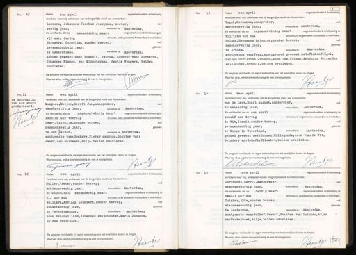 No. 10 Heden een april negentienhonderd drieënzestig verscheen voor mij, ambtenaar van de burgerlijke stand van Amsterdam: Lauwers, Johannes Jacobus Josephus, koster, oud zestig jaar, wonende te Amsterdam, die verklaarde, dat op eenendertig maart negentienhonderd drteënzestig te vijf uur, dertig minuten, in de gemeente Amsterdam is overleden: Hornstra, Cornelia, zonder beroep, oud. geboren zevenentachtig jaar, wonende te Amsterdam, te Gaasterland, gehuwd geweest met: Rijkhoff, Petrus, dochter van: Hornstra, Johannes Fimmes, en: Kloosterman, Jantje Fongers, beiden overleden. De aangever verklaarde uit eigen wetenschap van het overlijden kennisste dragen. 9 Waarvan akte, welke overeenkomstig de wet is voorgelezen. Woo No. 13 Heden een april negentienhonderd drie enzestig verscheen voor mij, ambtenaar van de burgerlijke stand van Amsterdam: oud Vogel, Hermanus,aanspreker, zevenenzestig jaar, wonende te Amsterdam, die verklaarde, dat op negenentwintig maart negentienhonderd drieënzestig te vijftien uur nul minuten, in de gemeente Amsterdam is overleden: Polman, Hermanus Antonius,zonder beroep, oud geboren zesenzeventig jaar, te Arnhem, wonende te Amsterdam, echtgenoot van: Penz,Anna,gehuwd geweest met: Finkenflugel, Helena Christina Johanna,zoon van:Polman, Antonius Gerrardus en: Janssen,Antonia,beiden overleden. De aangever verklaarde uit eigen wetenschap van het overlijden kennis te dragen. Waarvan akte, welke overeenkomstig de wet is voorgelezen. JooH 8 No. 11 de doorhaling van een woord goedgekeurd. mmissecen Haart Heden een april negentienhonderd drieënzestig verscheen voor mij, ambtenaar van de burgerlijke stand van Amsterdam: Meijers, Meijer, Gerrit Jan,aanspreker, oud die verklaarde, dat op negenentwintig maart negentienhonderd drieënzestig te tweeënvijftig jaar, wonende te Amsterdam, zestien uur veertig minuten, in de gemeente Amsterdam is overleden: oue Swart,Trijntje,zonder beroep, geboren negenenzestig jaar, te Den Helder, wonende te Amsterdam, echtgenote van: Donkers,Pieter Jacobus,dochter van: Swart, Jan en: Zwaan,Antje,beiden overleden. De aangever verklaarde uit eigen wetenschap van het overlijden kennis te dragen. Waarvan akte, welke overeenkomstig de wet is voorgelezen. Buntf Gemeesee4 No. 14 negentienhonderd drieënzestig Heden twee april verscheen voor mij, ambtenaar van de burgerlijke stand van Amsterdam: van de Leuv, Henri August,aanspreker, oud drieenzestig jaar, wonende te Amsterdam, die verklaarde, dat op een april negentienhonderd drieënzestig te twaalf uur dertig minuten, in de gemeente Amsterdam is overleden: de Wit,Gerrit,zonder beroep, geboren zevenentachtig jaar, te Broek in Waterland, wonende te Amsterdam, gehuwd geweest met:Koomen, Hillegonda,zoon van:de Wit, Reindert en: Schaft, Elisabet,beiden overleden. De aangever verklaarde uit eigen wetenschap van het overlijden kennis te dragen. Waarvan akte, welke overeenkomstig de wet is voorgelezen. Boost Otvandeban No. 12. Heden een april negentienhonderd drieënzestig verscheen voor mij, ambtenaar van de burgerlijke stand van Amsterdam: Muller,Pieter,zonder beroep, oud achtenzeventig jaar, wonende te Amsterdam, die verklaarde, dat op eenendertig maart negentienhonderd drieënzestig te minuten, in de gemeente Amsterdam is overleden: elf uur nul Gaillard,Adriaan Leendert,zonder beroep, ou geboren eenentachtig jaar, te 's-Gravenhage, wonende te Amsterdam, zoon van: Gaillard, Johannes en:Schouten,Maria Johanna, beiden overleden. De aangever verklaarde uit eigen wetenschap van het overlijden kennis te dragen. Waarvan akte, welke overeenkomstig de wet is voorgelezen. Haartes P Maler No. 15 Heden twee april negentienhonderd drieënzestig verscheen voor mij, ambtenaar van de burgerlijke stand van Amsterdam: Dortmundt, Gerrit,aanspreker, oud negenenveertig jaar, wonende te Amsterdam, die verklaarde, dat op dertig maart negentienhonderd drieënzestig te twaalf uur nul minuten, in de gemeente Amsterdam is overleden: Duinker, Akke,zonder beroep, oud geboren vierenzeventig jaar, te Amsterdam, wonende te Amsterdam, echtgenote van:Golhof, Gerrit,dochter van: Duinker,Arjen en:Westerbeek,Antje, beiden overleden. De aangever verklaarde uit eigen wetenschap van het overlijden kennis te dragen. Waarvan akte, welke overeenkomstig de wet is voorgelezen. Dortmaan Baant