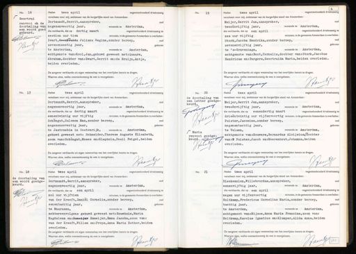 No. 16. Geertrug renvooi en de doorhaling van een woord goed gekeurd. Oostmaez Voertf Heden twee april negentienhonderd drieënzestig; verscheen voor mij, ambtenaar van de burgerlijke stand van Amsterdam: n negenenveertig jaar, wonende te Amsterdam, Dortmundt, Gerrit,aanspreker, oud die verklaarde, dat op dertig maart negentienhonderd drieënzestig te zestien uur tien minuten, in de gemeente Amsterdam is overleden Zwart, Goertruida Juliana Regina,zonder beroep, oud zevenenzestig jaar, geboren te Amsterdam, wonende te Amsterdam, echtgenote van: Kool, Jan,gehuwd geweest met: Quaars, Abraham,dochter van:Zwart, Gerrit en:de Bruijn,Antje, beiden overleden. De aangever verklaarde uit eigen wetenschap van het overlijden kennis te dragen. Waarvan akte, welke overeenkomstig de wet is voorgelezen. Jartjr Dortmenen — No. 19 Heden twee april negentienhonderd drteenzestig verscheen voor mij, ambtenaar van de burgerlijke stand van Amsterdam: Meijer, Gerrit Jan,aanspreker, oud tweeënvijftig jaar, wonende te Amsterdam, die verklaarde, dat op een april negentienhonderd drteënzestig te zes uur vijftig minuten, in de gemeente Amsterdam is overleden. Stork, Jacoba Hendrika,zonder beroep, oud geboren zevenenvijftig jaar, wonende te Amsterdam, te 's-Gravenhage, echtgenote van: Boot, Cornelis,dochter van: Stork, Jacobus Hendricus en: Burgers, Geertruida Maria,beiden overleden. De aangever verklaarde uit eigen wetenschap van het overlijden kennis te dragen. Waarvan akte, welke overeenkomstig de wet is voorgelezen. Brentjs Iayiy No. 17 Heden twee april negentienhonderd drieënzestig verscheen voor mij, ambtenaar van de burgerlijke stand van Amsterdam: Dortmundt, Gerrit,aanspreker, oud negenenveertig jaar, wonende te Amsterdam, die verklaarde, dat op dertig maart negentienhonderd drieënzestig te eenentwintig uur vijftig minuten, in de gemeente Amsterdam is overleden: Schöngut, Salomon Max,zonder beroep, oud geboren negenenzeventig jaar, te Jastrzebia in Oostenrijk, wonende te Amsterdam, gehuwd geweest met: Schneider,Therese Auguste Elisabeth, zoon van: Schöngut, Moses en: Klapholz, Pesil Feigel,beiden overleden. De aangever verklaarde uit eigen wetenschap van het overlijden kennis te dragen. Waarvan akte, welke overeenkomstig de wet is voorgelezen. Beaat Dortminot No. 20 No. 20 de doorhaling van een letter goedgekeurd. GJ Haantj van ( Maria zeurf.Gmiien renvooi goedgeSrant Heden twee april negentienhonderd drieënzestig verscheen voor mij, ambtenaar van de burgerlijke stand van Amsterdam: Meijer, Gerrit Jan,aanspreker, oud tweeënvijftig jaar, wonende te Amsterdam, die verklaarde, dat op eenendertig maart negentienhonderd drteënzestigt drieëntwintig uur vijfenveertig minuten, in de gemeente Amsterdam is overleden 4 oud Puister, Jacomina,zonder beroep, geboren negenentachtig jaar, wonende te Amsterdam, te Velsen, echtgenote van:Rouwers, Bernardus Aloijsiusdochter van:D Puister, Jacob en: Moerenhout, Johanna,beiden: overleden. De aangever verklaarde uit eigen wetenschap van het overlijden kennis te dragen. Waarvan akte, welke overeenkomstig de wet is voorgelezen. Baartf Gmegdr/ No. 18 de doorhaling van een woord goedgekeurd. Ct v JWM JW J Heden twee april negentienhonderd drieënzestig; verscheen voor mij, ambtenaar van de burgerlijke stand van Amsterdam: Dortmundt, Gerrit,aanspreker, oud negenenveertig jaar, wonende te Amsterdam, die verklaarde, dat op een april negentienhonderd drieënzestig te nul uur vijftien minuten, in de gemeente Amsterdam is overleden: van der Kreeft, Daniël Cornelis,zonder beroep, oud geboren; eenentachtig jaar, te Maarssen, wonende te Amsterdam, achtereenvolgens gehuwd geweest met: Bouwhuis,Maria Magdalena en:Eemeijer Esmeijer, Emma Jacoba,zoon van: van der Kreeft,Willem en: Props,Anna Maria Esther,beiden overleden. De aangever verklaarde uit eigen wetenschap van het overlijden kennis te dragen. Waarvan akte, welke overeenkomstig de wet is voorgelezen. Roortjs Wytmnn No. 21 Heden twee april negentienhonderd drieënzestig verscheen voor mij, ambtenaar van de burgerlijke stand van Amsterdam: Bleekemolen,Willebrordus,aanspreker, oud eenenvijftig jaar, wonende te Amsterdam, die verklaarde, dat op een april negentienhonderd drieënzestig t negen uur vijfenveertig minuten, in de gemeente Amsterdam is overleden. Holtkamp, Fredericus Cornelius Maria,zonder beroep, oud geboren tachtig jaar, wonende te Amsterdam, te Amsterdam, echtgenoot van:Nijsse,Anna Maria Francina,zoon van: Holtkamp, Karolus Ignatius en: Klumper, Alida Anna,beiden overleden. De aangever verklaarde uit eigen wetenschap van het overlijden kennis te dragen. Waarvan akte, welke overeenkomstig de wet is voorgelezen. Haante WMmren