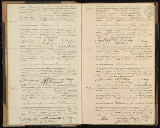 op Dertig dezer des na middags ten zes ure, in het huis, staande als boven is geboren een Kind van het vrouwelijk geslacht, uit Hendrikje Sterk van beroep geen wonende alsboven: zijne Echtgenoot welk Kind zal genaamd worden Petronella van welke Verklaring wij deze Akte hebben opgemaakt in tegenwoordigheid van Carl Peter Petersen van beroep Diamantwerker oud Tweeen dertig Jaren wonende Marnixstraat 277 en van Johannes Gerardus Breukelman van beroep Diamantwerker oud achtentwintig Jaren, wonende Tuinstraat 189 en is deze akte door ons, benevens Den Vader en de Getuigen, na voorlezing onderteekend. C.P.C. Peterser 2. C. P. Peturen Driecen 3 JJ Breukelman No. 9671 Op heden Eenen dertig augustus Achttienhonderd zevenentachtig is voor ons ondergeteekende Ambtenaar van den Burgerlijken Stand der Gemeente Amsterdam, verschenen: Jan Willem van Neijenhof van beroep Kantoorbediende oud negenentwintig Jaren, wonende Frans Halsstraat No. 47, welke heeft verklaard dat op Dertig dezer des voor middags ten Elf ure, in het huis, staande als bovin is geboren een Kind van het Mannelijk geslacht, uit Cornelia Theodora Hardes van beroep geen wonende als boven, zijne Echtgenoot. welk kind zal genaamd worden Gerardus Willebrordus van welke Verklaring wij deze Akte hebben opgemaakt in tegenwoordigheid van Aristopt Heuckersth - van beroep Murick Onderwijzer oud zevenenviftig Jaren wonende Gerard Doustraat 142en van Jchan Coumaas Ordas van beroep verhouder oud zevenendertig Jaren, wonende te Nieuwer Amstel en is deze Akte door ons, benevens Den Vader en de Getuigen, na voorlezing onderteekend. Lriessen JVeijenhoff 2 C. Heeekersten 3 J. C. Ordas No. 9677 Op heden Eenen dertig Augustus Achttienhonderd Zesen-en-Tachtig, is voor ons ondergeteekende Ambtenaar van den Burgerlijken Stand der Gemeente Amsterdam, verschenen: Leonardus Arnoldus Anthonius van Galen van beroep Bediende oud Tweeen dertig Jaren, wonende Kronnne Palmstraat No. 1, wette heeft verklaard dat op achtentwintig dezer des na middags ten zeven ure, in het huis, staande als booen, is geboren een Kind van het dannelijk geslacht, uit Magdalena Geertruida Bakker van beroep geen wonende als boene zijne Echtgenoot welk kind zal genaamd worden Wilhelmus Leonardus Arnoldus welke Verklaring wij deze Akte hebben opgemaakt in tegenwoordigheid van Albert hristiaan van Beek van beroep Bediende oud drie en vijftig Jaren, wonende Rorengracht 192 en van Johannes Leurens Barendsen van beroep Bediende oud zevenenveertig Jaren wonende van Heemskerckstraat 18 en is deze akte door ons, benevens Den Vaderen de Getuigen, na voorlezing onderteekend. 2A C. van Beef Drieilen AtGalen J.L Barendsen