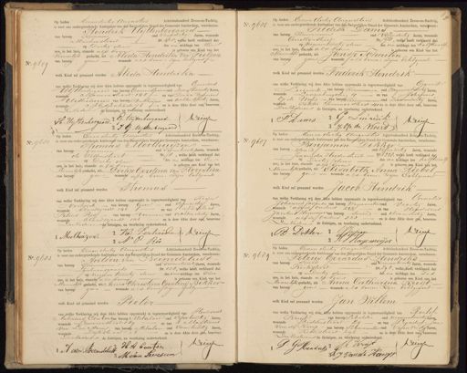 No. 9679 Op heden Eenen dertig Augustus Achttienhonderd Zeven-en-Tachtig, is voor ons ondergeteekende Ambtenaar van den Burgerlijken Stand der Gemeente Amsterdam, verschenen: Hendrik Cueptenboogaard oud vierendertig Jaren, wonende van beroep Koopman No. 325, welke heeft verklaard dat Marnixstraat op Dertig dezer des na middags ten Een ure, in het huis, staande als boven is geboren een Kind van het vrouwelijk geslacht, uit Alida Hendrika Van Tulpen van beroep geen wonende als boven zijne Echtgenoot welk Kind zal genaamd worden Alida Hendrika van welke Verklaring wij deze Akte hebben opgemaakt in tegenwoordigheid van Gerardus Alttenborgaard van beroep Commissienieroud zesen twintig Jaren, wonende Mariuxstraat 148 en van Isaas Gerardus Eliftentrogaard van beroep Houtkooper oud achtentwintig Jaren, Wassaukade 76 en is deze Akte door ons benevens, wonende Sen vaderen de Getuigen, na voorlezing onderteekend. 2 G. Sijkenbergaard Driessen H. Uijftenboogaan. 3 J. G Uijtterboogrard No. 9685 Op heden Eenen dertig Augustus Achttienhonderd Zeven-en-tachtig, is voor ons ondergeteekende Ambtenaar van den Burgerlijken Stand der Gemeente Amsterdam, verschenen: Fredrik Dams van beroep Timmerman oud vijfendertig Jaren, wonende Anellijnstraat No 178, welke heeft verklaard dat op negenentwintig dezer hes na middags ten halftwaalf ure, in het huis, staande als boven is geboren een kind van het Mannelik geslacht, uit Jansje Schouien van beroep geen wonende als boven, zijne Echtgenoot welk Kind zal genaamd worden Frederik Hendrik van welke Verklaring wij deze Akte hebben opgemaakt in tegenwoordigheid van Gerrit Luirink van beroep Timmerman oud negenentwintig Jaren wonende LLangenbrugsteeg 4 en van Johannes Op de Woerd van beroep Timmerman oud zeseniendertig Jaren, wonende Tokke Semensz stiaat 41 en is deze Akte door ons, benevens Den Varderen de Getuigen, na voorlezing onderteekend. 2 G Siurink. F Dame Driessen 3 J. Op de Woerd No. 9681 Op heden Eenen dertig Augustus Achttienhonderd Zeven-en-Tachtig is voor ons ondergeteekende Ambtenaar van den Burgerlijken Stand der Gemeente Amsterdam, verschenen: Thonas Moolhuijzen oud Tweeentwintig Jaren, wonende van beroep voerman No. 8, welke heeft verklaard dat de Wittenstraat op Dertig dezer des na middags ten Een ure, in het huis, staande afs boven is geboren een Kind van het bannelijk geslacht, uit Dirkje Gerdina van Florestein van beroep geen wonende als boven: zijne Echtgenoote welk Kind zal genaamd worden Thromas van welke Verklaring wij deze Akte hebben opgemaakt in tegenwoordigheid van Krijn verheide van beroep geen oud vijfenzestig Jaren, wonende Elandsgracht 146 en van Nocsolaas Petrus Ris van beroep vverman oud achten dertig Jaren wonende Elandsgracht 146 en is deze Akte door op, benevens Den Vadigen de Getuigen, na voorlezing onderteekend. 2 K: Verheid Driessen Moolhuizen. 3 N P Ris No. 968 Op heden Een en dertig Arigustus Achttienhonderd Zeventen-Tachtig is voor ons ondergeteekende Ambtenaar van den Burgerlijken Stand der Gemeente Amsterdam, verschenen: Benjamin Dekker van beroep smid oud vijfendertig Jaren, wonende Jan van der Heijdenstraat N.1 228, welke heeft verklaard dat op Dertig dezer des na middags ten halftwaalf ure, in het huis, staande als boven is geboren een Kind van het Mannelik geslacht, uit Elisabeth Anna Riebel van beroep geen wonende als boven zijne Echtgenoot welk Kind zal genaamd worden Jacob, Hendrik van welke Verklaring wij deze Akte hebben opgemaakt in tegenwoordigheid van Cornelis Johannes Jasperse van beroep wagenmaker oud veertig Jaren wonende als de Ouders 228 en van Hendricus Jacobus Hagemeijer van beroep smid oud drieendertig Jaren, wonende als de Ouders 228 en is deze Akte door ous, benevens Ten Vaderen de Getuigen, na voorlezing onderteekend. B. Dekker 2 Jasssern Driecsen H 70 3 A Hagemeyer No. 9683 Op heden Eenen dertig Augustus Achttienhonderd Zeventen-Tachtig, is voor ons ondergeteekende Ambtenaar van den Burgerlijken Stand der Gemeente Amsterdam, verschenen: Antoon van Beemdelust van beroep Commerman oud Tweeentwintig Jaren, wonende Linbaansgracht No. 126, welke heeft verklaard dat op negenen twintig dezer des voormiddags ten Twee ure, in het huis, staande als boven is geboren een kind van het Mannelijk geslacht, uit Anna Christina Geertruij Bekker van beroep geen wonende als boven zijne Achtgenoot- welk kind zal genaamd worden Pieter van welke Verklaring wij deze Akte hebben opgemaakt in tegenwoordigheid van Hendricus Antoniurs Couton van beroep Metselaar oud Vijfentwintig Jaren wonende Lauvierstraat 189 en van 1 Martinus van Leersum van beroep Metselaar oud Vierentwintig Jaren wonende Dijkstraat 16 en is deze Akte door ous, benevens DenVadert de Getuigen, na voorlezing onderteekend. Dreessen A van Beemdelyg H A Couton 3 M van Leeusum No. 9689 Op heden Eenen dertig Augustus Achttienhonderd Zeven-en-Tachtig, „ is voor ons ondergeteekende Ambtenaar van den Burgerlijken Stand der Gemeente Amsterdam, verschenen: Petrus Gerardus Hendriks van beroep smis oud zevenentwintig Jaren, wonende Kerkstraat No. 298, welke heeft verklaard dat op Dertig dezer des na middags ten zes ure, in het huis, staande als bour is geboren een kind van het bannelijk geslacht, uit Anna Catharina Kreijt, van beroep geen wonende als boven zijne Echtgeport welk kind zal genaamd worden Jan Willem van welke verklaring wij deze ate hebben opgemaakt in tegenwoordigheid van Rvelof Kreijt van beroep schilder oud negenentwintig Jaren, wonende Ridderstraat 29 en van Leendert Jan van de Kamp van beroep schoenmaker oud vijfenveertig Jaren wonende Kerkstraat 296 en is deze kkte door onsbenevens envaderen de Getuigen, na voorlezing onderteekend. Hendrik C Kuijt Driessen P: Go. AJ Van de Kump
