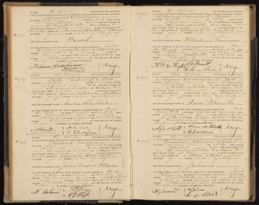 No. 9727 Op heden Een September Achttienhonderd Zeven-en-Tachtig, is voor ons ondergeteekende Ambtenaar van den Burgerlijken Stand der Gemeente Amsterdam, verschenen. Johannes Grisheimer van beroep Steenhouwer oud Eenenveertig Jaren, wonende Frans Halsstraat No. 72, welke heeft verklaard da op Dertig augustus laatstleden des voormiddags ten Een ure, in het huis, staande als boven is geboren een Kind van het Mannelijk geslacht, uit Hendrika Elisabeth van Tylingen van beroep geen wonende als bouw zijne Echtgenit Daniël. welk Kind zal genaamd worden: van welke Verklaring wij deze Akte hebben opgemaakt in tegenwoordigheid van Jacobus Griesheimer van beroep steenhouwer oud zesndertig Jaren, wonende Noorderstraat 3. en van Jacob Rengers van beroep steenhouwer oud Vierenveertig Jaren, wonende Wetering straat 40 en is deze Akte door ons, benevens Den Vaderen de Getuigen, na voorlezing onderteekend. Iohanses Grieshurmen Driessen J. Griethumer No. 9733 Op heden Een September Achttienhonderd Zeven-en-Tachtig, „ is voor ons ondergeteekende Ambtenaar van den Burgerlijken Stand der Gemeente Amsterdam, verschenen: Wilhelmus Franciscus ter Hagha van beroep Garfitter oud dertig jaren, wonende Kinkerstraat Ao. 15 welke heeft verklaard dat op Eenen dertig Augustus laatstleden des na middags ten zeven ure, in het huis, staande alstboven is geboren, een Kind van het Mannelijk geslacht, uit Elisabeth van Guluk- van beroep geen wonende als boven: zijn Echtgenoot welk kind zal genaamd worden Wilhelmus Franciscus van welke Verklaring wij deze Akte hebben opgemaakt in tegenwoordigheid van Coenraad Jan Brandt van beroep Timmerman oud achtenveertig Jaren, wonende Willemstraat 27 en van Casper Hendrik van Steeden van beroep Garfitter oud achtentwintig Jaren wonende Bilderdijk kade 8 en is deze Akte door ons, benevens Den Vader de Getuigen, na voorlezing onderteekend. 2 CJ Brandt 2/ 101, P. ter Ragta Driessen 36 H van Steeden No. 9729 Op heden Een Sentember Achttienhonderd Zeveneen-tachtig, is voor ons ondergeteekende Ambtenaar van den Burgerlijken Stand der Gemeente Amsterdam, verschenen: Pieter Buitenhoff ten Cate oud zesentwintig Jaren, wonende van beroep Makelaar Nassaukade No. 24, welke heeft verklaard dat op Dertig augustus laatstleden des na middags ten Een ure, in het huis, staande als boven is geboren een Kind van het lannelijk geslacht, uit Johanna Antonia van Wettum van beroep geen wonende als boven zijne Echtgenoot welk Kind zal genaamd worden Andries Engelbertus van welke Verklaring wij deze Akte hebben opgemaakt in tegenwoordigheid van Berend ten Cate van beroep Kantoorbediende oud drie en twintig Jaren, wonende Weteringschans 157— en van Dirk Klinkspoort van beroep Kantoorbediende oud zesentwintig Jaren, Lindengracht 42 en is deze akte door ons, benevens, wonende Den vaderen de Getuigen, na voorlezing onderteekend. 2 B. ten Cate Driessen „PBiencati 3 D. Klinkspoor No. 9735 Op heden Een September Achttienhonderd Zaventen-Tachtig, is voor ons ondergeteekende Ambtenaar van den Burgerlijken Stand der Gemeente Amsterdam, verschenen: Adriaan Gustaaf van der Valk van beroep schilder oud negenentwintig Jaren, wonende Sigckelstraat No 44, welke heeft verklaard dat op Dertig Augustus laatstleden des voor middags ten acht ure, in het huis, staande als boven is geboren een Kind van het vrouwlijk geslacht, uit Janke van der Schaaf van beroep geen wonende als boven, zijne Echtgenoot welk kind zal genaamd worden Maria Petronella van welke Verklaring wij deze Akte hebben opgemaakt in tegenwoordigheid van Pieter Van der Valk van beroep schilder oud vieren dertig Jaren, wonende Sigchelstraat 35 en van Diederik Jacobus de Haas van beroep schilder oud Tweeen veertig Jaren, wonende Oudezijds voorburgwal 239 —en is deze Akte door ons, benevens DenVaderen de Getuigen, na voorlezing onderteekend. 22 B van de Valk Driess . . . . . . . . . . . . A. G v d Volk 3 D Ide Hua No. 9731 Op heden Een September Achttienhonderd Zeventen-Tachtig is voor ons ondergeteekende Ambtenaar van den Burgerlijken Stand der Gemeente Amsterdam, verschenen: Frederik Brokmann van beroep Smid oud vieren dertig Jaren, wonende Haarlemmerdijk No. 85, welke heeft verklaard dat op Dertig aurgustus laatstleden des na middags ten Vier ure, in het huis, staande Valsboven is geboren een Kind van het dannelijk geslacht, uit Elisabeth Maria Beyle van beroep geen wonende als boven, zijne Echtgenoot welk Kind zal genaamd worden Johan Frederik Wilhelm van welke Verklaring wij deze Akte hebben opgemaakt in tegenwoordigheid van Cnristeaen Jannes Kok van beroep Kruier oud Eenen dertig Jaren, wonende Lijnbaansgracht 14. en van Johannes Gerardus Beijle, van beroep Koperslager oud negenentwintig Jaren, wonende 1 Vinkenstraat 74 en is deze Akte door ond, benevens DenVaderen de Getuigen, na voorleing opderteekend. Dreessen SJBok F: Brknunn J.G. Beijke No. 9733 Op heden Een September Achttienhonderd zeven-en-Tachtig, is voor ons ondergeteekende Ambtenaar van den Burgerlijken Stand der Gemeente Amsterdam, verschenen: Hendricus Johannes Zwaan van beroep Werkman oud Twintig Jaren, wonende Willemstraat No. 97, welke heeft verklaard dat op Eenen dertig augustus laatstleden des na middags ten tien ure, in het huis, staande als boven is geboren een Kind van het Vrouwelijk geslacht, uit Alida Mens van beroep geen wonende als boven, zine Echtgenoot welk kind zal genaamd worden Juliana van welke Verklaring wij deze Akte hebben opgemaakt in tegenwoordigheid van Karel Zwaan van beroep vischkooper oud Twee en Veertig Jaren, wonende Land van Beloftensteeg 12 en van Leendert Mens van beroep vischkooper oud vijfenVeertig Jaren wonende Willemstraat 190 en is deze Akte door ans, benevens Den Vaderen de Getuigen, na voorlezing onderteekend. Dreessen 2 K Waan HJ Zureven L Mens