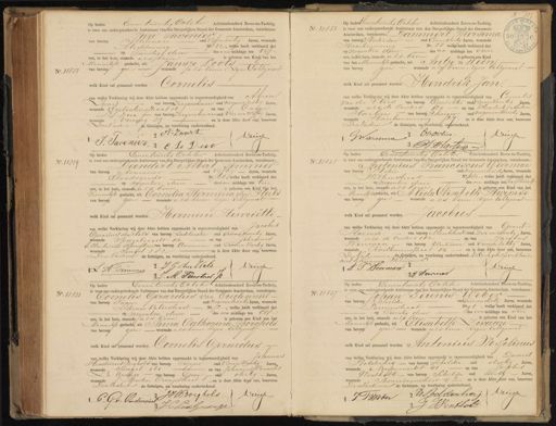 Haarlemmering No. 25 welke heeft verklaard da JD ONE op negentien dezer des na middags ten Twe ure, in het huis, staande als boven is geboren een Kind van het Mannelijk geslacht, uit Antje Mein van beroep geen wonende als boven: zijne Echtgenoot welk kind zal genaamd worden Hendrik Jan. van welke Verklaring wij deze Akte hebben opgemaakt in tegenwoordigheid van Cornelis van der Vlies van beroep Gprichter oud vierenVeertig Jaren wonende als de Ouders /29 en van Hendrik Anton Harlem van beroep Reiziger oud negenentwintig Jaren wonende Haarlemmering 27 en is deze akte door ons, benevens Den Vaderen de Getuigen, na voorlezing onderteekend. WWiersema CvDolies Driessen 3 S: Ha No. 11820 Op heden Eenentwintig Oetber Achttienhonderd Zeven-en-Tachtig, is voor ons ondergeteekende Ambtenaar van den Burgerlijken Stand der Gemeente Amsterdam, verschenen: Leendert Albert Timmer van beroep Aannemer oud vijftig Jaren, wonende Elandsgracht No.68 welke heeft verklaard dat op negentien dezer des voor middags ten tien ure, in het huis, staande als boven, is geboren een Kind van het vouwelijk geslacht, uit Cornelia Hermina den Hals van beroep gan wonende als boven zijne Echtgenoot welk Kind zal genaamd worden Hermine Henriëtte van welke Verklaring wij deze Akte hebben opgemaakt in tegenwoordigheid van Jacobus Gerardus den Hals van beroep zadelmaker oud Tweeenzeventig Jaren wonende Spiegelgracht 12 en van Johannes Martinus Thorestner van beroep Aannemer oud Tweeen Veertig Jaren wonendeTingel 282 en is deze akte door ons benevens Den Vaderen de Getuigen, na voorlezing onderteekend L. H Timmer J J den Hals Driessen M. Furstrel Jz No. 11835 Op heden Eenentwintig October Achttienhonderd Zeven-en-Tachtig is voor ons ondergeteekende Ambtenaar van den Burgerlijken Stand der Gemeente Amsterdam, verschenen: Antonius Franciscus Geerman van beroep Sltoker oud negenentwintig Jaren, wonende No 162, welke heeft verklaard dat Willemstraat— op negentien dezer des na middags ten half twaalf ure, in het huis, staande als boven is geboren een Kind van het Mannelijk geslacht, uit Alida Elisabeth Harmse van beroep geen wonende als boven zijne Echtgenoot welk Kind zal genaamd worden Jacobus van welke Verklaring wij deze Akte hebben opgemaakt in tegenwoordigheid van Gerrit Harmse van beroep Meubelmaker oud Drie enzeventig Jaren wonende als de Ouders 162 en van Jacobus Weerman van beroep werkman oud Tweeen zestig Jaren wonende,Karthuizersstraat 14 en is deze Afte door ons, benevens Den Vader en een de Getuigen, na voorlezing onderteekend. De Eerste getuige verklaarde niet te kunnen schrijven. Driessen A I Weerman 38 Hoerman No. 11831 Op heden Eenentwintig Ocober Achttienhonderd Zeven-en-Tachtig is voor ons ondergeteekende Ambtenaar van den Burgerlijken Stand der Gemeente Amsterdam, verschenen: Cornelis Gerardus van Oudenniel van beroep Tapper oud negenentwintig Jaren, wonende Nieuwe Leliestraat, No2, welke heeft verklaard dat op negentien dezer des na middags ten elf ure, in het huis, staande als boven is geboren een kind van het Mannelijk geslacht, uit Anna Catharina Borghols van beroep geen wonende als boven, zijne Echtgenoot welk Kind zat genaamd worden Cornelis Gerardus. van welke Verklaring wij deze Akte hebben opgemaakt in tegenwoordigheid van Johannes Hendricus Borghols van beroep Tapper oud Vierenteertig Jaren, wonende Singel 161 en van Johannes Cornelis La Grange van beroep geen oud dertig Jaren wonendeBuiten Oranjestraat 8 en is deze akte door ons, benevens DonVaderen de Getuigen, na voorlezing onderteekend Driessen C. Go: Ouderniet HBoighols 5 JC Lad Grange No. 11837 Op heden Eenentwintig October Achttienhonderd Zeven-en-Tachtig is voor ons ondergeteekende Ambtenaar van den Burgerlijken Stand der Gemeente Amsterdam, verschenen: Johan Teunis Weber van beroep schilder oud Tweeendertig Jaren, wonende Laurierstraat No 95, welke heeft verklaard dat op Twintig dezer des voormiddags ten Tien ure, in het huis, staande als boven is geboren een Kind van het kannelijk geslacht, uit Elisabeth Zwaan van beroep geen wonende als boven, zyne Echtgenoot welk Kind zal genaamd worden Antonius Wesselinus van welke Verklaring wij deze Akte hebben opgemaakt in tegenwoordigheid van Danies Bolderheij van beroep schilder oud dertig Jaren, wonende Noordermarkt 41 en van Jacobus Wenthalt van beroep schilder oud dertig Jaren, wonende Soenredamstraat 4 en is deze Akte door ons, benevens Dinvaderen de Getuigen, na voorlezing onderteekend. Driessen E/d Bolderherj JPWeber J Wentholt