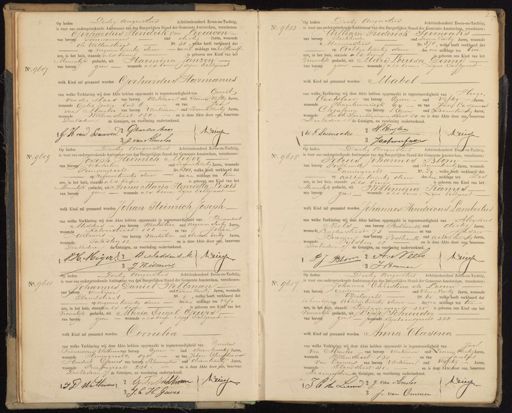 No. 9607 Op heden Dertig Augustus Achttienhonderd Zeven-en-Tachtig, is voor ons ondergeteekende Ambtenaar van den Burgerlijken Stand der Gemeente Amsterdam, verschenen: Gerhardus Hendrik van Leeuwen- van beroep Timmerman oud dertig Jaren, wonende de Wittenstraat, No. 38, welke heeft verklaard dat op negenentwintig dezer des na middags ten halftwaalf ure, in het huis, staande als boven is geboren een Kind van het lannelijk geslacht, uit Harmina Janzen- van beroep geen wonende als bouw zijne Echtgenoot welk kind zal genaamd worden Gerhardus Harmanus van welke Verklaring wij deze Akte hebben opgemaakt in tegenwoordigheid van Gerrit van der Maas van beroep werkman oud Tweeen vijftig Jaren, wonende Gebed zonder End 6. en van Jan van Almeloo van beroep werkman oud zevenenveertig Jaren, wonende Willemstraat 130. en is deze Akte door on benevens Sen Vaderen de Getuigen, na voorlezing onderteekend. G H van Luuwen 2 Ghander haar Driessen J van Almeloo No. 9613 Op heden Dertig Augustus Achttienhonderd Zeven-en-Tachtig is voor ons ondergeteekende Ambtenaar van den Burgerlijken Stand der Gemeente Amsterdam, verschenen: William Frederick Sevenvans van beroep Boekhouder oud Drieen Veertig Jaren, wonende Marninstraat No. 378, welke heeft verklaard dat op Achtentwintig dezer des na middags ten bin ure, in het huis, staande als bovend is geboren een Kind van het Vrouwelijk geslacht, uit Marij Louisa Denni van beroep geen wonende als boven, zine Echtgenoot welk kind zal genaamd worden Mabel van welke Verklaring wij deze Akte hebben opgemaakt in tegenwoordigheid van Hugs Cantslaar van beroep geen oud vijftig Jaren, wonendeHaarlemmerdijk 94 — en van Jan Casparis Choufaur van beroepgeen oud zevenentwintig Jaren, wonende Eerste Spaarndammerstraat 50 en is deze Akte door onsbenevens Den Vaderen de Getuigen, na voorlezing onderteekend. W. F Sevenraks 2 H. Buglaan Driessen 3 Jectronseur. No. 9609 Op heden Dertig Augustus Achttienhonderd Zeven-en-Tachtig is voor ons ondergeteekende Ambtenaar van den Burgerlijken Stand der Gemeente Amsterdam, verschenen: Joseph Heinrich Meijer van beroep winkelier, oud zevenen twintig Jaren, wonende Prinsengracht No. 341, welke heeft verklaard dat op negenentwintig dezer des na middags ten tien ure, in het huis, staande als boven is geboren een Kind van het lannelijk geslacht, uit Anna Maria Henriettg Lexis van beroep geen wonende als boven: zijne Echtgenoot welk Kind zal genaamd worden Johan Heinrich Joseph. van welke Verklaring wij deze Akte hebben opgemaakt in tegenwoordigheid van Bernards Meddens van beroep winkelier oud negenen dertig Jaren wonende Kalverstraat 108 en vanJohan Wilmers van beroep winkelier oud drieen dertig Jaren, wonende Saksteeg 12 en is deze akte door ous, benevens Den vaderen de Getuigen, na voorlezing onderteekend J.H. MeijerJ2 B. Meddens M Dreessen 1„ 3 J Wulmers No. 9615 Op heden Dertig Argustus Achttienhonderd Zdecf-en-Tachtig -is voor ons ondergeteekende Ambtenaar van den Burgerlijken Stand der Gemeente Amsterdam, verschenen: Petrus Johannes Blom van beroep Postbeamber oud zevenentwintig Jaren, wonende Lauriergracht No. 29, welke heeft verklaard dat op achten twintig dezer des na middags ten Zes ure, in het huis, staande als boven, is geboren een Kind van het hannelyk geslacht, uit Willemina Kames- van beroep geen wonende als boven: zijne Echtgenoot welk Kind zal genaamd worden Johannes Hendricus Lambertus van welke Verklaring wij deze Akte hebben opgemaakt in tegenwoordigheid van Hloysius Neels van beroep Postbeambte oud dertig Jaren, wonende Lindenstraat 73 en van Tasper oud achtntwinttig Jaren Bouman van beroep Postbeambte wonende. ijlsteeg 15 en is deze Akte door ops benevens Den vaderen de Getuigen, na voorlezing onderteekend. PJ Blon 2 A: Neels Driessen 3 JBouman No. 9611 op heden Dertig Augustus Achttienhonderd ZevenenTachtig is voor ons ondergeteekende Ambtenaar van den Burgerlijken Stand der Gemeente Amsterdam, verschenen: Johannes Daniel Weltman van beroep werkman oud Tweeenveertig Jaren, wonende Elandstraat No. 8, welke heeft verklaard dat op negenen twintig dezer des na middags ten Vyf ure, in het huis, staande als boom is geboren een kind van het vouwlijk geslacht, uit Maria Engel Geurs van beroep geen wonende als boven zijne Echtgenoot welk Kind zal genaamd worden Cornelia van welke Verklaring wij deze Akte hebben opgemaakt in tegenwoordigheid van Gerardus Franciscus Weltman van beroep Geen oud drieen zeventig Jaren, wonende Heerengracht 595 en van Johan Christiangu Hendrik Geurs van beroep schoenmaker oud drieentwintig Jaren, wonende Prinsengracht 276 en is deze Akte door ons, benevens Den Vaderen de Getuigen, na voorlezing onderteekend. Driesten JD Wettman 2 G Tekman 3 J.C.H. Gauves No. 9617 Op heden Dertig Augustus Achttienhonderd Zeren-en-Tachtig, is voor ons ondergeteekende Ambtenaar van den Burgerlijken Stand der Gemeente Amsterdam, verschenen: Johanna Christina de Leeuw van beroep Verendvrouw oud vieren veertig Jaren, wonende Vijzelgracht No. 61, welke heeft verklaard dat in haar bijrynop achtentwintig dezer des na middags ten tien ure, in het huis, staande Lijnbaansgracht 335 is geboren een kind van het Vrouwelijk geslacht, uit Lysje Schreuder. van beroep geen wonende Lijnbaansgracht 335 welk kind zal genaamd worden Anna Clasina van welke Verklaring wij deze Akte hebben opgemaakt in tegenwoordigheid van Jan van Almeloo van beroep werkman oud zevenen veertig Jaren, wonende Willemstraat 130 en van Jacobus van Ommen van beroep werkman oud vyftig Jaren, wonende Elandstraat 41 en is deze Akte door ons, benevens De aangegsteren de Getuigen, na voorlezing onderteekend. Driessen IA'de Leeuw 2 J van Ameloo J. van Ommin