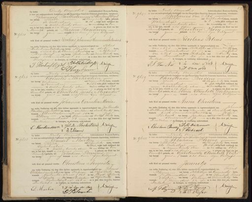 No. 9631 Op heden Dertig Augustut Achttienhonderd Zeven-en-Tachtig is voor ons ondergeteekende Ambtenaar van den Burgerlijken Stand der Gemeente Amsterdam, verschenen: Johannes Partholomeus Fankenflögel van beroep Slachter oud vierendertig Jaren, wonende de Wittenstraat, No. 56, welke heeft verklaard dat op achtentwintig dezer— des voornuiddags ten tien ure, in het huis, staande als boven is geboren een Kind van het lunnelijk geslacht, uit Regina Hagedoorn, van beroep geen wonende als bouw zijne Echtgenoot welk kind zal genaamd worden Nicolaas Johannes Hermanus Antonius van welke Verklaring wij deze Akte hebben opgemaakt in tegenwoordigheid van Petrus Hubertus van Outerster van beroep slachter oud dertig Jaren, wonende Tweede Quits bloemdwarsstraat 14en van Antonius Hagedoorn van beroep Kistenmaker oud zevenentwintig Jaren, wonende Marnixstraat 32 en is deze akte door oud benevens DenVaderen de Getuigen, na voorlezing onderteekend. I Hinkenfld gel Hooldelsterp kreegen No. 9637 Op heden Dertig Augustus Achttienhonderd Zeven-en-Tachtig, is voor ons ondergeteekende Ambtenaar van den Burgerlijken Stand der Gemeente Amsterdam, verschenen: Sacharias van Nes. van beroep Melksliter oud achtendertig Jaren, wonende Wolvenstraat No. 8, welke heeft verklaard da op negenentwintig dezer des voormiddags ten Een ure, in het huis, staande als boven is geboren een Kind van het Mannelijk geslacht, uit Geertrui Bon„ van beroep geen wonende als boven, zijne Echtgenoot welk Kind zal genaamd worden Nicolaas Petrus van welke Verklaring wij deze Akte hebben opgemaakt in tegenwoordigheid van Legen van Nes van beroep Melkslijter oud Tweeenveertig Jaren wonende Leidschestraat 71 en van Jacobus van Nes van beroep Melkslijter oud Veertig- Jaren wonende Rorenstraat 20 en is deze Akte door ops, benevens Den Vaderen de Getuigen, na voorlezing onderteekend. 2 Z Jan Net Driessen S. Van Nes 3 J van Wes No. 9633 Op heden Dertig augustus Achttienhonderd Zeven-en-Tachtig is voor ons ondergeteekende Ambtenaar van den Burgerlijken Stand der Gemeente Amsterdam, verschenen: Cornelis Markestein van beroep Werkman oud negenendertig Jaren, wonende Noorderstraat No. 37, welke Heeft verklaard dat op achten twintig dezer des voor middags ten zes ure, in het huis, staande als bovens is geboren een Kind van het Vrouwelijk geslacht, uit Elisabeth Jacoba Alexander van beroep geen wonende als boven zine Echtgenoot welk Kind zal genaamd worden Johanna Cornelia Maria van welke Verklaring wij deze Akte hebben opgemaakt in tegenwoordigheid van Jan Cornelis Bastiaan Markesteer van beroep werkman oud drie en veertig Jaren, wonende Utrechtschedwarsstraat 58 en van Jan Eliam, van beroep schunmaker oud achten veertig Jaren wonende Noorderstraat 73 en is deze Akte door ons, benevens Den vaderen de Getuigen, na Voorlezing onderteekend. C. Markenstein 2 J. C. B. Markesteind Driesen 9 3 Eliams No. 9639 Op heden Dertig Augustus Achttienhonderd Zeven-en-Tachtig is voor ons ondergeteekende Ambtenaar van den Burgerlijken Stand der Gemeente Amsterdam, verschenen: Christiaan Busing van beroep Smid oud drie en dertig Jaren, wonende Marnixstraat No. 38, welke heeft verklaard dat op achtentwintig dezer des vinmiddags ten Twee ure, in het huis, staande als boven is geboren een Kind van het Vouwelijk geslacht, uit Maria Elisabeth Diekmann van beroep geen wonende als bouw, zijne Echtgenoot welk Kind zal genaamd worden Anna Christina van welke Verklaring wij deze Akte hebben opgemaakt in tegenwoordigheid van Johannes Mattheus Diekmern van beroep Kleermaker oud drie en zestig Jaren, wonende Eerste Laurierdwarsstraat 25 en van Josent — Verbrack van beroep twerkman oud negenentwintig Jaren, wonende Elandsgracht71 en is deze Akte door ans, benevens Den Vaderen de Getuigen, na voorlezing onderteekend. Chritaan Busc J I M Diekmur Driessen 13 J Terbrack No. 9635 Op heden Dertig Augustus Achttienhonderd Zeven-en-Tachtig is voor ons ondergeteekende Ambtenaar van den Burgerlijken Stand der Gemeente Amsterdam, verschenen: Daniel Martin van beroep schilder oud vijfen dertig Jaren, wonende Egelantiersstraat No 1148, welke heeft verklaard dat op achten twintig dezer des na middags ten twee ure, in het huis, staande als boven is geboren een Kind van het Vrouwelijk geslacht, uit Johanna Bruyns van beroep geen wonende als bouw zijne Echtgenoot 6 welk Kind zal genaamd worden Christina Augusta van welke verklaring wij deze Akte hebben opgemaakt in tegenwoordigheid van Johannes Wilhelmus van der Aar van beroep Koopman oud vijfen dertig Jaren wonende, Egelantiersstraat1 146 en van Ernst Frederik Serinkevan beroep stukaden oud vijfenveertig Jaren wonende Egelantiersstraat 146 en is deze Akte door ons, benevens Den Vader de Getuigen, na voorlezing onderteekend Driessen 2 J W van der Aag D Martin E K Seunto No. 9641 Op heden Dertig Augustus Achttienhonderd Zeven-en-Tachtig is voor ons ondergeteekende Ambtenaar van den Burgerlijken Stand der Gemeente Amsterdam, verschenen: Abraham Bleging van beroep schilder, oud Eenen dertig Jaren, wonende da Costastraat No. 114, welke heeft verklaard dat op negenentwintig dezer des na midags ten drie ure, in het huis, staande als boven is geboren een Kind van het Vrouwelijk geslacht, uit Geertruida Elisabeth Visser van beroep geen wonende als bovene zijne Echtgenot welk kind zal geaamd worden Jannetje van welke Verklaring wij deze Akte hebben opgemaaktein tegenwoordigheid van Frans Bleging van beroep Blikslager oud Eenenzestig Jaren, wonende Marnixstraat 189 en van Hendrik Frans Visser van beroep Behanger oud Tweeendertig Jaren, wonende Beeren straat 22 en is deze Akte door ans, benevens Linladeren de Getuigen, na voorlezing onderteekend. Driesse B Pleiene CF Pleguis 3 H F Visser