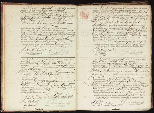 Den Elfden daa Maaad October van het Jaar Achtten honderd dertiendn als ue, voor Naudd ACTE van Overlijden van Wiliem van Rooij. overleden den negenden dezer ten twee ur, te middag oud tweezestig Jaren, wonende in overleden Loijersstraat N 66 Cantoo 5, van beroep bierdragen Hage gehuwd met /zeentje Donars. verders niets bekend. Op de verklaring van Jan Hendrik Kramer bekende van de overledene, oud negen entwintig Jaren, wonende Rhinstraat 13, van beroep winkelier en van Ter dinand Dobbraus Ko bekende van de overledene, oud negen en twintig Jaren, wonende Loijersgragt N 95 van beroep bode bij de burgerlyken Stand Na mijne voorlezing gevorlend door de gemeld getuigen Bevestigd, ingevolge de Wet, door mij ondergeteekende Gerrit ten Jande Adjunct-Maire, Ambtenaar van den Burgerlijken Stand. J: H: Kramer ten Sande F: Fobbraaskt Den Elfden dag der Maand October van het Jaar Achttien honderd dertienden Taalfden op den middag AOTE van Overlijden van Heinrich Zeichenbacher overleden den tienden dezer ten drie ure, des nags oud zesentwintig - Jaren, wonende en overleden in de Nesn18 Canton 2 , van beroep slagersknegt abfen e Berghausen , Baden, ongehuwd zoon van Jacob Leichenbacher van beroep Landbouwer en Anna Maria Schevering op de verklaring van Jurrian Knapschneijder beekende van de ovsrledane, oud drie en Jaren wonenden Kalverstraat N a1 C van beroep broodbokker en van Willem Prost bekendje van de overledene, oud vier en twintig Jaren, wonende Reguliersgragt N 41. van beroep als de overgedene Na mijne voorlezing geteekend door de gemelde getuigen. Bevestigd) ingevolge de Wet, door mij ondergeteekende Gerrit ten Van de Adjunct-Maire, Ambtenaar van den Burgerlijken Stand. J J. Krapsnader G: ten Sande W: Groszr Den Elfden dag der Maand October van het Jaar Achtsien honderd dertien ten Elf ure, voor den oudelag, A0TE van Overlijden van Maria Bolkestin overleden den negenden dezer ten twee ure, de middags oud Een en Eenhalf Jaren, wonende en overleden Utrechtsedaars straat n 111 Canton s/ van beroep- geboren te Amsterdam, dogter van Hermanus Bol kestijn en Elisabeth Quant. Op de verklaring van bovengemelde Vader van de overledene oud drie en dertig Jaren, wonende als boven van beroep Kleremaker en van Eerardus Quart aom van de overledene, oud Eenentwintig Jaren, wonende Staalstraat 9 29 van beroep Geen Na huijne voorlezing geteekend door de gemelde getuigen Bevestigd, ingevolge de Wet, door mij ondergeteekende errit ten Jan de Adunct-Maire, Ambtena van den Burgerlijken Stand. J:H Bolkestyn G ten Sande G: Quant Den Elfdendag de Maand October van het Jaar Achttien honderd dertien ten twaalf ure, op den middag. A0TE van Overlijden van Maria Hofman. overleden den negenden dezer ter negende, des morgens oud ses en Veertig Jaren, wonende en Overleden Eerste bomdwart t in een gang, van beroep 131 Carton G AAmsterdam, weduwe van Hermanus stam van beroep Teerwerker verders niets bekend. O J vandag ver Willem Stame stedezoon van de overledene, oud Ses en twintig Jaren, wonende als boven van beroep belikslagen knegt en van Hendrik Oostendorp bekende van de overledene, oud veertig Jaren, wonende baargragt bij Laurierstraat N 212 van beroep als boven Na mijne voorlezing geteekend door de gewelde getuigen Berestten, ingevolge de Wet, door mij ondergeteekende Gerrit ten Sande Adjunct-Maire, Ambtenaar van den Burgerlijken Stand. W Stam G ten Sande 771 Htoud= Oostendorp