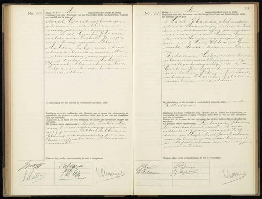 No. 102 Heden vier Mei negentienhonderd negen en dertig verschenen voor mij, Ambtenaar van den Burgerlijken Stand van Amsterdam, ten einde een huwelijk aan te gaan: Nordt Gerrit voetkurdige, geborenen wonende alhier, oud een endertig jaar, meerderjarige zoon van Nordt, Cornelis Johannes overleden en Visbeek Jansje. zonder beroep wonende alhier en Mulder, Pokje zonder beroep, geboren te Deverter, wonende alhier ouddrie endertig jaar meerders- jarige Lochter van Mulder Hendrik, kleermaker en Kroes, okje, zonder beroep, beiden. wonende alhier De afkondiging tot dit huwelijk is onverhinderd geschied, alhier. Bruidegom en bruid verklaarden mij, elkander aan te nemen tot echtgenooten en getrouwelijk alle plichten te zullen vervullen, welke door de wet aan den huwelijken staat zijn verbonden. Daarop heb ik, in naam der wet, verklaard, dat zij door het huwelijk aan elkander zijn verbonden. Als getuigen waren tegenwoordig: Nordt, Pieter Sn „dries, broeder desbuudegoms, ondeeren veertig jaar en Parbert Albertus Johannes oud drieendertig jaar beiden rijfsamblenaar van beroep en wonende alhier Waarvan akte, welke overeenkomstig de wet is voorgelezen. No. 103. Heden vier Mei negentienhonderd negen en dertig verschenen voor mij, Ambtenaar van den Burgerlijken Stand van Amsterdam, ten einde een huwelijk aan te gaan. tKart, Johannes, chef monteur geboren te Vaardiagen, wonende te Hot„ terdam, ont tweeen vijftig jaar, weduwe naar van vander sman, Geer huida Maria, meerderjarige zoon van ’'t Hart, Willem en Groe„ neveld, Maria, beiden overleden „ Riksman Hester, zonder beroep geboren en wonende alhier nitveertig jaar van echtgescheiden echtgenoote van: Geerkens, Jan Frederik nurderjari gezochtervan Riksman, Leerdert, overleden en Klancke, Egbertien zonder beroep, wonende alhier, De afkondiging tot dit huwelijk is onverhinderd geschied, alhieren1 Hotterdam Bruidegom en bruid verklaarden mij, elkander aan te nemen tot echtgenooten en getrouwelijk alle plichten te zullen vervullen, welke door de wet aan den huwelijken staat zijn verbonden. Daarop heb ik, in naam der wet, verklaard dat zij door het huwelijk aan elkander zijn verbonden. Als getuigen waren tegenwoordig: Riksman, Johannes broeder der bruid, mactinist, o achtendertig jaar wonende te Rotter„ dan en slegtenhorst Jacob, schoon zoon des bruidegoms, eerste luntraat der Infanterie oud zesentwintig jaar wonende te Breda Waarvan akte, welke overeenkomstig de wet is voorgelezen. Jvv P Afmern CMsemm J.V V J Mat