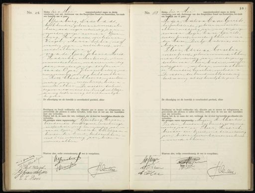 No. 112 Heden tien Mei negentienhonderd negen en dertig verschenen voor mij, Ambtenaar van den Burgerlijken Stand van Amsterdam, ten einde een huwelijk aan te gaan: Oppenburg. Nicol das boekhouder, geboren en wonende al„ hier oed negenentwintig jaar meerderjarige zoon van: Ypen. burg, Hermanus overleden en Wiegel Maria Sophia, ondvijf enzestig jaar, zonder beroep, wo„ nende alhier en van de Geer Johanna Maria Hendrikd, zonder beroep geboren. en wonende alhier, oudvier entwintig jaar, meerderjarige dochter van van de Geer. JohannesSntoon, oud zevenenveertig jaarboekdrukker en Roos, blard blasiat, ondachter eertig jaar, zonder beroep, beiden wonende alhier, De moeder Lesbuni, degomsen de ouders des bruidverklaar den mij toestemming tot dit huwelijk te geven De afkondiging tot dit huwelijk is onverhinderd geschied, alhier. Bruidegom en bruid verklaarden mij, elkander aan te nemen tot echtgenooten en getrouwelijk alle plichten te zullen vervullen, welke door de wet aan den huwelijken staat zijn verbonden. Daarop heb ik, in naam der wet, verklaard, dat zij door het huwelijk aan elkander zijn verbonden. Als getuigen waren tegenwoordig Yperburg herman broeder des bruidegoms, verzekerings. inspecteur oud eenenveertig jaar in van de Geer Herdrik Christiaan, broeder der bruid, boekdrikker. oud drie entwintig jaar, beiden wonende alhier Waarvan akt e, welke overeenkomstig No. 113. Heden tien Mei negentienhonderd negen en dertig verschenen voor mij, Ambtenaar van den Burgerlijken Stand van Amsterdam, ten einde een huwelijk aan te gaan: Meyer Antoon Inne Gerrits kantoorbediende, geboren en wonende alhier onddertig jaar meerderjarige zoomvda: Meijer, Inne Gerrits zonder beroep, wonende alhier en van den Ham, Dirkje Antonia, over„ lederen Sleer, Adriena Cornelia zonder beroep, geboren en wonende alhier, oudacht entwintig jaar meerderjarige dochter van: Heer, Andries ondvijf en zestig jaal, werkman, wonende alhier en Reinders, Cornelia, overleden De vader der buuid verklaarde my toestemming tot dit huwelijk te geven De afkondiging tot dit huwelijk is onverhinderd geschied, alhier Bruidegom en bruid verklaarden mij, elkander aan te nemen tot echtgenooten en getrouwelijk alle plichten te zullen vervullen, welke door de wet aan den huwelijken staat zijn verbonden. Daarop heb ik, in naam der wet, verklaard, dat zij door het huwelijk aan elkander zijn verbonden. Als getuigen waren tegenwoordig: Meyer AMertus Pieter, broeder tes bruidegows, oud veertig jaar en Heer Herdrik broeder der bruit oud drie en twintig jaar, beiden kantoorbediende van beroep en wonende alhier, Waarvan akte, welke overeenkomstig de wet is voorgelezen. Coefenbert 5 N 1 Jvaaf JH.S. Wiegel. J Oerteeg StvandeGoer 0 C E Roos Aostee t Hajen Jt JC.Vleen Olrleeg. H Fea