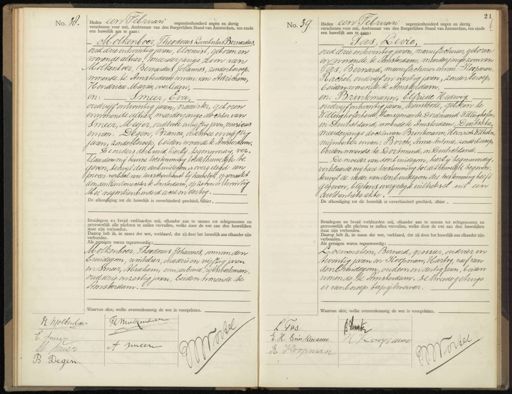 No. 383 Heden een Februari negentienhonderd negen en dertig verschenen voor mij, Ambtenaar van den Burgerlijken Stand van Amsterdam, ten einde een huwelijk aan te gaan: Molkenboer Theodous Lambertus Bernardus, ond drie entwintig jaren, bloemist, geboren en wonende alhier: meerderjarige zoon van Molkenboer, Bernardus Johannes, zonder beroep, wonende te Amsterdam en van: van Adrichem, Hendrica Maria, overleden, en: Smeer, Era oudvijf entwintig jaren, nauister, geboren enwonende alhier, meerderjarige dochter van Smeer, Meijer, oud twee envijftig jaren, mnsicus envan: Degen, Branca, ond twee envijftig jaren, zonder beroep, beiden wonende te Amsterdam. De ouders derbund, hierbij tegenwoordig, verklaarden mij hunne toestemming todithuwelijk te geven, terwijl door den budegem is overgelegd een proces-verbaal van tusschenkamst bij huwtelijk opgemaakt door den Kantonrechter te Amsterdam, op zeven entwintig Mei negentienhonderd acht en dertig. De afkondiging tot dit huwelijk is onverhinderd geschied, alhier. Eruidegom en bruid verklaarden mij, elkander aan te nemen tot echtgenooten en getrouwelijk alle plichten te zullen vervullen, welke door de wet aan den huwelijken staat zijn verbonden. Daarop heb ik, in naam der wet, verklaard, dat zij door het huwelijk aan elkander zijn verbonden. Als geuigen waren tegenwoordig: Molkenboer, Thoodous Johannes, oomvan den bruidegom, winhelier, ondarie en vijftig jaren en Smeer, Abraham, omderbruid rijksberkman oud drie enzestig jaren, beiden wonende tbe 6 Amsterdam. Waarvan akte, welke overeenkomstig de wet is voorgelezen. No. 39. Heden een Februari negentienhonderd negen en derig verschenen voor mij, Ambtenaar van den Burgerlijken Stand van Amsterdam, ten einde een huwelijk aan te gaan: Ias, Levie. oud drie entwintig jaren, manulacturier, geboren en wonende te Amsterdam, meerderjarige zoon van Ias, Bernard, mumssacturier en van: Koopman Rachel, oudvijf en veertig jaren, zonder beroep, beiden wonende te Amsterdam, en: Brinkmann, Elfriede Hedwig. oudvijf entwintig jaren, drenstoode, geboren te Wellinghoferheide, thans gemeente Dordmind-Wellinghofen, in Duitschland, wonende te Amsterdam, Duitsche meerderjarige dochter van Brinkmann, Heinrich Wilhelm, mijmverker en van: Borch, Anna Antonie, zonderberoep, beiden wonende te Dortmund, in Duitschland. De moeder van denbruidegom, hierbij tegenwoordig verklaarde mij hare toestemming tot uithuwelijk tegeven, tenwijl de vader van den bundegom die toestemming heeft gegeven, blijkens overgelegd uittreksel uit een Authentieke akte. De afkondiging tot dit huwelijk is onverhinderd geschied, alhier Bruidegom en bruid verklaarden mij, elkander aan te nemen tot echtgenooten en getrouwelijk alle plichten te zullen vervullen, welke door de wet aan den huwelijken staat zijn verbonden. Daarop heb ik, in naam der wet, verklaard, dat zij door het huwelijk aan elkander zijn verbonden. Als getuigen waren tegenwoordig: Loewenstein, Bernard, grossier, oudvier en twintig jaren en Koopman, Hartog, nief van denbruidegom, oud een en dertig jaren, beiden wonende te Amsterdam. De tweede getuigen is van beroep tapijtwerver T Molteneee Th. Wolkenboer 9 E Smier A mmeen D Smeer B. Degen. L Gas. Pr E. H. Brin Kuiauu Zoopman D 1 R Koopman