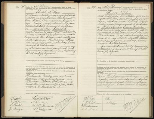 No. 44. Heden acht Februari negentienhonderd negen en dertig verschenen voor mij, Ambtenaar van den Burgerlijken Stand van Amsterdam, ten einde een huwelijk aan te gaan Stodel, Nathan¬ ondzeven entwintig jaren, magazijnbediende; geboren en wonende alhier, meerderjarige zoon van Stodel, Levie, ond twee enzestig jaren en van: Sweijd, Jansje, oudeen enzestig jaren, beiden zonder beroep en wonende te Amsterdam, en — van de Kar, Elizabeth, oudzes entwintig jaren, sigarenwinkelierster geboren en wonende alhier, meerderjarige dochter van van de Kar, Eliazer, ondeen envijftig jaren, koopman en van: Kinsbergen, Anna, oud een envijftig jaren, zonder beroep, beiden wonende te Amsterdam. De ouders van bruidegemenbruid, hierby tegenwoordig, verklaarden mij hunne toestemming tot dit huwelijk tegenen. De afkondiging tot dit huwelijk is onverhinderd geschied, alhier , - Bruidegom en bruid verklaarden mij, elkander aan te nemen tot echtgenooten en getrouwelijk alle plichten te zullen vervullen, welke door de wet aan den huwelijken staat zijn verbonden. Daarop heb ik, in naam der wet, verklaard, dat zij door het huwelijk aan elkander zijn verbonden. Als getuigen waren tegenwoordig: Kerkmeester, Hartog, oom derbrid- koopman, oud vier envijftig jaren en Kinsbergen, Salomm, om derbund winkelier, oudvier envyftig jaren, beiden wonende te Amsterdam. Waarvan akte, welke overeenkomstig de wet is voorgelezen. No. 45 Heden acht Februari negentienhonderd negen en dertig verschenen voor mij, Ambtenaar van den Burgerlijken Stand van Amsterdam, ten einde een huwelijk aan te gaan: Roos, Willem. oud dertig jaren, huisschieder, geboren en wonende alhier, meerderjarige zoon van Roos, Antoon en van: Sikkenk, Trijntje beiden zonder beroep inwonende te Amsterdam, en Kloosterman, Emma Frederika, oud twee en twintig jaren, zonderberoep, geboren en wonende alhier, meerderjarige dochter van Hloosterman, Jacob, oudvier envijftig jaren tuinder en van: Mense, Annettd Maria, oudzes envijftig jaren, zonder beroep, beiden wonende te Amsterdam. De ouders derbruid, hierbij tegenwoordig verklaarden mij huime toestemming tot art huwelijk tegeven. De afkondiging tot dit huwelijk is onverhinderd geschied, alhier, Bruidegom en bruid verklaarden mij, elkander aan te nemen tot echtgenooten en getrouwelijk alle plichten te zullen vervullen, welke door de wet aan den huwelijken staat zijn verbonden. Daarop heb ik, in naam der wet, verklaard, dat zij door het huwelijk aan elkander zijn verbonden. Als getuigen waren tegenwoordig: 18 Roos, Liet, broedervan den bundigen, electiisch lasscher, omtvier entwintig jaren en slagboom, Star, zwagerderbruid, monten, oud zeven entwintig jaren, beiden wonende te Amsterdam 0