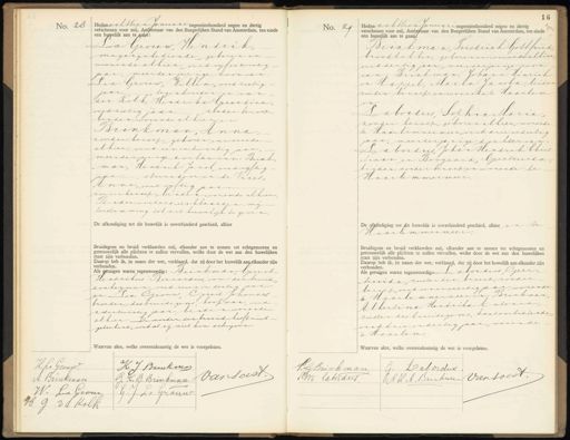 No. 28 Heden achttien Januari negentienhonderd negen en dertig verschenen voor mij, Ambtenaar van den Burgerlijken Stand van Amsterdam, ten einde een huwelijk aan te gaan: Ld Grouw Hendrik, maga zijn bediende geboren en wonende alhier, oud vijf en twintig jaar, meerderjarige zoorvan La Grouw, Willem, oud zestig jaar tegenhonder en van der Kolk, Hendrika Gerardina oudzestig jaar, zonder beroep, beiden wonende alhier en Brinkman, Anna. zonder beroep geboren en wonende alhier, oud een en twintig jaar, meerderjarige dochter van Brink„ „man, Herdrik Jacob, ondvijftig op,stucadoor en de vries„ Aen nag oedvijftig jaar zonder beroep, verder wonende alhier Beider ondersverklaarden mij toestemming tot dit huwelijk te geven, De afkondiging tot dit huwelijk is onverhinderd geschied, alhier, Bruidegom en bruid verklaarden mij, elkander aan te nemen tot echtgenooten en getrouwelijk alle plichten te zullen vervullen, welke door de wet aan den huwelijken staat zijn verbonden. Daarop heb ik, in naam der wet, verklaard, dat zij door het huwelijk aan elkander zijn verbonden. Als getuigen waren tegenwoordig: Brinkman Gerrit Hertrikus Bernardus oom derhuid dorkeyman, oud zeven en dertig jaar en La Grouw, Gerrit Johannes broeder desbruidegoms koopman, oud zesentwintig jaar beiden wonende alhier. De moeder der bimd heeft niet- geteekend, omdst zy niet kon schrijven. Waarvan akte, welke overeenkomstig de wet is voorgelezen. No. 29 Heden achttien Januari negentienhonderd negen en dertig verschenen voor mij, Ambtenaar van den Burgerlijken Stand van Amsterdam, ten einde een huwelijk aan te gaan. Brinkman, Friedrich Gottfried broodbakker, geboren en wonende alhier. ouddertig jaar meerderjarige zoon van: Briakman, Johann Hinrich en Happel, Maria Jacoba, beide zonder beroep en wonende te Haarlem ze Labordus Sophia Maria, zonder beroep, geboren alhier, wonend te Haarlemmermeer oud drie endertig jaar, meerderjarige dochter van: Zabordus Johan Hendrik Chris „tiaan en Boogaard, Geertrinita, beiden zonder beroep en wonende te Haarlemmermeer De afkondiging tot dit huwelijk is onverhinderd geschied, alhier en te Haarlemmermeer Bruidegom en bruid verklaarden mij, elkander aan te nemen tot echtgenooten en getrouwelijk alle plichten te zullen vervullen, welke door de wet aan den huwelijken staat zijn verbonden. Daarop heb ik, in naam der wet, verklaard, dat zij door het huwelijk aan elkander zijn verbonden. Als getuigen waren tegenwoordig:Zabordus Geer. trmida ruster der bruid, zonder beroep oud eenenveertig jaar, wonende te Haarlemmermeer en Brinkwar Albertina Herdrika Antoria zuster des bruidegoms, kantoorbedierde oud drie endertig jaar, wonende te Haarlem. Waarvan akte, welke overeenkomstig de wet is voorgelezen. H. La Group. H J Brinkman J. H. B. Brinkman Van Soest. A. Brinkman