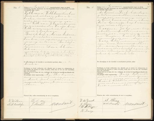 No. 5 Heden vier Januari negentienhonderd negen en dertig verschenen voor mij, Ambtenaar van den Burgerlijken Stand van Amsterdam, ten einde een huwelijk dan te gaan: Willemsen Wilhelmus Nicolaas Frederik werkman, geboren te Arcken wonende alhier, oud eer en twintig aar meerderjarige zoon van Willemsen Johannes Adrianus tren conduiteur en Viertjes, Anna Willemina zonder beroep, beiden wonende te Arnhemen Boschhofen Maria Antonia, zonder beroep geboren en wonende te srahem, oud negentien jaar min„ „derjarige dochter van Boschhofen Argust: kruiderier en Jolman Aleida Helera zonder beroep, beiden wonende te Aratem Beider ouders hebben toestemming tot zrt huwelijk verleend bij authentieke akten. De gkondiging, tot dit huwelijk is onverhinderd geschied, alhier en te Hrakem. Bruidegom en bruid verklaarden mij, elkander aan te nemen tot echtgenooten en getrouwelijk alle plichten te zullen vervullen, welke door de wet aan den huwelijken Staat zijn verbonden. Daarop heb ik, in naam der wet, verklaard, dat zij door het huwelijk aan elkander zijn verbonden. Als getuigen waren tegenwoordig: Meij, Theo Sugword, tuinier oudvierendertig jaar en en Mossel, Jacob, winkelier, ond zeven entwintig jaar, beiden wonende alhier. Waarvan akte, welke overeenkomstig de wet is voorgelezen. No. 6 Heden vier Januari nege iderd negen en dertig verschenen voor mij, Ambtenaar van den Burgerlijken Stand van Amsterdam, ten einde” een huwelijk aan te gaan: de Groot, Derk, koperslager geboren en wonende alhier, oudtweeren twintig jaar, meerderjarige zoor vak de Groot, buurd overleden en Arends Maria Geerhuisa Engelina zonder beroep, wonende alhier en Kuijper, Joekje, zonder beroep geboren en wonende alhier, ondeer en twintig jaar, meerderjarige dochter van: Kuijper, Herdrik Bernard oud zevenenveertig jaarsager en ang, Hiltje oudvierenveertig jaar zonder beroep, beiden wonende alhier, De ouders der band verklaarden mij toestemming tot dit huwelijk te gever. De moeder desbruidegoms heeft toestemming verleend by authertieke akte. De afkondiging tot dit huwelijk is onverhinderd geschied, alhier Bruidegom en bruid verklaarden mij, elkander aan te nemen tot echtgenooten en getrouwelijk alle plichten te zullen vervullen, welke door de wet aan den huwelijken staat zijn verbonden. Daarop heb ik, in naam der wet, verklaard, dat zij door het huwelijk aan elkander zijn verbonden. Als getuigen waren tegenwoordig: Rang, Sijbraadt grootvader der bruid, zonder beroep oud eenen zeventig jaar en trends Herndrik Wilhelmus, som desbruide „goms werkman, ood zesenvijftig jaar beiden wonende alhier Waarvan akte, welke overeenkomstig de wet is voorgelezen. H. J: We W. Willeman vansoet J. Morsel M: A. Boschafer S Rang D de Groot. W Arend Vansoest. J Kuyper. H B Kussn H. Rang