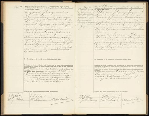 No. 13. Heden vier Januari negentienhonderd negen en dertig verschenen voor mij, Ambtenaar van den Burgerlijken Stand van Amsterdam, ten einde een huwelijk aan te gaan: Siegrest Johan, murikaat geboren te 's Gravenhage, wonende alhier oud twee endertig jaar, van echt gescheiden echtgenoot van: Stoop. Maria Johanna meerderjarige zoon van Siegrest Cornelis over„ leden en Beck Johanna Maria zonder beroep, worende alhier en Bakker, Maria Johanna zonder beroep geboren en wonende. alhier oud drie entwintig jaar meerderjarige dochter van Bakker, Jacob Johannes koopman en Scheffer, Anna Maria, zonder broep beiden wonende alhier De ouders der bund heb ber toestemming tot dit huwelijk verleend bij authertieke akte. De afkondiging tot dit huwelijk is onverhinderd geschied, alhier Bruidegom en bruid verklaarden mij, elkander aan te nemen tot echtgenooten en getrouwelijk alle plichten te zullen vervullen, welke door de wet aan den huwelijken staat zijn verbonden. Daarop heb ik, in naam der wet, verklaard, dat zij door het huwelijk gan elkander zijn verbonden. Als getuigen waren tegenwoordig: Siegrest Wilhelmus- Hendrikus George, broeder des bruidegoms, metaalbewerker, oud eenendertig jaar en Schouten, Her„ man, mudicus, oudacht entwintig jaar beiden wonende alhier Waarvan akte, welke overeenkomstig de wet is voorgelezen. No. 14 uitgesrohuis Echtscheiding. be Bomns cier richtbank te Am. sterdam van 6 Juli 1961, in- geschreven te Amsterdam. heden. Hangen dus 1961. B Heden elf Januari negentienhonderd negen en dertig verschenen voor mij, Ambtenaar van den Burgerlijken Stand van Amsterdam, ten einde een huwelijk zan te gaan: Umer, Johann Heinrich Zudwieg, banketbakker ge„ „boren te Bremen in Duitschland, wonende alhier, oud zesentwintig jaar Zuitscher meerderjarige zoon van Almer Johann Ludwig Hein zich, overledenen Ruhmkorff Gephe Gesine, zonder beroep wonende alhier en Koning Susanna Johanna Maria, corsettenmaakster, geboren en wonende alhier, oud twee en dertig jaar, meerderjarige dochter van Koning, Antony Rijtze en Leink Sjoukje Alida, beiden zonder beroep en wonende alhier. De afkondiging tot dit huwelijk is onverhinderd geschied, alhier Bruidegom en bruid verklaarden mij, elkander aan te nemen tot echtgenooten en getrouwelijk alle plichten te zullen vervullen, welke door de wet aan den huwelijken staat zijn verbonden. Daarop heb ik, in naam der wet, verklaard, dat zij door het huwelijk aan elkander zijn verbonden. Als getuigen waren tegenwoordig: Handgraaf, Johannes bloemist, oud zesenveertig jaar en Versteeg Wilhelmus, bakker, oudzesen twintig jaar, beiden wonende alhier. Waarvan akte, welke overeenkomstig de wet is voorgelezen. Peget WH JGigen. H. Schauten van Soest. M. J. Bakker JJ Handgraaf I. H: L: Ulmer JD JW Versteeg van Soest. J J. M. Koning