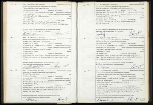 No. 40 Heden vijfentwintig februari negentienhonderd vierenzestig verscheen voor mij, ambtenaar van de burgerlijke stand van Amsterdam: Verweij, Gerrit,begrafenisleider, oud zevenenvijftig jaar, wonende te Mijdrecht, die verklaarde, dat op vierentwintig februari negentienhonderd vierenzestig te een uur,dertig minuten, in de gemeente Amsterdam is overleden: Vastenhout, Gerrit Willem,drukker, Eian d zeventien jaar, geboren te Apeldoorn, wonende te Mijdrecht, zoon van : Vastenhout, Gerrit Willem,drukker en : Rooze, Hilletje,zonder beroep,beiden wonende te Mijdrecht. De aangever verklaarde uit eigen wetenschap van het overlijden kennis te dragen. Waarvan akte, welke overeenkomstig de wet is voorgelezen. uaris G Verweij No. 43 Heden vijfentwintig februari negentienhonderd vierenzestig verscheen voor mij, ambtenaar van de burgerlijke stand van Amsterdam: Houthuijs, August William, begrafenisondernemer, oud zesenzestig jaar, wonende te Amsterdam, die verklaarde, dat op vierentwintig februari negentienhonderd vierenzestig te achttien uur,nul minuten, in de gemeente Amsterdam is overleden. oud Veldhuisen, Simon,zonder beroep, zooer geboren zevenenzeventig jaar, te Sloten thans Amsterdam, wonende te Amsterdam, zoon van : Veldhuisen, Jan en : Bosschieter,Naatje, beiden overleden. De aangever verklaarde uit eigen wetenschap van het overlijden kennis te dragen. Waarvan akte, welke overeenkomstig de wet is voorgelezen. Pud Antant No. 41 Heden vijfentwintig februari negentienhonderd vierenzestig verscheen voor mij, ambtenaar van de burgerlijke stand van Amsterdam: Belser, Dirk Ferdinand, aanspreker, oud drieenvijftig jaar, wonende te Amsterdam, die verklaarde, dat op tweeëntwintig februari negentienhonderd vierenzestig te achttien uur, nul minuten, in de gemeente Amsterdam is overleden: Willemsen, Elisabeth, zonder beroep, oud vijfentachtig jaar, geboren te Amsterdam, wonende te Amsterdam, gehuwd geweest met: Stoltz, Hendrik Johannes, dochter van: Willemsen, Carolus en: Stegmeijer, Hendrika, beiden overleden. De aangever verklaarde uit eigen wetenschap van het overlijden kennis te dragen. Waarvan akte, welke overeenkomstig de wet is voorgelezen. Be fer 1 — No. 44 Heden vijfentwintig februari negentienhonderd vierenzestig verscheen voor mij, ambtenaar van de burgerlijke stand van Amsterdam. Meijbaum, Eligius,begrafenisondernemer, oud drieenveertig jaar, wonende te Amsterdam, die verklaarde, dat op vierentwintig februari negentienhonderd vierenzestig te eenentwintig uur,dertig minuten, in de gemeente Amsterdam is overleden: Vijfschaft, Renske,zonder beroep, oud geboren eenenzestig jaar, , wonende te Amsterdam, te Dinxperlo, echtgenote van : Peters, Josephus Marinus,gehuwd geweest met : Barendregt, Gerrit,dochter van : Vijfschaft, Johannes en : Oldenburger, Grietje,beiden overleden. De aangever verklaarde uit eigen wetenschap van het overlijden kennis te dragen. Waarvan akte, welke overeenkomstig de wet is voorgelezen. Boad E Mijlaun No. 42 1 Heden vijfentwintig februari negentienhonderd vierenzestig verscheen voor mij, ambtenaar van de burgerlijke stand van Amsterdam: Weis,Dirk,aanspreker, vierenzestig jaar, wonende te Enschede, die verklaarde, dat op vierentwintig februari negentienhonderd vierenzestig te zes uur,nul minuten, in de gemeente Amsterdam is overleden: Wessels,Ellen Ina Jo,grafisch ontwerpster oud vijfentwintig jaar, geboren te Hilversum, wonende te Amsterdam, dochter van : Wessels, Gerrit Hilbertus,overleden en : Rudolphus, Johanna Aaltje,zonder beroep,wonende te Hengelo in Overijssel. De aangever verklaarde uit eigen wetenschap van het overlijden kennis te dragen. Waarvan akte, welke overeenkomstig de wet is voorgelezen. Verents Dreen. No. x Heden vijfentwintig februari negentienhonderd vierenzestig verscheen voor mij, ambtenaar van de burgerlijke stand van Amsterdam: Geestman, Bernardus Arnoldus,begrafenisondernemer, oud veertig jaar, wonende te Amsterdam, die verklaarde, dat op drieentwintig februari negentienhonderd vierenzestig te achttien uur,twintig minuten, in de gemeente Amsterdam is overleden: Kesseler, Johannes Lodewijk,zonder beroep, oud geboren zevenentachtig jaar, te Amsterdam, wonende te Amsterdam, echtgenoot van : Verharen, Geertruida Wilhelmina,gehuwd geweest met : Craaijbeek, Anna Louisa,zoon van : Kesseler, Johannes David en : Watrin,Elisabeth Willemina,beiden overleden. De aangever verklaarde uit eigen wetenschap van het overlijden kennis te dragen Waarvan akte, welke overeenkomstig de wet is voorgelezen. Ram Bodsende