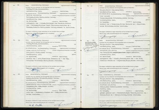 No. 58 Heden zesentwintig februari negentienhonderd vierenzestig verscheen voor mij, ambtenaar van de burgerlijke stand van Amsterdam: o Sondag,Willem,incasseerder, achtenveertig jaar, wonende te Amsterdam, die verklaarde, dat op vierentwintig februari negentienhonderd vierenzestig te 3 dertien uur,dertig minuten, in de gemeente Amsterdam is overleden: Waltmann, Aleida Maria,zonder beroep, o tweeënveertig jaar, geboren, te Rotterdam, wonende te Amsterdam, echtgenote van " Schonk, Ferdinand Jan Theodoor,dochter van : Waltmann,Nicolaas Henri Theodorus,overleden en : Harmsen, Cornelia Maria,zonder beroep,wonende te Amstelveen. De aangever verklaarde uit eigen wetenschap van het overlijden kennis te dragen. Waarvan akte, welk ofereenkomstig de wet is voorgelezen. Lecarou. DSonug No. 61 Heden zesentwintig februari negentienhonderd wetentestig verscheen voor mij, ambtenaar van de burgerlijke stand van Amsterdam: