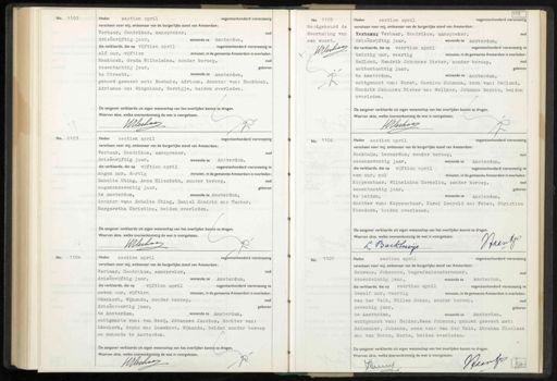 No. 1102 Heden zestien april negentienhonderd vierenzestig verscheen voor mij, ambtenaar van de burgerlijke stand van Amsterdam: Verhaar, Hendrikus, aanspreker, o drieenvijftig jaar, wonende te Amsterdam, die verklaarde, dat op vijftien april negentienhonderd vierenzestig te elf uur, vijftien minuten, in de gemeente Amsterdam is overleden: Mookhoek, Grada Wilhelmina, zonder beroep, oud geboren zesentachtig jaar, wonende te Amsterdam, te Utrecht, gehuwd geweest met: Boshuis, Adriaan, dochter van: Mookhoek, Adrianus en: Wingelaar, Gerrigje, beiden overleden. De aangever verklaarde uit eigen wetenschap van het overlijden kennis te dragen. Waarvan akte, welke overeenkomstig de wet is voorgelezen. Wlerhaan No 15 No. 1105 Goedgekeurd de doorhaling van een woord. Wolerhor 5 Heden zestien april negentienhonderd vierenzestig verscheen voor mij, ambtenaar van de burgerlijke stand van Amsterdam: Fexhauxy Verhaar, Hendrikus, aanspreker, oue drieenvijftig jaar, wonende te Amsterdam, die verklaarde, dat op veertien april negentienhonderd vierenzestig te twintig uur, veertig minuten, in de gemeente Amsterdam is overleden. Heijlond, Hendrik Johannes Pieter, zonder beroep, oud achtentachtig jaar, geboren wonende te Amsterdam, te Amsterdam, echtgenoot van: Worst, Hermina Johanna, zoon van: Heijlond, Hendrik Johannes Pieter en: Wellner, Johanna Sophia, beiden overleden. De aangever verklaarde uit eigen wetenschap van het overlijden kennis te dragen. Waarvan akte, welke overeenkomstig de wet is voorgelezen. WVerhaas No. 1103 Heden zestien april negentienhonderd vierenzestig verscheen voor mij, ambtenaar van de burgerlijke stand van Amsterdam: