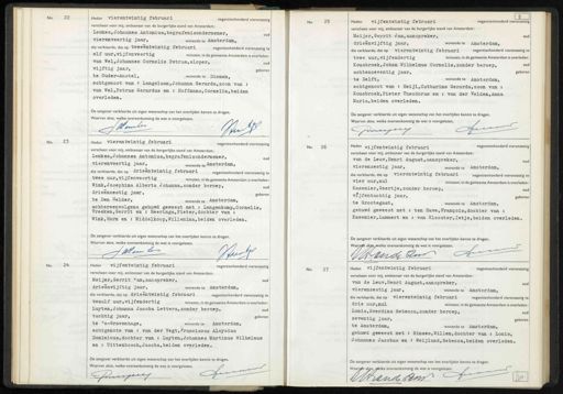 verscheen voor mij, ambtenaar van de burgerlijke stand van Amsterdam: Meijer, Gerrit Jan,aanspreker, oud „ drieënvijftig jaar, wonende te Amsterdam, die verklaarde, dat op vierentwintig februari negentienhonderd vierenzestig te twee uur,vijfendertig minuten, in de gemeente Amsterdam is overleden. oud Kousbroek, Johan Wilhelmus Cornelis,zonder beroep, geboren. achtenzeventig jaar, wonende te Amsterdam, te Delft, echtgenoot van : Heijl, Catharina Gerarda,zoon van : Kousbroek, Pieter Theodorus en : van der Velden,Anna Maria,beiden overleden. De aangever verklaarde uit eigen wetenschap van het overlijden kennis te dragen. Waarvan akte, welke overeenkomstig de wet is voorgelezen, suca Imuyje No. 23. Heden vierentwintig februari negentienhonderd vierenzestig verscheen voor mij, ambtenaar van de burgerlijke stand van Amsterdam: Lemkes, Johannes Antonius,begrafenisondernemer, oud vierenveertig jaar, wonende te Amsterdam, die verklaarde, dat op drieentwintig februari negentienhonderd vierenzestig te twee uur,vijfenveertig minuten, in de gemeente Amsterdam is overleden Wink, Josephina Alberta Johanna,zonder beroep, oud drieënzestig jaar, geboren te Den Helder, wonende te Amsterdam, achtereenvolgens gehuwd geweest met : Langenkamp, Cornelis, Vreeken, Gerrit en : Heeringa,Pieter,dochter van : Wink, Harm en : Middelkoop,Willemina,beiden overleden. De aangever verklaarde uit eigen wetenschap van het overlijden kennis te dragen Waarvan akte, welke overeenkomstig de wet is voorgelezen. Beenk Jaembr 1 No. 26 Heden vijfentwintig februari negentienhonderd vierenzestig verscheen voor mij, ambtenaar van de burgerlijke stand van Amsterdam: