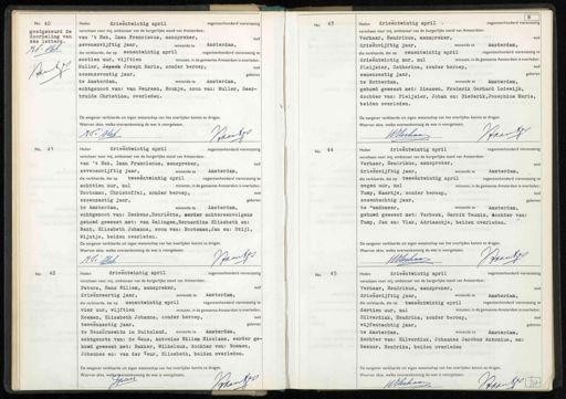 No. 40 goedgekeurd de doorhaling van zes letters. WV. Hteb. Jo Heden drieentwintig april negentienhonderd vierenzestig verscheen voor mij, ambtenaar van de burgerlijke stand van Amsterdam: van 't Hek, Iman Franciscus, aanspreker, oud zevenenvijftig jaar, wonende te Amsterdam, die verklaarde, dat op eenentwintig april negentienhonderd vierenzestig te zestien uur, vijftien minuten, in de gemeente Amsterdam is overleden: Muller, Jepseh Joseph Maria, zonder beroep, oud zesenzeventig jaar, geboren wonende te Amsterdam, te Amsterdam, echtgenoot van: van Deursen, Boukje, zoon van: Muller, Geertruida Christina, overleden. De aangever verklaarde uit eigen wetenschap van het overlijden kennis te dragen. Waarvan akte, welke overeenkomstig de wet is voorgelezen. Baerte N. Het No. 43 Heden drieentwintig april. negentienhonderd vierenzestig verscheen voor mij, ambtenaar van de burgerlijke stand van Amsterdam: oud Verhaar, Hendrikus, aanspreker, drieënvijftig jaar, wonende te Amsterdam, die verklaarde, dat op eenentwintig april negentienhonderd vierenzestig te drieentwintig uur, nul minuten, in de gemeente Amsterdam is overleden Pleijsier, Catharina, zonder beroep, oud geboren eenenzestig jaar, wonende te Amsterdam, x te Rotterdam, gehuwd geweest met: Ziessen, Frederik Gerhard Lodewijk, dochter van: Pleijsier, Johan en: Diederik, Josephina Maria, beiden overleden. De aangever verklaarde uit eigen wetenschap van het overlijden kennis te dragen Waarvan akte, welke overeenkomstig de wet is voorgelezen. Haant WVerhaan No. 41 Heden drieentwintig april negentienhonderd vierenzestig verscheen voor mij, ambtenaar van de burgerlijke stand van Amsterdam: van 't Hek, Iman Franciscus, aanspreker, oud zevenenvijftig jaar,, wonende te Amsterdam, die verklaarde, dat op tweeëntwintig april negentienhonderd vierenzestig te achttien uur, nul minuten, in de gemeente Amsterdam is overleden: Bootsman, Christoffel, zonder beroep, oud zesenzestig jaar, geboren te Amsterdam, wonende te Amsterdam, echtgenoot van: Deekens, Henriette, eerder achtereenvolgens gehuwd geweest met: van Zalingen, Bernardina Elizabeth en: Bant, Elisabeth Johanna, zoon van: Bootsman, Jan en: Stijl, Wijntje, beiden overleden. De aangever verklaarde uit eigen wetenschap van het overlijden kennis te dragen Waarvan akte, welke overeenkomstig de wet is voorgelezen. Baantjs HF: Het No. 44 5 Heden drieentwintig april negentienhonderd vierenzestig verscheen voor mij, ambtenaar van de burgerlijke stand van Amsterdam: Verhaar, Hendrikus, aanspreker, drieenvijftig jaar, wonende te Amsterdam, die verklaarde, dat op tweeëntwintig april negentienhonderd vierenzestig te negen uur, nul minuten, in de gemeente Amsterdam is overleden Tump, Maartje, zonder beroep, „5 zesentachtig jaar, geboren te andsmeer, wonende te Amsterdam. gehuwd geweest met: Verbeek, Gerrit Teunis, dochter van: Tump, Jan en: Vlak, Adriaantje, beiden overleden. De aangever verklaarde uit eigen wetenschap van het overlijden kennis te dragen Waarvan akte, welke overeenkomstig de wet is voorgelezen. Braatz WHerhaar No. 42 negentienhonderd vierenzestig Heden drieëntwintig april verscheen voor mij, ambtenaar van de burgerlijke stand van Amsterdam: Peters, Hans Willem, aanspreker, oud x drieenveertig jaar, wonende te Amsterdam, die verklaarde, dat op eenentwintig april negentienhonderd vierenzestig te vier uur, vijftien minuten, in de gemeente Amsterdam is overleden: Roemen, Elisabeth Johanna, zonder beroep, oud geboren tweeënzestig jaar, te Neusornewitz in Duitsland, wonende te Amsterdam, echtgenote van: de Heus, Antonius Willem Nicolaas, eerder gehuwd geweest met: Bakker, Wilhelmus, dochter van: Roemen, Johannes en: van der Veur, Elisabeth, beiden overleden. De aangever verklaarde uit eigen wetenschap van het overlijden kennis te dragen. Waarvan akte, welke overeenkomstig de wet is voorgelezen. Jrs Vekert No. 45 Heden drieentwintig april negentienhonderd vierenzestig verscheen voor mij, ambtenaar van de burgerlijke stand van Amsterdam: N Verhaar, Hendrikus, aanspreker, oud wonende te Amsterdam, drieënvijftig jaar, die verklaarde, dat op tweeëntwintig april negentienhonderd vierenzestig te 18 dertien uur, nul minuten, in de gemeente Amsterdam is overleden Ou Hilverdink, Hendrika, zonder beroep, geboren vijfentachtig jaar, te Amsterdam, wonende te Amsterdam, dochter van: Hilverdink, Johannes Jacobus Antonius, en: Bezuur, Hendrika, beiden overleden. De aangever verklaarde uit eigen wetenschap van het overlijden kennis te dragen. Waarvan akte, welke overeenkomstig de wet is voorgelezen. WEerhaan 1 1