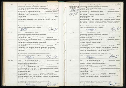 No. 46 Heden drieëntwintig april negentienhonderd vierenzestig verscheen voor mij, ambtenaar van de burgerlijke stand van Amsterdam: van Vuure, Cornelis Jan, begrafenisondernemer, oud zesenvijftig jaar, wonende te Laren in Noord-Holland die verklaarde, dat op eenentwintig april negentienhonderd vierenzestig te negentien uur, nul minuten, in de gemeente Amsterdam is overleden: Timmermans, Akke, zonder beroep, o zestig jaar, geboren te Bussum, wonende te Bussum, dochter van: Timmermans, Dirk en: Nolles, Grietje, beiden overleden. De aangever verklaarde uit eigen wetenschap van het overlijden kennis te dragen. Waarvan akte, welke overeenkomstig de wet is voorgelezen. Codue Buertes M No. 49 een letter. goedgekeurd de doorhaling van Werhan Heden drieentwintig april negentienhonderd vierenzestig verscheen voor mij, ambtenaar van de burgerlijke stand van Amsterdam: oud Verhaar, endrikus, aanspreker, E drieënvijftig jaar, wonende te Amsterdam, die verklaarde, dat op tweeëntwintig april negentienhonderd vierenzestig te drie uur, nul minuten, in de gemeente Amsterdam is overleden: van Brussel, Johannes, zonder beroep, o geboren negenenzeventig jaar, te Amsterdam, wonende te Amsterdam, echtgenoot van: Y van Zanten, Maria Catharina, eerder gehuwd geweest met: Meijjer, Johanna Catharina Elisabeth, zoon van: van Brussel, Johannes en: Harmelink,Anna, beiden overleden. De aangever verklaarde uit eigen wetenschap van het overlijden kennis te dragen. Waarvan akte, welke overeenkomstig de wet is voorgelezen, Baande Wlerhaar No. 47 Heden drieentwintig april negentienhonderd vierenzestig verscheen voor mij, ambtenaar van de burgerlijke stand van Amsterdam: x Verhaar, Hendrikus,aanspreker, oud drieenvijftig jaar, wonende te Amsterdam, die verklaarde, dat op tweeëntwintig april negentienhonderd vierenzestig te een uur, dertig minuten, in de gemeente Amsterdam is overleden: 1 oud Oolbekkink, Johannes Ludovicus Franciscus, zesenzestig jaar, kantoorbediende, geboren te Amsterdam, wonende te Amsterdam, echtgenoot van: Blokker, Grietje, zoon van: Oolbekkink, Johannes Ludovicus Franciscus en: Tier, Anna Maria, beiden overleden. De aangever verklaarde uit eigen wetenschap van het overlijden kennis te dragen. Waarvan akte, welke overeenkomstig de wet is voorgelezen. Brantg WHeihaar No. 50 Heden drieentwintig april negentienhonderd vierenzestig verscheen voor mij ambtenaar van de burgerlijke stand van Amsterdam: Verhaar, Hendrikus, aanspreker, drieenvijftig jaar, wonende te Amsterdam, die verklaarde, dat op tweeëntwintig april negentienhonderd vierenzestig te twee uur, dertig minuten, in de gemeente Amsterdam is overleden. Dijkman, Hendrik, zonder beroep, oud eenenzeventig jaar, geboren. te Groningen, wonende te Amsterdam, echtgenoot van: Elfers, Antonia "endrika,eerder gehuwd geweest met: Nijdam, Frederika, zoon van: Dijkman, Harm en: Hesseling, Popka Berendina, beiden overleden. De aangever verklaarde uit eigen wetenschap van het overlijden kennis te dragen. Waarvan akte, welke overeenkomstig de wet is voorgelezen. Brants WElerhaar No. 48 Heden drieentwintig april negentienhonderd vierenzestig verscheen voor mij, ambtenaar van de burgerlijke stand van Amsterdam: o Verhaar, Hendrikus,aanspreker, drieenvijftig jaar, wonende te Amsterdam, die verklaarde, dat op eenentwintig april negentienhonderd vierenzestig te drieentwintig uur, veertig minuten, in de gemeente Amsterdam is overleden: Stevense, Jan Pieter Marinus, zonder beroep, oud drieëntachtig jaar, geboren: te Amsterdam, wonende te Amsterdam, echtgenoot van: Hoole, Marretje Alida, gehuwd geweest met: de Jong, Murkje, zoon van: Stevense, Cornelis en: Hardenberg,: Jannetje, beiden overleden. De aangever verklaarde uit eigen wetenschap van het overlijden kennis te dragen. Waarvan akte, welke overeenkomstig de wet is voorgelezen. Waan WEerhaar No. 51 Heden drieentwintig april negentienhonderd vierenzestig verscheen voor mij, ambtenaar van de burgerlijke stand van Amsterdam: of Bouwens, Johannes,begrafenisondernemer, oud zesentwintig jaar, wonende te Amsterdam, die verklaarde, dat op tweeëntwintig april negentienhonderd vierenzestig te tien uur, nul minuten, in de gemeente Amsterdam is overleden Goes, Gijsbertus Gerardus, zonder beroep, oud geboren tweeënzeventig jaar, te Amsterdam, wonende te Amsterdam, gehuwd geweest met: Kok, Catharina Maria, zoon van: Goes, Johannes en: Bergman, Helena, beiden overleden. De aangever verklaarde uit eigen wetenschap van het overlijden kennis te dragen Waarvan akte, welke overeenkomstig de wet is voorgelezen. Boert