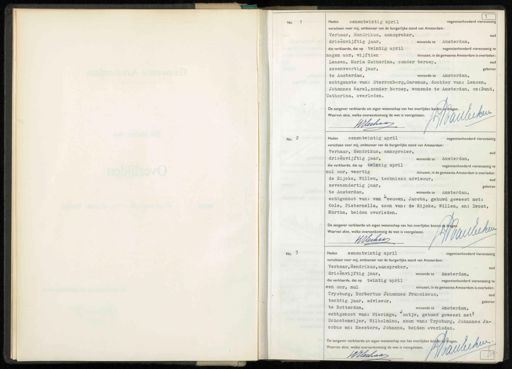 No. Heden eenentwintig april negentienhonderd verenzestig verscheen voor mij, ambtenaar van de burgerlijke stand van Amsterdam: o Verhaar, Hendrikus, aanspreker, drieenvijftig jaar, wonende te Amsterdam, die verklaarde, dat op twintig april negentienhonderd vierenzestig te negen uur, vijftien" minuten, in de gemeente Amsterdam is overleden. Lensen, Maria Catharina, zonder beroep, oud zesenveertig jaar, geboren wonende te Amsterdam, te Amsterdam, echtgenote van: Sterrenberg, Sarenus, dochter van: Lensen, Johannes Larel,zonder beroep, wonende te Amsterdam, en: Band, Catharina, overleden. De aangever verklaarde vit eigen wetenschap van het overlijden keopis te dagen. Jvauleeken Waarvan akte, welke overeenkomstig de wet is voorgelezen, Werharen No. 2 Heden eenentwintig april negentienhonderd vierenzestig verscheen voor mij, ambtenaar van de burgerlijke stand van Amsterdam: Verhaar, Hendrikus, aanspreker,
