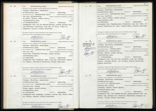 No. 22. Heden tweeëntwintig april negentienhonderd vierenzestig verscheen voor mij, ambtenaar van de burgerlijke stand van Amsterdam: N Verhaar, Hendrikus, aanspreker, oud drieënvijftig jaar, wonende te Amsterdam, die verklaarde, dat op eenentwintig april negentienhonderd vierenzestig te nul uur, vijfenveertig minuten, in de gemeente Amsterdam is overleden: de Vries, Gerrit, zonder beroep, oud vijfenzeventig jaar, geboren te Leeuwarderadeel, wonende te Amsterdam, echtgenoot van: van der Meulen, Grietje, gehuwd geweest met: van Gelderen, Christina, zoon van: de Vries, Frans en: Hiemstra, Sijtske, beiden overleden. De aangever verklaarde uit eigen wetenschap van het overlijden kennis te dragen Waarvan akte, welke overeenkomstig de wet is voorgelezen. Baant Jllerhaa No. 25 Heden tweeëntwintig april negentienhonderd verentegtg Verhaar, endrikus, aanspreker, verscheen voor mij, ambtenaar van de burgerlijke stand van Amsterdam: drieënvijftig jaar, wonende te Amsterdam, die verklaarde, dat op eenentwintig april negentienhonderd vierenzestig t elf uur, vijftien minuten, in de gemeente Amsterdam is overleden Snel, Karel Joseph, zonder beroep, oud geboren negenenzestig jaar, te Amsterdam, wonende te Amsterdam, echtgenoot van: Papenhuijzen, Elizabeth, zoon van: Snel, Johannes Fredericus en: Galo, Johanna Maria, beiden overleden. De aangever verklaarde uit eigen wetenschap van het overlijden kennis te dragen Waarvan akte, welke overeenkomstig de wet is voorgelezen, Gaant Werhaan x No. 23 Heden tweeëntwintig april negentienhonderd vierenzestig verscheen voor mij, ambtenaar van de burgerlijke stand van Amsterdam: oud Verhaar, Hendrikus, aanspreker, drieënvijftig jaar, wonende te Amsterdam, die verklaarde, dat op eenentwintig april negentienhonderd vierenzestig te zes uur, nul minuten, in de gemeente Amsterdam is overleden: Gerritsen, Pernardus Gerardus, zonder beroep, oud achtenzeetig Jaar, werenete Asterdan, geboren te Amsterdam, echtgenoot van: Goedkoop, Sara, zoon van: Gerritsen, Gerrit en: Manuel, Petronella Barendina, beiden overleden. De aangever verklaarde uit eigen wetenschap van het overlijden kennis te dragen Waarvan akte, welke overeenkomstig de wet is voorgelezen. Jants WElerhaan No. 26 goedgekeurd de doorhaling van een woord. WHeshaar Koorf Heden tweeëntwintig april negentienhonderd vierenzestig verscheen voor mij ambtenaar van de burgerlijke stand van Amsterdam: 1e Verhaar, Hendrikus, aanspreker, drieënvijftig jaar, wonende te Amsterdam, die verklaarde, dat op twintig april negentienhonderd vierenzestig t achttien uur, vijfendertig minuten, in de gemeente Amsterdam is overleden o Keizer, Petrus, zonder beroep, geboren vierentachtig jaar, 8 te 's-Gravenhage, wonende te Amsterdam, echtgenoot van: van der Lei, Lieuwkje, zoon van: Keieer Keizer, Johannes Petrus en: Filippo, Helena Geertruida, beiden overleden. De aangever verklaarde uit eigen wetenschap van het overlijden kennis te dragen. Waarvan akte, welke overeenkomstig de wet is voorgelezen. Cbantjs Wlerhaan No. 24 Heden tweeëntwintig april negentienhonderd vierenzestig, verscheen voor mij, ambtenaar van de burgerlijke stand van Amsterdam: Verhaar, Hendrikus, aanspreker, oud drieënvijftig jaar, wonende te Amsterdam, die verklaarde, dat op eenentwintig april negentienhonderd vierenzestig te veertien uur, dertig minuten, in de gemeente Amsterdam is overleden. o Beets, Aagje, zonder beroep, E geboren drieëntachtig jaar, te Oosthuizen, wonende te Amsterdam, echtgenote van: Kamminga, Jacobus, dochter van: Beets, Klaas en: Ubbels, Geertje, beiden overleden. De aangever verklaarde uit eigen wetenschap van het overlijden kennis te dragen. Waarvan akte, welke overeenkomstig de wet is voorgelezen. Vrant WHerhaan No. 27 Heden tweeëntwintig april negentienhonderd vierenzestig verscheen voor mij, ambtenaar van de burgerlijke stand van Amsterdam: Verhaar, Hendrikus, aanspreker, oud drieënvijftig jaar, wonende te Amsterdam, die verklaarde, dat op twintig april negentienhonderd vierenzestig te twintig uur, dertig minuten, in de gemeente Amsterdam is overleden. Canssens, Jakoba, zonder beroep, ex geboren zevenenzeventig jaar, te Groningen, wonende te Amsterdam, echtgenote van: van Leeuwen,Willem, gehuwd geweest met: ten Kaate, Jan, dochter van: Janssens, Henderikus Johannes en: Kuiper, Jacoba, beiden overleden. De aangever verklaarde uit eigen wetenschap van het overlijden kennis te dragen. Waarvan akte, welke overeenkomstig de wet is voorgelezen. Baantr WHerhaan