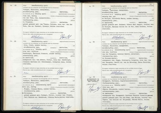 No. 28 Heden tweeëntwintig april negentienhonderd vierenzestig verscheen voor mij, ambtenaar van de burgerlijke stand van Amsterdam: Verhaar, Hendrikus, aanspreker, oud drieenvijftig jaar, wonende te Amsterdam, die verklaarde, dat op twintig april negentienhonderd vierenzestig t tien uur, dertig minuten, in de gemeente Amsterdam is overleden. van der Veen, Jan, huisschilder, o tweeënzestig jaar, geboren te Franeker, wonende te Amsterdam, gehuwd geweest met: van "eenen, Tjitske, zoon van: van der Veen, Jan en: Terwiel, Sjoukje, beiden overleden. De aangever verklaarde uit eigen wetenschap van het overlijden kennis te dragen Waarvan akte, welke overeenkomstig de wet is voorgelezen. Baant WEerhaan No. 31 Heden tweeëntwintig april negentienhonderd vierenzestig verscheen voor mij, ambtenaar van de burgerlijke stand van Amsterdam: Verhaar, endrikus, aanspreker, drieënvijftig jaar, wonende te Amsterdam, die verklaarde, dat op twintig april negentienhonderd vierenzestig teg twintig uur, nul minuten, in de gemeente Amsterdam is overleden. E de Nooijer, Elisabeth Maria, zonder beroep, geboren eenentachtig jaar, te Amsterdam, wonende te Amsterdam, gehuwd geweest met: Bodamer, Robert Emil August, dochter van: de Nooijer, Marinus Gilles en: de Wit, Anna Susanna, beiden: overleden. De aangever verklaarde uit eigen wetenschap van het overlijden kennis te dragen. Waarvan akte, welke overeenkomstig de wet is voorgelezen. Hoed Werhaan No. 29 Heden tweeëntwintig april negentienhonderd vierenzestig verscheen voor mij, ambtenaar van de burgerlijke stand van Amsterdam: Orie, Clara, zonder beroep, oud drieenveertig jaar, wonende te Amsterdam, die verklaarde, dat op twintig april negentienhonderd vierenzestig te vier uur, vijftien minuten, in de gemeente Amsterdam is overleden: Sandbergen, Martinus Johannes, zonder beroep, oud zesentachtig jaar, geboren te Amsterdam, wonende te Amsterdam, echtgenoot van: van Arkens, Tietje, zoon van: Sandbergen, Johannes Martinus en: Schoenmaker, Catharina Anna, beiden overleden. De aangever verklaarde uit eigen wetenschap van het overlijden kennis te dragen Waarvan akte, welke overeenkomstig de wet is voorgelezen. Brart C. Ons No. 32 Heden tweeëntwintig april negentienhonderd vierenzestig verscheen voor mij, ambtenaar van de burgerlijke stand van Amsterdam: Verhaar, Hendrikus, aanspreker, oud drieenvijftig jaar, wonende te Amsterdam, die verklaarde, dat op eenentwintig april negentienhonderd vierenzestig te een uur, vijftien minuten, in de gemeente Amsterdam is overleden oud van der Genugten, Andries Gerrit, metselaar, geboren vierenzestig jaar, te Nieuwer-Amstel, wonende te Amsterdam, echtgenoot van: Rogge, Petronella Cornelia, zoon van: van der Genugten, Gerrit en: van de Wetering, Hanna Hendrika. beiden overleden. De aangever verklaarde uit eigen wetenschap van het overlijden kennis te dragen Waarvan akte, welke overeenkomstig de wet is voorgelezen. Breds Jerhaan No. 30 Heden tweeëntwintig april negentienhonderd vierenzestig verscheen voor mij, ambtenaar van de burgerlijke stand van Amsterdam: N Verhaar, Hendrikus, aanspreker, oud drieenvijftig jaar, wonende te Amsterdam, 1 die verklaarde, dat op eenentwintig april negentienhonderd vierenzestig te drie uur, dertig minuten, in de gemeente Amsterdam is overleden: Franke, Johanna Maria, zonder beroep, oud drieëntachtig jaar, geboren te Hilversum, wonende te Amsterdam, V gehuwd geweest met: Verwaal, Pieter, dochter van: Franke, Carl Hendrik en: Hazebroek, Johanna Maria,beiden overleden. De aangever verklaarde uit eigen wetenschap van het overlijden kennis te dragen. Waarvan akte, welke overeenkomstig de wet is voorgelezen. Brank HHerhaar No. 33 goedgekeurd de doorhaling van zes letters. WHC Boemgen Juet Heden tweeëntwintig april negentienhonderd vierenzestig verscheen voor mij, ambtenaar van de burgerlijke stand van Amsterdam: Boomgaard, Bertinus, begrafenisondernemer, ou vijfenzeventig jaar, wonende te Amsterdam, die verklaarde, dat op twintig april negentienhonderd vierenzestig t tien uur, nul minuten, in de gemeente Amsterdam is overleden o Lagers, Elisabeth, zonder beroep, geboren achtenzeventig jaar, te Amsterdam, wonende te Amsterdam, echtgenote van: Boomgaard, Bertinus Hendrik Cornelis,gheuwd gehuwd geweest met: van der Kemp, Jan Willem, dochter van: Lagers, Jan Gotlieb en: Heijneman, Helena Maria, beiden overleden. De aangever verklaarde uit eigen wetenschap van het overlijden kennis te dragen. Waarvan akte, welke overeenkomstig de wet is voorgelezen. Braatss B H.C Buemgaard