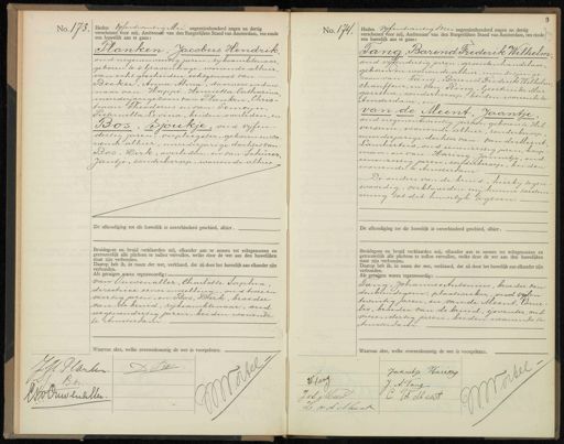 No. 173. Heden Vyfentwintig Mei negentienhonderd negen en dertig verschenen voor mij, Ambtenaar van den Burgerlijken Stand van Amsterdam, ten einde een huwelijk aan te gaan: Slanken, Jacobus Hendrik oud negenenveertig jaren, rijksambtenaar geboren te 's Gravenhage, wonende alhier, van echt gescheiden echtgenoot van Becker, Anna Alma, daarvoor weduw naar van: Happé, Henrietta Catharina meerderjarige zoon van Planken, Chris- tiaan Theodorus en van: Temeyn, Pieternella Levina, beiden overleden, en Bos, Sjoukje, oud vijfen- dertig jaren, verpleegster, geboren en ido nende alhier, meerderjarige dochter van Bos, Dirk, overleden, en van Schurer„ Jantje, zonder beroep, wonende alhier. De afkondiging tot dit huwelijk is onverhinderd geschied, alhier. Bruidegom en bruid verklaarden mij, elkander aan te nemen tot echtgenooten en getrouwelijk alle plichten te zullen vervullen, welke door de wet aan den huwelijken staat zijn verbonden. Daarop heb ik, in naam der wet, verklaard, dat zij door het huwelijk aan elkander zijn verbonden. Als getuigen waren tegenwoordig: van Ouwenaller, Charlotte Sophia„ directrice eener mstelling, oud twee en veertig aren, en Bos, Dirk, broeder van de bruid, rijksambtenaar, oud negenendertig jaren, beiden wonende te Amsterdam Waarvan 2 1 No. 191. Heden Vyfentwintig mer negentienhonderd negen en dertig verschenen voor mij, Ambtenaar van den Burgerlijken Stand van Amsterdam, ten einde een huwelijk aan te gaan: sang Barend Frederik Wilhelm oud vijfendertig jaren, groentenhandelaar geboren en wonende alhier, meerderjarige zoon van: Tang, Barend Frederik Wilhelm chauffeur, en van Ring, Geertruida Mar garetha, zonder beroep, beiden wonende te Amsterdam, en van de Meent Jaantje. oud negenentwintig jaren, geboren te Hil versum, wonende alhier, zonder beroep meerderjarige dochter van: van de Meent Lambertus, oud eenenzestig jaren, koop man, en van: Haring, Jannetje, oud eenenzestig jaren, zonder beroep, beiden wonende te Amsterdam. De ouders van de bruid, hierbij tegen woordig, verklaarden mij hunne toestem ming tot dit huwelijk te geven. De afkondiging tot dit huwelijk is onverhinderd geschied, alhier. Bruidegom en bruid verklaarden mij, elkander aan te nemen tot echtgenooten en getrouwelijk alle plichten te zullen vervullen, welke door de wet aan den huwelijken staat zijn verbonden. Daarop heb ik, in naam der wet, verklaard, dat zij door het huwelijk aan elkander zijn verbonden. Als getuigen waren tegenwoordig: Iang, Johannes Antonius, broeder van den brundegom, plaatwerker, oud vijfen twintig jaren, en van de Meent, Corne lis, broeder van de bruid, ijsventer, oud vierendertig jaren, beiden weonende te Amsterdam.