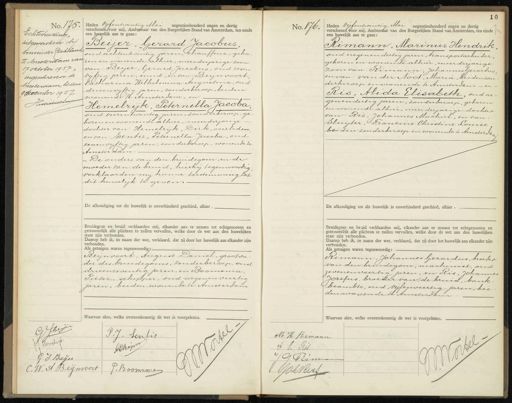 No. 175. No. 175. Echtschuiding uitgesporken bij vonnis der Pechtbank te Amsterdam van 17 October 1957. ingeschreven te Amsterdam, heden 9 december 1957 Hechiden Heden Vyfentwintig Mei negentienhonderd negen en dertig verschenen oor mij, Ambtenaar van den Burgerlijken Stand van Amsterdam, ten einde een huwelijk aan te gaan: Beijer, Gerard Jacobus, oud achtentwintig jaren, chauffeur, gebo ren en wonende alhier, meerderjarige zoon van: Beyer, Gerard Jacobus, oud zesen vyftig jaren, simid, en van: Beijnvoort Catharina Wilhelmina Augustina, oud drieenvijftig jaren, zonder beroep, beiden wonende te Amsterdam, en Hemelrijk, Peternella Jacoba, oud vierentwintig jaren, zonder beroep, ge boren en wonende alhier, meerderjarige. dochter van Hemelrijk, Dirk, overleden en van: Bentis, Peternella Jacoba, oud eenenvyftig jaren, zonder beroep, wonende te Amsterdam. De ouders van den bruidegom, en de moeder van de bruid, hierbij tegenwoordig verklaarden mij hunne toestemming tot dit huwelyk te geven.— De afkondiging tot dit huwelijk is onverhinderd geschied, alhier. Bruidegom en bruid verklaarden mij, elkander aan te nemen tot echtgenooten en getrouwelijk alle plichten te zullen vervullen, welke door de wet aan den huwelijken staat zijn verbonden. Daarop heb ik, in naam der wet, verklaard, dat zij door het huwelijk aan elkander zijn verbonden. Als getuigen waren tegenwoordig: Beijnvoort, August Daniel, groot van der des bruidegoms, zonder beroep, oud drieenzeventig jaren, en BoomsmaPieter, schipper, oud negenenveertig jaren, beiden wonende te Amsterdam Waarvan akte, welke overeenkomstig de wet is voorgelezen No. 176. Heden vyfentwintig Mei negentienhonderd negen en dertig verschenen voor mij, Ambtenaar van den Burgerlijken Stand van Amsterdam, ten einde een huwelijk aan te gaan: Rimann, Marinus Hendrik oud negenendertig jaren, transportarbeider geboren en wonende alhier, meerderjarige zoon van Rimann, Johannes Gerardus en van: van der Noot, Maria, beiden zon derberoep en wonende te Amsterdam - en Ris, Alida Elisabeth, oud ne genendertig jaren, zonder beroep, geboren en wonende alhier, meerderjarige dochter van: Ris, Johannes Machiel, en van: Sluyter, Francine Christine Louise beiden zonder beroep en wonende te Amsterda De afkondiging tot dit huwelijk is onverhinderd geschied, alhier. Bruidegom en bruid verklaarden mij, elkander aan te nemen tot echtgenooten en getrouwelijk alle plichten te zullen vervullen, welke door de wet aan den huwelijken staat zijn verbonden. Daarop heb ik, in naam der wet, verklaard, dat zij door het huwelijk aan elkander zijn verbonden. Als getuigen waren tegenwoordig: Rimanin, Johannes Gerardus, broeder van den bruidegom, machinist, oud zevenenveertig jaren, en Ris, Johannes Jozelus, broeder van de bruid, bank beambte, oud vijfenveertig jaren, bei den wonende te Amsterdam Waarvan akte, welke overeenkomstig is voorgelezen. GHBB id P7 x P.J. Sentis. x A P. J. Memelif aN J J Beijer C.W. A Beijnvoort J. Boomsme M H Rimann e A E. Ris. J/G Rimn BJokvan