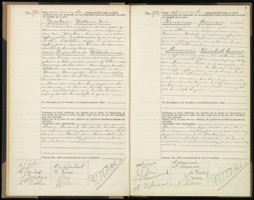 No. 171. Heden vierentwintig Mei negentienhonderd negen en dertig verschenen voor mij, Ambtenaar van den Burgerlijken Stand van Amsterdam, ten einde een huwelijk aan te gaan: Jonker, Willem Jan, oud zesentwintig jaren, onderwijzer, ge„ boren en wonende alhier, meerderjarige zoon van: Jonker, Simon, oud vieren vijftig jaren, hoofdbesteller bij de posterijen en van: Bakker, Sijtje, oud zeven en vijftig jaren, zonder beroep, beiden wo nende te Amsterdam, en van Leijenhorst, Wilhelmina zonder beroep, oud vierentwintig jaren, geboren te Wormerveer, wonende alhier meer derjarige dochter van: van Leijenhorst Willem, oud zesenzestig jaren, en van: Kroon, Hermijntje, oud drieenvijftig jaren, beiden zonder beroep en wonende te Amsterdam. De ouders van den bruidegom en de ouders van de bruid, hierbi tegenwoor- dig, verklaarden mij hunne toestem- ming tot dit huwelijk te geven. De afkondiging tot dit huwelijk is onverhinderd geschied, alhier. Bruidegom en bruid verklaarden mij, elkander aan te nemen tot echtgenooten en getrouwelijk alle plichten te zullen vervullen, welke door de wet aan den huwelijken staat zijn verbonden. Daarop heb ik, in naam der wet, verklaard, dat zij door het huwelijk aan elkander zijn verbonden. Als getuigen waren tegenwoordig: Baaij, Frederik Hendrik, bootbouwer oud zevenendertig jaren, wonende te Hil versum, en Krom, Jan, kantoorbediende oud zevenentwintig jaren, wonende te Amsterdam. Waarvan akte, welke overeenkomstig de wet is voorgelezen. No. 172. Heden vijfentwintig Mei negentienhonderd negen en dertig verschenen voor mij, Ambtenaar van den Burgerlijken Stand van Amsterdam, ten einde een huwelijk aan te gaan: Renema, Herman, oud vier entwintig jaren, chauffeur, geboren en wo nende alhier, meerderjarige zoon van:- Renema, Roelof, oud zevenenvijftig jaren grossier, en van: Dijkman, Aafje, oud zevenenvijftig jaren, zonder beroep, beiden wonende te Amsterdam en Meeuwis, Elisabeth Gesina oud vijfentwintig jaren, zonder beroep, gebo ren en wonende alhier, meerderjarige dochter van Meeuwis, Pieter, oud zestig jaren, ha venarbeider, en van de Hertog, Neeltje. oud vijfenvijftig jaren, zonder beroep, beiden wonende te Amsterdam De ouders van den bruidegom en de ouders van de bruid, hierbij tegenwoordig verklaarden mij hunne toestemming tot dit huwelijk te geven. De afkondiging tot dit huwelijk is onverhinderd geschied, alhier, Bruidegom en bruid verklaarden mij, elkander aan te nemen tot echtgenooten en getrouwelijk alle plichten te zullen vervullen, welke door de wet aan den huwelijken staat zijn verbonden. Daarop heb ik, in naam der wet, verklaard, dat zij door het huwelijk aan elkander zijn verbonden. Als getuigen waren tegenwoordig: Renema, Baukje, zuster van den bruidegom, verpleegster, oud zesentwintig jaren, wonende te Rockanje, en Meeuwis, Neeltje, zuster van de bruid naaster, oud eenentwintig jaren, wonende alhier Waarvan akte, welke overeenkomstig de wet is voorgelezen. W. C. Jonker 1