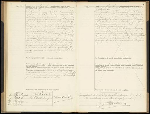 No. 109. Heden een Maart negentienhonderd negen en dertig verschenen voor mij, Ambtenaar van den Burgerlijken Stand van Amsterdam, ten einde een huwelijk aan te gaan: Plantinga Ype diamantslijper geboren te 's Gravenhage, wonende alhier oud vier en twintig jaar. meerderjarige zoon van: Plantinga Sierk overleden en Meijer, Sara zonder beroep wonende te 's Gravenhage en Korper Golda zonder beroep geboren en wonende alhier oud vier en twintig jaar meerderjarige dochter van: Korper Jacob bud GE vijer en vijftig jaar werkman en sach serline oud vier en vijftig jaar, — zonder beroep, beiden wonende alhier. De ouders der bruid verklaarden mi toestemming tot dit huwelijk te geven De moeder des bruidegoms heeft. toestemming verleend bij authentieke akte De afkondiging tot dit huwelijk is onverhinderd geschied, alhier. Bruidegom en bruid verklaarden mij, elkander aan te nemen tot echtgenooten en getrouwelijk alle plichten te zullen vervullen, welke door de wet aan den huwelijken staat zijn verbonden. Daarop heb ik, in naam der wet, verklaard, dat zij door het huwelijk aan elkander zijn verbonden. Als getuigen waren tegenwoordig: Polak, Abraham koopman oud zeven en veertig jaar en Tielenburg Theodoru zwager der bruid, werkman oud zes en dertig jaar, beiden wonende alhier. No.- 100 Heden een Maat verschenen voor mij, Ambtenaar van den Burgerlijken Stand van Amsterdaam, ten einde een huwelijk aan te gaan: Beuse Hendrik kellper geboren te Purmerend, wonende alhier, oud drie en dertig jaar meerderjarige zoon van: Beuse Matthias, zonder beroep wonende te Purmerend en de Plot, Maria Alida, overleden en Steinhauer, Bastiana Maria huishoudster geboren te Zaandam, wonende alhier oud dertig jaar, meer derjarige dochter van: Steinharier Hendrik Johannes en Cuik Maria, beiden zonder beroep en wonende te Roog aan de Zaan. De afkondiging tot dit huwelijk is onverhinderd geschied, alhier. Bruidegom en bruid verklaarden mij, elkander aan te nemen tot echtgenooten en getrouwelijk alle plichten te zullen vervullen, welke door de wet aan den huwelijken staat zijn verbonden. Daarop heb ik, in naam der wet, verklaard, dat zij door het huwelijk aan elkander zijn verbonden. Als getuigen waren tegenwoordig: Waarvan akte, welke over ig de wet is voorge A Palat Plantinga th PielenburgVansoest. G Korpers J Korpen S: Porh Goedgekeurd de doorhaling dezer bladzijde wegens aburiere beschrijving De ambtenaar van den burgerlijken stand, JMMaatien