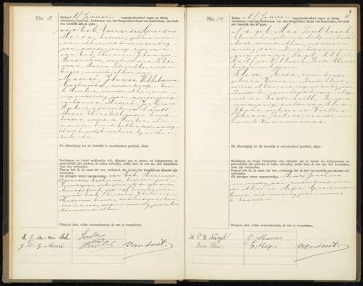 No. 13 Neden elf Januari negentienhonderd negen en dertig verschenen voor mij, Ambtenaar van den Burgerlijken Stand van Amsterdam, ten einde een huwelijk aan te gaan: van Eek Everardus Gerardus Maria, kruier, geboren er wo„ nende alhier oud drie en dertig jaar meerderjarige zoonvar. van Ech Theodorus Johannes Hendrikus overleden en Jeld„ „man, Maria Petronella, zonder beroep, wonende alhier en Misere, Johanna Wilhelmina Geertruida, zonder beroep, geboren- te Heerlen, wonende alhier oud negenentwintig jaar meerderjarige dochter van Miseré Jan Gerard Hubert mijnwerkern Smeets, Maria Elizabeth zonder beroep. beiden wonende te Heerlen, De ouders der bruid hebben toestemming tot dit huwelijk verleend bij authen tieke akte. De afkondiging tot dit huwelijk is onverhinderd geschied, alhier Bruidegom en bruid verklaarden mij, elkander aan te nemen tot echtgenooten en getrouwelijk alle plichten te zullen vervullen, welke door de wet aan den huwelijken staat zijn verbonden. Daarop heb ik, in naam der wet, verklaard, dat zij door het huwelijk aan elkander zijn verbonden. Als getuigen waren tegenwoordig van bek Hendricus Gerardus Anthonius, broeder zes bruidegoms, schriver, bij de rijksierze„ keriagtbank, oud vijf enveertig jaar en van Eck Theodorus Johanres Herdruus, broeder desbruidiganskan„ toorbedierde, ondersenveertig jaar, bei, der wonende alhier Waarvan akte, welke overeenkomstig de wet is voorgelezen. No. 14 Heden elf Januari negentienhonderd negen en dertig 1 verschenen voor mijAmbtenaar van den Burgerlijken Stand van Amsterdam, ten einde een huwelijk aan (te gaan: Nagel, Max Paulbrich kleermaker geboren te stolp in Duitsch „land, wonende alhier, oud zeven en twintig jaar, Zuitscher, meerder jarige zoon van: Aagel Albert Adolf en Willusch Berta Alwing beiden overledenen Klem Rosa, zonder beroep, geboren te Veeren en Duitschland, wonende alhier, oud negenendertig jaar Duitsche, van echtgescheiden echtge„ noote van Kratochwill, Bernard meerderjarige dochter van Rlem Johann overleden en Wortse, Johanna Paulina, naaister wo„ „nende te Veenen voornoemd. De afkondiging tot dit huwelijk is onverhinderd geschied, alhier. Bruidegom en bruid verklaarden mij, elkander aan te nemen tot echtgenooten en getrouwelijk alle plichten te zullen vervullen, welke door de wet aan den huwelijken staat zijn verbonden. Daarop heb ik, in naam der wet, verklaard dat zij door het huwelijk gan elkander zijn. verbonden. Als getuigen waren tegenwoordig: Meurs, Jacob, oud vier enzestig jaar, zonder beroep, wonen de alhier en Meijer, Gerrit zonder beroep, oudzesenzestig jaar, wonende k zaandam Waarvan akte, welke overeenkomstig de wet is voorgelezen. Vant E. G. M. van Eck. Van soest. Nnv Ech J W G Missri J. Meuss. M. P. E. Nagel vansoest. Resa Rlau G Meeer