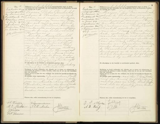 No. 15 No. 15 Echtscheiding uitgesproben bij vonms der Rechtbank ver Haarlem van 4 Juli 1950 ingeschreven, te Amterdam, heten 30 October 1952 HMeuwe Heden zeven en twintig september negentienhonderd negen en dertig verschenen voor mij, Ambtenaar van den Burgerlijken Stand van Amsterdam, ten einde „ een huwelijk aan te gaan: Visser Pieter Cornelis kok geboren te Haarlem, wonende alhier, oud negen en twintig jaar, „ meerderjarige zoon van: Visser Jan oud zestig jaar, -fabrieks. baas en: Heinsius, Adriaantje Pieternella, oud negen en vijftig jaar zonder beroep, beiden wonende te Haarlem en Merkx, Maria Elisabeth zonder beroep, geboren en wonende alhier, oud negen en twintig jaar van echt gescheiden echtgenoote van: Fonhof, Joannis Petrus Maria, meerderjarige dochter van Merkx, Johannes Franciscus werk- man en: Somers Maria Everdina Elisabeth zonder beroep beiden wonende alhier. De ouders des bruide- goms verklaarden mij toestemming tot dit huwelijk te geven. De afkondiging tot dit Huwelijk is onverhinderd geschied, alhier De ouders der bruid hebben toestemming verleend bij authentieke akte Bruidegom en bruid verklaarden mij, elkander aan te nemen tot echtgenooten en getrouwelijk alle plichten te zullen vervullen, welke door de wet aan den huwelijken staat zijn verbonden. Daarop heb ik, in naam der wet, verklaard, dat zij door het huwelijk aan elkander zijn verbonden. Als getuigen waren tegenwoordig: Gaarenstroom Daniel steenhouwer oud negen en dertig jaar en: Merkx, Anna Elisabeth Hendrika, zuster der bruid zonder beroep, oud acht en twintig jaar, beiden wonende alhier. Waarvan akte, welke over No. 16 No. 16 Uebtscheiding uitgesproken bij voerug die Reektbank te Amsterdam van 30 Juni 949 ingeschreven te Vinderdam beden 9 September 949. JR Cumme Heden zeven en twintig september negentienhonderd negen en dertig C verschenen voor mij, Ambtenaar van den Burgerlijken Stand van Amsterdam, ten sinde een huwelijk aan te gaan: Meyer Jan Franciscus verber geboren te Schiedam, wonende alhier, oud negen en twintig jaar meerderjarige zoon van: Meijer Jan Martinus, smid wonende te Oostzaan en: Verheij Cornelia Elisabeth, overleden en van den Berg Anna Lienst- bode, geboren te Hoensbroek wonende alhier, oud drie en twintig jaar, meerderjarige dochter van van den Berg Nicolaas mijn werker en: Garritsen, Wilhelmina zonder beroep, beiden wonende te Hoensbroek. De vader Zes bruidegoms en de ouders der bruid hebben toestemming tot dit huwelijk verleend bij authentieke akten. De afkondiging tot dit huwelijk is onverhinderd geschied, alhier. Bruidegom en bruid verklaarden mij, elkander aan te nemen tot echtgenooten en getrouwelijk alle plichten te zullen vervullen, welke door de wet aan den huwelijken Staat zijn verbonden. Daarop heb ik, in naam der wet, verklaard, dat zij door het huwelijk aan elkander zijn verbonden. Als getuigen waren tegenwoordig: van den Berg Jacobus neef der bruid caféhouder oud veertig jaar en Olij Dirk, chaaffen oud vier en twintig jaar, beiden wonende alhier. Waarvan akte, welke overeenkomstig de wet is voorgelezen. G.C. Visser. d Gaarenstroom M.E. Merlo AEH. Merkx Jleiteer J:. Viner JP Heusius. JooBers J F Meyer d OGg A H Bert A: Certeeg