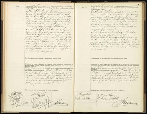 No. 23 Heden acht November negentienhonderdnegen en dertig verschenen voor mij, Ambtenaar van den Burgerlijken Stand van Amsterdam, ten einde een huyelk aan te paan. Mou Gerrit, teekenaar, ge„ boren te Delft, wonende alhier, oud zes en twintig jaar, meerderjarige zoon van: Moll. Rverf oud acht en vijf jaar hoofdopzichter en: Moll Cornelia, oud negen en vyftig jaar, zonder beroep, beiden wonende alhier en van Delft Petronella Agatha zonder berooep, geboren en wonende al„ hier, oud drie en twintig jaar, meerder„ jarige dochter van: van Delft Willem oud zestig jaar, —zonder beroep wonende te Uitgeest en: Lever Petro„ nella Agatha, overleden. De ouders des bruidegoms en de vader der bruid verklaarden mij toestemming tot dit huwelijk te geven De afkondiging tot dit huwelijk is onverhinderd geschied, alhier Bruidegom en bruid verklaarden mij, elkander aan te nemen tot echtgenooten en getrouwelijk alle plichten te zullen vervullen, welke door de wet aan den huwelijken staat zijn verbonden. Daarop heb ik, in naam der wet, verklaard, dat zij door het huwelijk aan elkander zijn. verbonden. Als getuigen waren tegenwoordig: Moll / Riasina Aleida zuster des bruidegoms verpleegster oud zeven en twintig jaar, wonende te Enk„ huizen en van Delft, Willem, broeder der bruid, handels vertegenwoordiger oud dertig jaar, wonende alhier. Waarvan akte, welke overeenkomstig de wet is voorgelezen. No. 24 Heden acht November negentienhonderd negen en dertig verschenen voor mij, Ambtenaar van den Burgerlijken Stand van Amsterdam, ten einde een huwelijk aan te gaan: Copen, Johan handelsreiziger, gebo„ ren en wonende alhier, oud zes en dertig jaar, van echt gescheiden echtgenoot van: Hoepfner, Mathilde Johanna Albertina meerderjarige zoon van Cohen, Samson, overleden, en: van der Hhuis Janna zonder beroep, wo„ nende te Zaandam, en Miller, Martha Milda, zonder beroep geboren te Bottrop in Duitschland, wonende alhier, end zes en twintig jaar, Duitsche meerder„ jarige dochter van: Miller, Kart Max, en: Wappler Milda, beiden zonder beroep en wonende te Bottrop voornoemd. De afkondiging tot dit huwelijk is onverhinderd geschied,-alhier. Bruidegom en bruid verklaarden mij, elkander aan te nemen tot echtgenooten en getrouwelijk alle plichten te zullen vervullen, welke door de wet aan den huwelijken staat zijn verbonden. Daarop heb ik, in naam der wet, verklaard, dat zij door het huwelijk aan elkander zijn verbonden. Als getuigen waren tegenwoordig: van der eer Geertruida barmina, caféhoudster, oud vijf en veertig jaar en Adam Boekholfs Johanna caféhoudster, oud twee en dertig jaar, beiden wonende alhier. Waarvan akte, welke overeenkomstig de wet is voorgelezen. G JKoll. ManteAt