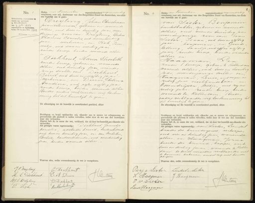 No. Echtschelding ultgesproken bi vonnis der rechtbank „ Amsterdam von 1 Ingeschreven te Amsterdam. heden 16 november 1977 Heden een November negentienhonderd negenendertig verschenen voor mij, Ambtenaar van den Burgerlijken Stand van Amsterdam, ten einde een huwelijk aan te gaan: Dreiling, Johan Christiaan pransstemmer, geboren en wonende alhier, oud twee en twintig jaar meer. derjarige zoon van: Dreyling, Bertus Johannes Cornelis oud vierenveertig jaar. - werkman, en: Kok Fem. metje, oud twee en veertig jaar. zonder beroep beiden wonende alhier en Dickhout Maria Elisabeth zonder beroep, geboren en wonende alhier oud twintig jaar minder jarige dochter van: Dickhout Gerrit oud twee en vijftig jaar. werkman, en Duin Ebelina srendina, oud vijfen viftig jaar zonder beroep beiden wonende alhier Beider ouders verklaarden mij toestem. ming tot dit huwelijk te geven De afkondiging tot dit huwelijk is onverhinderd geschied, alhier. Bruidegom en bruid verklaarden mij, elkander aan te nemen tot echtgenooten en getrouwelijk alle plichten te zullen vervullen, welke door de wet aan den huwelijken staat zijn verbonden. Daarop heb ik, in naam der wet, verklaard, dat zij door het huwelijk aan elkander zijn verbonden. Als getuigen waren tegenwoordig: Dirkhout, Jannetje Cornelia, uster der bruid, kantoorbediende oud twee en twintig jaar en: van Merkelen Bestus, kantoorbediende, oud vierentwintig jaar, beiden wonende alhier. Waarvan akte, welke overeenkomstig de wet is voorgelezen. No. 2 Heden een November negentienhonderd negenendertig verschenen voor mij, Ambtenaar van den Burgerlijken Stand van Amsterdam, ten einde een huwelijk aan te gaan: van Sister Benjamin banketbakker, geboren en wonende alhier oud zeven en twintig Jaar meerderjarige zoon van: van Sister Ssaac, oud twee en vyftig jaar koopman, en Goude„ ketting, Saartje, oud vijf en vijftig jaar, zonder beroep beiden wonende alhier en: Ren Haagman zonder beroep, geboren te Rotterdam wonende alhier, oud twee en twintig jaar meerderjarige dochter van; Haagman, Louis, oud negen en zestig jaar vischhondelaar en Ossendrijver Nietje, oud zeg en zestig jaar. zonder beroep beiden wonende te Rotterdam. Beide ouders verklaarden mij toestemming tot dit huwelyk te geven De afkondiging tot dit huwelijk is onverhinderd geschied, alhier. Bruidegom en bruid verklaarden mij, elkander aan te nemen tot echtgenooten en getrouwelijk alle plichten te zullen vervullen, welke door de wet aan den huwelijken staat zijn verbonden. Daarop heb ik, in naam der wet, verklaard, dat zij door het huwelijk aan elkander zijn verbonden. Als getuigen waren tegenwoordig: van Sister, Leendert broeder des bruidegoms verkooper oud vier en twintig jaar wonende alhier, en: Huagman, Jorcia broeder der bruid, kapper, oud twee en dertig jaar, wonende te rotter dam. De beide moeders verklaarden niet te kunnen teekenen, omdat zij niet kouden schrijven Waarvan akte, welke overeenkomstig de wet is voorgelezen. J.C. Dreijling. G. Diskhauf M. E. Dickhout E. A Duin Oerteeg BJ. C Deijling J.C. Dickkout BaMeikelenJr F. Kok. Leendert & Sister Benj. v. Sister Z Haagman J Haagman J Oentog J v Sster Loun Haagman