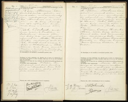 No. 5 No. 5 Echtscheiding uitgesproken) bij vamin der zichtbank te Armtem van 17 Januari 1963, in- geschreven te am„ sterdam, Leden. 6 februari 1963 1 D50 Heden een November negentienhonderd negenendertig verschenen voor mij, Ambtenaar van den Burgerlijken Stand van Amsterdam, ten einde g een huwelijk aan te gaan: Rip, Marinus Jean kantoorbediende, geboren en wo¬ nende alhier oud vierentwintig jaar meerderjarige zoon van Rip, Hermanus oud zestig jaar. en de Jong, Jannetje oud vijf en vijftig jaar- beiden zonder beroep en wonende alhier en Reh Gertrude, zonder beroep, geboren te Quilitten in Duitschland wonende alhier oud dertig jaar, van echtgescheiden eilgenoote van: Mulder Hendrikus Jacobus meerderjarige dochter van Reh Rudolf, smid wonende te Berlijn in Duitschland en Bloek Johanne zonder beroep wonende te Hamborn in Duitschland, De ouders des bruidegoms verklaarden mij toestemming tot dit huwelijk te geven De afkondiging tot dit huwelijk is onverhinderd geschied, alhier Bruidegom en bruid verklaarden mij, elkander aan te nemen tot echtgenooten en getrouwelijk alle plichten te zullen vervullen, welke door de wet aan den huwelijken staat zijn verbonden. Daarop heb ik, in naam der wet, verklaard, dat zij door het huwelijk aan elkander zijn verbonden. Ais getuigen waren tegenwoordig: Klatser Leo folograaf oud drie en twinti jaar en: Broespraat Wem, kund schilder, oud twee en veertig jaar beiden wonende alhier. Waarvan akte, welke overeenkomstig de wet is voorgelezen. No. 6 Heden een November negentienhonderd negenendertig verschenen voor mij, Ambtenaar van den Burgerlijken Stand van Amsterdam, ten einde een huwelijk aan te gaan: de Haan, Nicolaas, hellnen geboren en wonende alhier, oud een en veertig jaar, van echtgeschei den echtgenoot van: Hayck Maria Johanna, meerderjarige zoon van de Haan, Pieter Johannes zonder beroep, wonende alhier, en. Verlee, Johanna Jacoba, over leden. en Jansen, Gezina Hendrika Maria zonder beroep, geboren en wonende alhier oud zevenenveertig jaar meerderjarige dochter van„ Jansen Franciscus Bernardinus Gerardus en Barends Emerentia Jaane Gezina Susanne, beiden overleden. De afkondiging tot dit huwelijk is onverhinderd geschied, alhier Bruidegom en bruid verklaarden mij, elkander aan te nemen tot echtgenooten en getrouwelijk alle plichten te zullen vervullen, welke door de wet aan den huwelijken staat zijn verbonden. Daarop heb ik, in naam der wet, verklaard, dat zij door het huwelijk aan elkander zijn verbonden. Als getuigen waren tegenwoordig: Arends Hendrik zwager des bruidegoms, winkelier oud negen en veertig jaar en Jansen Gerardus Hendrikus Johannes broeder der bruid, magazijnbediende oud twee en dertig jaar beiden wonende alhier Lec Kedtsch M.J. Rijs a