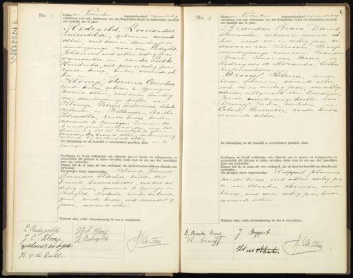 No.7 Heden een November negentienhonderd negenendertig verschenen voor mij, Ambtenaar van den Burgerlijken Stand van Amsterdam, ten Ande een huwelijk aan te gaan: Redegeld Leonardus huisschilder, geboren en wonende alhier, oud twee en twintig aar meerderjarige zoon van Redegeld Johannes, oud acht en zestig jaar ijzerwerker, en, van der Lubbe Hendrika, oud zeven en zestig jaar zonder beroep, beiden wonende al¬ hier en: Klomp, Johanna Cornelia zonder beroep, geboren te Vymegen wonende alhier oud een en twintig jaar meerderjarige dochter van: Klomp, Petrus Antonius, tobaks sosteerder, en: Willemsen Bartha Petronella zonder beroep, beiden wonende te Nijmegen De ouders des bruidegomd verklaarden mij toe stemming tot dit huwelijk te geven. De ouders der bruid hebben toestemming verleend byj authentieke akten De afkondiging tot dit huwelijk is onverhinderd geschied, alhier en te Nymegen. Bruidegom en bruid verklaarden mij, elkander aan te nemen tot echtgenooten en getrouwelijk alle plichten te zullen vervullen, welke door de wet aan den huwelijken staat zijn verbonden. Daarop heb ik, in naam der wet, verklaard, dat zij door het huwelijk aan elkander zijn verbonden. Als getuigen waren tegenwoordig: Klomp, Johannes Gerardus Albertus broeder der bruuid, havenanberder, oud drie en dertig Jaar, wonende te Ainegen en Redegeld, Suberta, zuster des bruide„ goms, zonder beroep oud vierendertig jaar, wonende alhier. Waarvan akte, welke overeenkomstig de wet is voorgelezen. No. 8 Heden een November negentienhonderd negenendertig verschenen voor mij, Ambtenaar van den Burgerlijken Stand van Amsterdam, ten einde een huwelijk aan te gaan: Brandon Bravo David kleermaker geboren en wonende ab¬ hier oud vier en zestig jaar we- diionaar van: Stuiver, Roosje meerderjarige zoon van: Brandon Bravo, Isaan van Noses, en Rodriquer de Miranda Esther beiden overleden Druif Helena zonder beroep, geboren en wonende alhier oud vier en veertig jaar van echtge scheiden, echtgenoote van: Ossedrijver, Jonas meerderjarige dochter van: Druijf, Juda overleden, en: Cohen Henriette, zonder beroep wonende alhier De afkondiging tot dit huwelijk is onverhinderd geschied, alhier. Bruidegom en bruid verklaarden mij, elkander aan te nemen tot echtgenooten en getrouwelijk alle plichten te zullen vervullen, welke door de wet aan den huwelijken staat zijn verbonden. Daarop heb ik, in naam der wet, verklaard, dat zij door het huwelijk aan elkander zijn verbonden. Ais getuigen waren tegenwoordig: Kuppert Johanna zonder beroep, oud acht en veertig jaar en: van Straten, Herman zonder beroep oud zesen zestig jaar beiden wonende alhier L Redegeld JG. A Klomp O J C Klomp A Relegeld Eentee aothanes de bessel Jh v de Lubse Ruppert D. Brandn Bravos H: Druijf J. Oeitee HMrthaker