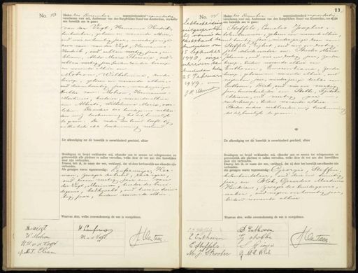 No. 43 Heden zes December negentienhonderd negnendertig verschenen voor mij, Ambtenaar van den Burgerlijken Stand van Amsterdam, teneinde een huwelijk aan te gaan. van der Vegt, Hermanus Hendrik, bankwerker, geboren en wonende alhier. oud vier en twintig jaar, meerderjarige. zoon van: van der Vegt, Hermanus Hendrik, oud acht en veertig jaar, en Eliam, Alida Maria Theresia, oudacht en veertig jaar, beiden zonder beroep en wonende alhier en Mobron, Wilhelmina, zonder beroep, geboren en wonende alhier, oud drie entwintig jaar, meerderjarige dochter van: Mobron, Hermanus Martinus, koetsier, wonende alhier en: Alberts, Wilhelmina Maria, over leden. De ouders des bruidegoms verklaar den mij toestemming tot dit huwelijk te geven. De vader der bruid heeft bij authentieke akte toestemming verleend De afkondiging tot dit huwelijk is onverhinderd geschied, alhier Bruidegom en bruid verklaarden mij, elkander aan te nemen tot echtgenooten en getrouwelijk alle plichten te zullen vervullen, welke door de wet aan den huwelijken staat zijn verbonden. Daarop heb ik, in naam der wet, verklaard, dat zij door het huwelijk aan elkander zijn verbonden. Als getuigen waren tegenwoordig: Lanfermeyer Ker man, zwager der bruid, reiziger oud zesen veertig jaar en van der Vegt, Marinus, broeder des brui degoms, badknecht, oud twee en twintig jaar, beiden wonende alhier Waarvan akte, welke overeenkomstig de wet is voorgelezen. No. 44 Eehtschelding No. uitgesproken bij vornis der Lechtbank te Amterdam van 15 September 11948, ingeschreven te Hmderdam heden 125 Februari 1949 JR Mumn Heden zes December negentienhonderd negenendertig een huwelijk aan te gaan: verschenen voor mij, Ambtenaar van den Burgerlijken Stand van Amsterdam, ten einde Stoffels, Cornelis Josephus, kolentremmer, geboren en wonende alhier oud twintig jaar, minderjarige zoon van: De Stoffels, Eibert, oud één en zestig, jaar, schuitevoerder en: Stroober, Maria Johanna, oud vier en zestig jaar, zonder beroep, beiden wonende alhier en „ Enthoven, Emerentiana, zonder beroep, geborenen wonende alhier, oud negentien Jaar, minderjarige dochter van onthoven, Dirk, oud vier en veertig jaar, bouwvakarbeider en: Stobbe, Tjitske Adriana, oud veertig jaar zonder beroep, beiden wonende alhier Beider ouders verklaarden mij toestemming tot dit huwelijk te geven De afkondiging tot dit huwelijk is onverhinderd geschied, alhier Bruidegom en bruid verklaarden mij, elkander aan te nemen tot echtgenooten en getrouwelijk alle plichten te zullen vervullen, welke door de wet aan den huwelijken staat zijn verbonden. Daarop heb ik, in naam der wet, verklaard, dat zij door het huwelijk aan elkander zijn verbonden. id Als getuigen waren tegenwoordig: Guorgis, Steffen. kolenhandelaar, oud drie en twintig jaar, en Blok, Gerardus Martinus Hendricus, Zwager des bruidegoms, waker oud negen entwintig jaar, beiden wonende alhier. Waarvan akte, welke overeenkomstig de wet is voorgelezen. Pvadege H Lanferine W Mobron M v d Vegt. J Oentien — WU vd Vegt A.M. T. Eliams D Erthoven C.J. Hoffels Tj stobbe E Enthoven Hetees S. Groig is E Staffels G.M.H. Blok M. J. Stroober