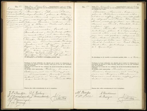 No.51 14O. 31 Echtscheiding. uitgesproken bij vonnis der Rechtbank AAmsterdam van 12 Juni 1908, — ingeschreven te Amsterdam, heden 24 September 1958. Hemilling Heden zes December negentienhonderd negenendertig verschenen voor mij, Ambtenaar van den Burgerlijken Stand van Amsterdam, ten Ande an eret vn Ger Johannes Petrus Brandjes antogeenlasscher, geboren te Velsen wonende alhier, oud negenentwintig jaar, meerderjarige zoon van: Brandjes, Johannes Gerardus, werkman, wonende te Velsen en Oosterwal, Anna Maria, overleden en Timmermeister, Carolina Bernchardina, zonder beroep, geboren en wonende alhier, oud zesentwintig jaar, van echt gescheiden echtgenoote van Hasebos, Hendricus, meerderjarige dochter van Timmermeister Hendricus Jacobus, oud vyftig jaar, metaal slijper, en van de Graaf Janne1 tje oud zevenen veertig jaar, zonder beroep beiden wonende alhier. De ouders der bruid verklaarden mij toestemming tot dit huwelyk te geven. De vader des bruidegoms heeft bij anthen tieke akte toeskmming verleend De afkondiging tot dit huwelijk is onverhindend geschied, alhier. Bruidegom en bruid verklaarden mij, elkander aan te nemen tot echtgenooten en getrouwelijk alle plichten te zullen vervullen, welke door de wet aan den huwelijken staat zijn verbonden. Daarop heb ik, in naam der wet, verklaard, dat zij door het huwelijk aan elkander zijn verbonden. Als getuigen waren tegenwoordig: Hoeting, Zema Catharina, oud vier en twintig jaar en Timmermeister, Jannetje, zuster der bruid, oud één en twintig jaar, beiden zonder beroep en wonende alhier Waarvan akte, welke overeenkomstig de wet is voorgelezen. 52 No. Heden zes December negentienhonderd negenendertig verschenen voor mij, Ambtenaar van den Burgerlijken Stand van Amsterdam, ten einde een huwelijk aan te gaan: Bresser, Marinus, koopman geboren te Rotterdam, wonende alhier oud drie en viftig jaar, van echt geschei den echtgenoot van Hinze, Elise Marie Alwine, meerderjarige zoon van: Bresser Marinus en Smit, Elizabeth, beiden overleden en Soer, Frederika Wilhelmina zonder beroep, geboren te s Gravenhage wonende alhier, oud zeven en veertig jaar, van echt gescheiden echtgenoote van Soer, Martinus JJacobus Bernardus, meerderjarige dochter van: Ioer, Jan Hendrik, overleden en: Eedel Bloedt Hendriekie, zonder beroep, wonende te ’'s Gravenhage De afkondiging tot dit huwelijk is onverhinderd geschied, alhier en te Haallem Bruidegom en bruid verklaarden mij, elkander aan te nemen tot echtgenooten en getrouwelijk alle plichten te zullen vervullen, welke door de wet aan den huwelijken staat zijn verbonden. Daarop heb ik, in naam der wet, verklaard, dat zij door het huwelijk aan elkander zijn verbonden. Als getuigen waren tegenwoordig: Bastiaande Simon, koopman, oud veertig jaar, en Burger, Abraham, koopman, oud tweeen vijftig jaar, beiden wonende alhier Waarvan akte, welke overeenkomstig de wet is voorgelezen. P Brandjes .C. Holting E C Vimmermeister J. Timmerverste d teg N Rnnmempt J. va Jaraaf M Buerser S. Bastiaanse A V H. Voer A. Burger JC Eees