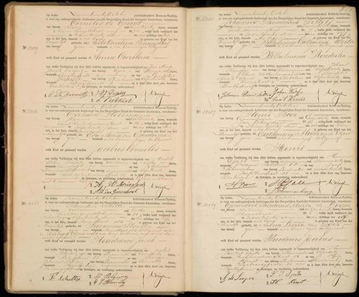No. 12079 Op heden Zevenen twintig October Achttienhonderd Zeven-en-Tachtig, is voor ons ondergeteekende Ambtenaar van den Burgerlijken Stand der Gemeente Amsterdam, verschenen: Cornelis de Groodi van beroep Kruier oud Eenen Veertig Jaren, wonende Nieuwe Spiegelstraat No. 72, welke heeft verklaard dat op Vieren twintig dezer des voormiddags ten zes ure, in het huis, staande als boven is geboren een Kind van het vouwelijk geslacht, uit Antje Carolina Braunsthal van beroep geen wonende als bovenszine Echtgenoot welk Kind zal genaamd worden Anna Carolina van welke Verklaring wij deze Akte hebben opgemaakt in tegenwoordigheid van Jean Maria Joseph Desprez van beroep geen oud Tweeenzestig Jaren, wonende Spiegelgracht en van Sembertus Rikkert van beroep steenhouwen oud vijfentwintig Jaren wonende Spiegelgracht 2 en is deze Akte door ons, benevens Denladeren de Getuigen, na voorlezing onderteekend. b: De Groodtt 2747 Despter Driessen „ No. 12085 Op heden Zevenentwintig October Achttienhonderd Zeven-en-tachtig is voor ons ondergeteekende Ambtenaar van den Burgerlijken Stand der Gemeente Amsterdam, verschenen: Johannes Bernardus Pettel van beroep Timmerman oud zevenentwintig Jaren, wonende Eerste Bloemdwarsstraat No. 7, welke heeft verklaard de op zesentwintig dezer des na middags ten Vij ure, in het huis, staande als boven is geboren een kind van het vouwelijk gesleekt ud wonende als boven vrijne Echtgenoot van beroep geen Wilhelmina Catharina Wertel welk Kind zal genaamd worden Wilhelmina Hendrika van welke Verklaring wij deze Akte hebben opgemaakt in tegenwoordigheid van Jan Karssen van beroep Timmerman oud vijfentwintig Jaren, wonende, Kleine Kattenburgerstraat 40en van Cornelis van ’tKruis van beroep Mitselaar oud vijfentwintig Jaren wonende Keizersstraat 4 en is deze Akte door ons, benevens Den vaderende Getuigen, na voorlezing onderteekend. Jehranna Beind Schter Johan Kari Driessen 30 Van J Kruis No. 12081 Op heden Zevenentwintig Oetber Achttienhonderd teven-en-tachtig is voor ons ondergeteekende Ambtenaar van den Burgerlijken Stand der Gemeente Amsterdam, verschenen: Gerhard Hillmann Van beroep Onperman oud achtendertig Jaren, wonende Tweede Egelantiersdwarsstraat No. 14, welke heeft verklaard dat op vijfentwintig dezer des na middags ten drie ure, in het huis, staande als boven is geboren een Kind van het hannelijk geslacht, uit Eva Mlaria van Goudoever- van beroep geen wonende als bovene zine Echtgenoot welk Kind zal genaamd worden Jacobus Cornelis van welke Verklaring wij deze Akte hebben opgemaakt in tegenwoordigheid van Hendrik Willem Driessen van beroep werkman oud vijftig Jaren, wonende Tuinstraat. 85 en van Antonius Dominicus van Tierenhout van beroep sigarenmaker oud vijfentwintig Jaren, wonende Tweede Egelantensdwarssstaat 27 en is deze Akte door ons, benevens de Getuigen, na voorlezing onderteekend. Delader verklaarde niet te kunnen schrijven 2 H. W. Driessen Driessen 3 A D. van Twienhout No. 12087 Op heden Zevenentwintig October Achttienhonderd Zeven-en-Tachtig is voor ons ondergeteekende Ambtenaar van den Burgerlijken Stand der Gemeente Amsterdam, verschenen: Henri Boer van beroep Commissionair oud Eenendertig Jaren, wonende Jan Steenstraat No. 88, welke heeft verklaard dat op Zevenentwintig dezer des voormiddags ten Vier ure, in het huis, staande als boven9 is geboren een Kind van het kannelijk geslacht, uit Catharina Aloyse van de Vijver van beroep geen wonende als bovene zijn Echtgenoots welk Kind zal genaamd worden Henro van welke Verklaring wij deze Akte hebben opgemaakt in tegenwoordigheid van Hermanus Gall van beroep Timmerman oud zevenendertig Jaren, wonende Ferdinand Bolstraat 85 en van Jan Schoonenberg van beroep Landmeter oud zevenentwintig Jaren wonende Jan Steenstraat 88 en is deze Akte door ons, benevens Den Vaderen de Getuigen, na voorlezing onderteekend. Driesen H Boer: HGale 3 J Schoonenberg No. 12083 Op heden Zevenentwintig Oenber Achttienhonderd Zeven-en-Tachtig „ is voor ons ondergeteekende Ambtenaar van den Burgerlijken Stand der Gemeente Amsterdam, verschenen: Hlorentina Scholtz van beroep roedvrouw oud zestig Jaren, wonende van Oldenbarneveldtstraat No. 83 welke heeft verklaard dat in haar byzyn op vifentwintig dezer des na middags ten Vif ure, in het huis, staande Rozenstraat 153 is geboren een Kind van het bannelijk geslacht, uit Suzanna Stoettie van beroep, geen wonende Rorenstraat 153. Echtgenoot van Nicolaas Wijnanas van beroep werkman, wonende als de mieder afwezend welk Kind zal genaamd worden Hendricus Jacob van welke Verklaring wij deze Akte hebben opgemaakt in tegenwoordigheid van Jacobus Blesing van beroep stgarenmaker oud Vieren eertig Jaren, wonende Palmstraat 82 en van Coeurpad, Johannes Blesing van beroep sigarenmaker oud Tweeendertig Jaren, wonende Hermitiensteeg 3. en is deze Akte door ons, benevens De aangeefster in de Getuigen, na voorlezing onderteekend. Drcessen F Schotten 2 J. Blesing 3 E J Blering No. 12089 Op heden Zevenentwintig Occtober Achttienhonderd Zeven-en-Tachtig is voor ons ondergeteekende Ambtenaar van den Burgerlijken Stand der Gemeente Amsterdam, verschenen: Gerardus Theodorus Maria de Looper van beroep werkman oud achtentwintig Jaren, wonende Harenstraat No. 6, welke heeft verklaard da op zesen twintig dezer des na middags ten elf ure, in het huis, staande als boven is geboren een Kind van het kannelijk geslacht, uit Anna Lucia van Dijch van beroep geen wonende als bovene zine Echtgenoot welk Kind zal genaamd worden Theodorus Jacobus van welke Verklaring wij deze Akte hebben opgemaakt in tegenwoordigheid van Therdouw Jacobus Spitr van beroep schoenmaker oud vijfendertig Jaren, wonende Reguliersdwarsstraat 51 en van Hein pmit van beroep schuitenvoerder oud vierenzeventig Jaren, wonende Lijnbaansgracht 21 en is deze Akte door ons, benevens en Vaderen de Getuigen, na voorlezing onderteekend. Driecsen G de Looper. 2 T I Spitr 3 H Smet