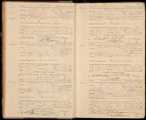 No. 12103 Op heden Zevenentwintig October Achttienhonderd Zeven-en-Tachtig, is voor ons ondergeteekende Ambtenaar van den Burgerlijken Stand der Gemeente Amsterdam, verschenen: van beroep Pieter Coenraad Koh Werkman oud Tweeendertig Jaren, wonende Jacob van Lennepstraat No 29, welke heeft verklaard dat op Vijentwintig dezer des voor middags ten dui ure, in het huis, staande als booen is geboren jeen Kind van het Vouwelijk geslacht, Benjamina Frederica Gerarda Agnes Marinus van beroep geen wonende als boven, zijne Echtgenoot welk kind zal gesmaamd worden Cornelia Alida van welke Verklaring wij deze Akte hebben opgemaakt in tegenwoordigheid van Schad Hoogendorp van beroep Koopman oud vierendertig Jaren, wonendeLuuriergracht 25 en van Maart Jacobus Kruijfhaar van beroep werkman oud Vierentwintig Jaren, wonende Trinsengraat 200 en is deze Akte door ons, benevens Den Vaderen de Getuigen, na voorlezing onderteekend. P C Mook J. Ploogendorg Driessen 3 MJ Kruijstra No. 12100 Op heden Zevenentwintig October Achttienhonderd Zeven-en-Tachtig is voor ons ondergeteekende Ambtenaar van den Burgerlijken Stand der Gemeente Amsterdam, verschenen Simon Lwart van beroep vierman oud vifentwintig Jaren, wonende Vintienstraat No. 66, welke heeft verklaard dat op zesentwintig dezer des na middags ten Een ure, in het huis, staande als boven is geboren een Kind van het Mannelijkgeslacht, uit Susanna Maria de Oos, van beroep geen wonende als boven zijne Echtgenoot welk Kind tal genaamd worden Pieter van welke Verklaring wij deze Akte hebben opgemaakt in tegenwoordigheid van Pieter Zwart van beroep Veer Commissaris oud Vierenzestig Jaren wonende Haarlemmerdijk 26 en van Adtianus Huijboom van beroep schipper oud vieren dertig Jaren, wonende alhier aanboord en is deze Akte door ons, benevens DenVaderen de Getuigen, na voorlezing onderteekend. S Zwart P Zwart Driessen 3 A Huijbeoren No. 12105 Op heden Zevenentwintig October Achttienhonderd Zeven-en-Tachtig is voor ons ondergeteekende Ambtenaar van den Burgerlijken Stand der Gemeente Amsterdam, verschenen: Pieter Karel Tielman van beroep Center oud EenenVeertig Jaren, wonende Egelantiersstraat No. 113, welke heeft verklaard dat op zesen twintig dezer des na middags ten negen ure, in het huis, staande als boven is geboren een kind van het lannelijk geslacht, uit Elida Elisabeth van Goorst van beroep geen wonende als boven zyne Echtgenoot welk Kind zal genaamd worden Pieter Karel van welke Verklaring wij deze Akte hebben opgemaakt in tegenwoordigheid van Adrianus Franciscus van Voorst van beroep Roelenmaker oud zesendertig Jaren, wonende Slootstraat 6 en van Adrianus van Voorst van beroep stoelenmaker oud vierenzestig Jaren, wonende Llootstraat 6 en is deze Akte door ons, benevens zesladeren de Getuigen, na voorlezing onderteekend. G C Tiluir A.F van Voorst Wiceelen 3 A Van Voorst No 12111 Op heden Achtentwintig Octter Achttienhonderd teven-en-Tachtig is voor ons ondergeteekende Ambtenaar van den Burgerlijken Stand der Gemeente Amsterdam, verschenen: Hendrik Matthijs Terstroon van beroep Terkman oud tweeendertig Jaren, wonende Anjeliersstraat No. 147, welke heeft verklaard dat op Vijfentwintig dezer des voormiddags ten Twee ure, in het huis, staande als boven, is geboren een Kind van het Mannelijk geslacht, uit EEverije Konynenberg van beroep geen wonende als boven zine Echtgenoot welk Kind zal genaamd worden Hendrik Matthijs van welke Verklaring wij deze Akte hebben opgemaakt in tegenwoordigheid van Vooris Vreeling van beroep werkman oud dertig Jaren wonende Willemstraat 71 en van Gerrit Hotfels van beroep werkman oud negenenviftig Jaren wonende Luuriergracht 46. en is deze Akte door ons, benevens Senvaderen de Getuigen, na voorlezing onderteekend. H M Eerstrakt J Jous Jleelingk Driessen 3. CA No. 12107 Op heden Zevenentwintig October Achttienhonderd Zeven-en-Tachtig is voor ons ondergeteekende Ambtenaar van den Burgerlijken Stand der Gemeente Amsterdam, verschenen: van beroep Ingenieur oud Enenveertig Jaren, wonende Herman de Kruyf WWesterdokstraat No. 24, welke heeft verklaard dat op zesen twintig dezer des na middags ten dif ure, in het huis, staande als boven is geboren een Kind van het Mannelijk geslacht, uit Clasina Heijnis van beroep geen wonende als boven: zijne Echtgenoot welk Kind zal genaamd worden Herman van welke Verklaring wij deze Akte hebben opgemaakt in tegenwoordigheid van Jacetus woeland de kruij van beroep Directeur oud drieendeertig Jaren, wonende vossirgttraat 7. en van Johan Pieter van beroep Commissionair oud negenenveertig Jaren, Twelo wonende Heerengracht 592 en is deze Akte door ous, benevens Den Vaderen de Getuigen na voorlezing onderteekend. Driessen 2 G Rde Kruijk 1 JdeKruijg Daarlott No. 12113 Op heden Achtentwintig October Achttienhonderd Zeventen-Tachtig „ is voor ons ondergeteekende Ambtenaar van den Burgerlijken Stand der Gemeente Amsterdam, verschenen: Pauline Albertine Pietersen van beroep geen oud negentien Jaren Jaren, wonende Jan Steenstraat No.49, welke heeft verklaard dat des middags ten ure, in het huis, staande bij deze te erkennen is geboren een kind van het Mannelijk geslacht, ui Geboren alhier op veertien December achttienton van beroep derd vifentachtig en wonende ingeschreven in het geboorte register van dat Jaar, nummer Elf folio honderd vyfenzestig verso onder de namen van Joseph Paul, als kind van Pauline Albertine Pietersen vekVind ial geraamd verder van welke Verklaring wij deze Akte hebben opgemaakt in tegenwoordigheid van Johan Bapte Bergamin van beroep Agent oud drieen veertig Jaren, wonende Frans Halsstraat48 en van Karel Lucas Colpaar van beroep Bediende oud drieen Veertig Jaren, wonende Prinsenhofstueg 1 en is deze Akte door ons, benevens de Comparante en de Getuigen, na voorlezing onderteekend. De doorhaling van Eenen twintig gedreckti woorden goedgegeugd J A Pieterie JW. Bergamin Driesse 3 KL Colpaye