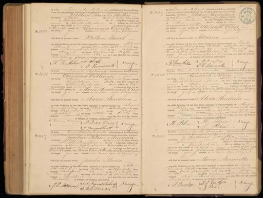 227 op Heden des voor middags ten Een ure, in het huis, staande als boven is geboren een Kind van het vouwelijk geslacht, uit Elizabeth Vonh van beroepgeen wonende als boven: zijne Echtgenoot welk kind zal genaamd worden Adriana van welke Verklaring wij deze Akte hebben opgemaakt in tegenwoordigheid van Dirk vlervander dezong van beroep Besteller oud achtentwintig Jaren, wonende Marnerstraat 99 en van Bernard Hendrik Wehmuller van beroep werkman oud zestig Jaren, wonende Derde Leliedwarsstraat 2 en is deze Akte door ons, benevens Den Vader en de Getuigen, na voorlezing onderteekend 2 D.A de Jonz Driessen WHleemstluk BH: Wekmulle No. 14325 Op heden Drieen twintig December Achttienhonderd Zeven-en-Tachtig is voor ons ondergeteekende Ambtenaar van den Burgerlijken Stand der Gemeente Amsterdam, verschenen: Cenraad Collewyn van beroep Stoker oud negenenveertig Jaren, wonende Sigchelstraat No. 21, welke heeft verklaard dat opTweeentwintig dezer des na middags ten negen ure, in het huis, staande als boven is geboren een Kind van het Vrouwelijk geslacht, uit Maria Hendrina de Vries van beroep geen wonende als boven, zijne Echtgenoots welk Kind zal genaamd worden Maria Hendrina van welke Verklaring wij deze Akte hebben opgemaakt in tegenwoordigheid van Johannes Pranciscus de Vries van beroep stoker oud achtentwintig Jaren wonende sigchelstraat 26 en van Johannes Jongebloet van beroep stoker oud veertig Jaren, wonende Boerensteeg 13 en is deze Akte door ous, benevens de Getuigen, na voorlezing onderteekend De Vader verklaarde niet te kunnen schrijven 2 P Foke Vius Driessen 3 a Jongebloet No. 14331 Op heden Drieentwintig December Achttienhonderd Zeven-en-Tachtig is voor ons ondergeteekende Ambtenaar van den Burgerlijken Stand der Gemeente Amsterdam, verschenen: Hendrik Blom van beroep Timmerman oud achtentwintig Jaren, wonende Eerste Weteringdwarsstraat No. 44, welke heeft verklaard dat op Heden des voor Middags ten negen ure, in het huis, staande als boven is geboren een Kind van het Vrouwelik geslacht, uit Jacoba Johanna Wilhelmina Van Melsen van beroep geen wonende als boven zijne Echtgenoot welk Kind zal genaamd worden Alida Hendrika van welke Verklaring wij deze Akte hebben opgemaakt in tegenwoordigheid van Hendrik Blom van beroep Timmermandd zesenzestig Jaren wonende Tokke Siminszstraat 47 en van Johannes Blom van beroep Timmerman oud zesentwintig Jaren, wonende Tokke Siminsrstraat 47 en is deze Akte door ons, benevens Den Vaderen de Getuigen, na voorlezing onderteekend. Driessen H. Blom H: Blom of 3 P. Blom. No. 14327 Op heden Drieentwintig December Achttienhonderd Zeven-en-Tachtig is voor ons ondergeteekende Ambtenaar van den Burgerlijken Stand der Gemeente Amsterdam, verschenen Jacobus Petrus Meerman- van beroep werkman oud zevenendertig Jaren, wonende Albert Cuijpstraat No. 91, welke Heeft verklaard da op Tweeentwintig dezer hes voormiddags ten acht ure, in het huis, staande als boven is geboren een Kind van het Vrouwelijk geslacht, uit Anna Charlotte Maria Kwinkelenberg van beroep geen wonende als boven: zijne Echtgenoot welk Kind zal genaamd worden Jacoba Maria van welke Verklaring wij deze Akte hebben opgemaakt in tegenwoordigheid van Antons Kwintielenting van beroep Koetsier oud vijfendertig Jaren wonende Kerkstraat 53. en van Arnoldus Meerman van beroep werkman oud drieendertig Jaren, wonende Spuistraat 19 en is deze Akte door ond, benevens LenVaderen de Getuigen, na voorlezing onderteekend. Drcessen J.P. Muiman 2 CC Kwinkelenberg 3 AMeltman, No 14333 Op heden Drieentwintig December Achttienhonderd Zeven-en-Tachtig is voor ons ondergeteekende Ambtenaar van den Burgerlijken Stand der Gemeente Amsterdam, verschenen: Andries Dorstijn van beroep Werkman oud negenentwintig Jaren, wonende Elandsgracht No 98, welke heeft verklaard dat op Tweeentwintig dezer — des na middags ten Vier ure, in het huis, staande als bovendingt is geboren een Kind van het Vrouwelijk geslacht, uit Johanna Wilhelmina Smit van beroep geen wonende als boven zijne Echtgenoot welk Kind zal genaamd worden Maria Margaretha van welke Verklaring wij deze Akte hebben opgemaakt in tegenwoordigheid van Isaad Leendert Dirstijn van beroep stukadoor oud zesentwintig Jaren, wonende Oude Looiersstraat 44 en van Jan Oos van beroep werkman oud vierenveertig Jaren wonende Sastierdestraat 61 en is deze Akte door ons, benevens Den Vadtigen de Getuigen, na voorlezing onderteekend A Dorstyn 2J L Dor Hijn Driessen J Vos