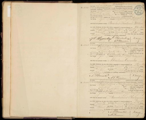 No. 12001 B. H Scholt Eerste Blad. Op heden Vijfentwintig Octoter Achttienhonderd Zeven-en-Tachtig, is voor ons ondergeteekende Ambtenaar van den Burgerlijken Stand der Gemeente Amsterdam, verschenen: Jacobus Cornelis Kloppenburg van beroep werkman oud drieen dertig Jaren, wonende 1 Elandstraat No. 160 welke heeft verklaard de5 op Tweeentwintig dezer des na middags ten Elf urte ure, in het huis, staande Vals boven is geboren een Kind van het Mannelijk geslacht, uit Johanna Jacomina Toepnel van beroep geen wonende als boven zijne Echtgenoot welk kind zal genaamd worden Paulus Frederik Willem van welke Verklaring wij deze Akte hebben opgemaakt in tegenwoordigheid van Christiaa Schuilenburg van beroep werkman oud Veertig Jaren wonende Elandstraat 160 en van Everst Jan Jolman van beroep Kantoorbediende oud dertig Jaren, wonendeBloedstraat 21 en is deze Akte door ons, benevens Den vaderen de Getuigen, na voorlezing onderteekend. J C Klopperbuorg Schuilenburg Duessen E:J. Palman No. 12003 Op heden Vijfentwintig Oetber Achttienhonderd Zeven-en-Tachtig, is voor ons ondergeteekende Ambtenaar van den Burgerlijken Stand der Gemeente Amsterdam, verschenen. Cornelis Permantie van beroep Brandwacht oud Eenenveertig Jaren, wonende Tiienstraat No. 62, welke heeft verklaard dat op Drieen twintig dezer des namiddags ten twee ure, in het huis, staande als boven, is geboren een Kind van het Mannelik geslacht, uit Gertrudis Engelen van beroep geen wonende als bovene zijne Echtgenoot welk Kind zal genaamd worden Abraham Cornelis van welke Verklaring wij deze Akte hebben opgemaakt in tegenwoordigheid van Hendriki Philipmus Kornman van beroep schoenmaker oud Tweeenveertig Jaren, wonende Tuinstraat 62 en van ndreas Christicn lansen van beroep Brandwacht oud drieenveertig Jaren, wonende Binnen Wieringerstraat en is deze Akte door ons, benevens Den vaderen en den Getuigen, na voorlezing onderteekend. De Eerste getuige verklaar niet te kunnen schrijver Drieesen PPermantie 3 A b Hansen. No. 1200 Op heden Vifentwintig October Achttienhonderd teven-en-Tachtig, s voor ons ondergeteekende Ambtenaar van den Burgerlijken Stand der Gemeente Amsterdam, verschenen Hendrikus Philippus Kornina van beroep schanmaker oud Tweeenveertig Jaren, wonende Tuinstraat No 61, welke heeft verklaard da Drieentwintig dezer desna middags ten drie ure, in het huis, staande als boven is geboren een Kind van het Mannelijk geslacht, uit Catharina Margaretha Klingenbe van beroep geen wonende als boven; zijne Echtgenoop welk Kind zal genaamd worden Hendricus Philippus van welke Verklaring wij deze Akte hebben opgemaakt in tegenwoordigheid van Corneli Permentie van beroep Biandwacht oud Eenen veertig Jaren. wonende Tuinstraat 62 en van Andreas Christe Hansen van beroep Brandwacht oud drieenveertig Jaren, wonende Binnen Wieringerstraat 4 en is deze Akte door ops, benevens de Getuigen na voorlezing onderteekend. De Vader verklaarde nu te kunnen schrijven 2 CSOrmantie Driest 3. AC Hansen