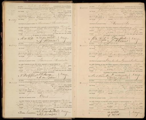 No. 12007 Op heden Vyfen twintig October Achttienhonderd Zeven-en-Tachtig, is voor ons ondergeteekende Ambtenaar van den Burgerlijken Stand der Gemeente Amsterdam, verschenen: Hendrocus de Wit van beroep Timmerman oud drieentwintig Jaren, wonende Luurierstraat No. 95, welke heeft verklaard dat op Vijfen twintig dezer des voormiddags ten tien ure, in het huis, staande als boven is geboren een Kind van het llannelijk geslacht, uit Gerridina Zubberts van beroep geen wonende als boven zijne Echtgenoot welk Kind zal genaand worden Marinus Hendricus van welke Verklaring wij deze Akte hebben opgemaakt in tegenwoordigheid van Hendricus de Uit van beroep werkman oud drieenzestig Jaren, wonende Bloemstraat 10 en van Janj Fledderus- van beroep Timmerman oud vierendertig Jaren, wonende Luuriergracht 120 en is deze Akte door ons, benevens Den vaderende Getuigen, na voorlezing onderteekend. H de Wet H De Wit Driessen vus No. 12013 Op heden Vijfentwintig Occtober Achttienhonderd Zeven-en-Tachtig is voor ons ondergeteekende Ambtenaar van den Burgerlijken Stand der Gemeente Amsterdam, verschenen: Cornelis van Rossen van beroep Boekbinder oud negenentwintig Jaren, wonende Marnixkade, Noo 68, welke heeft verklaard dat op Drieentwintig dezer des middags ten Twaalf ure, in het huis, staande als boven is geboren een kind van het vouwelik geslacht, uit Margaretha Schoemaher van beroep geen wonende als bouwe zine Echtgenoot welk Kind zal genaamd worden Hermijntje van welke Verklaring wij deze Akte hebben opgemaakt in tegenwoordigheid van Fanciscus van Rossen van beroep Boekhandelaaroud vijfenvijftig Jaren, wonende Heerengrooht 281 en van Jan Kleever van beroep Bichbender oud drie en vijftig Jaren wonende Egelantiersgracht 110 — en is deze Akte door ons, benevens Den vader en de Getuigen, na voorlezing onderteekend AC van Posser P: van Rossen Driessen 3 J. Kleevers No. 12009 Op heden Vifentwintig October Achttienhonderd Zeven-en-Tachtig, is voor ons ondergeteekende Ambtenaar van den Burgerlijken Stand der Gemeente Amsterdam, verschenen: Koenraad Wolfters van beroep Agent van Politie oud vijfenveertig Jaren, wonende Ratelwachtsteeg N. 113, welke heeft verklaard dat op Vierentwintig dezer des voormiddags ten zes ure, in het huis, staande als boven is geboren een Kind van het Vrouwelijk geslacht, uit Susanna Hendrika Kruijt van beroep geen wonende als bovens zijne Echtgenoot welk Kind zal genaamd worden Susanna Hendrika van welke Verklaring wij deze Akte hebben opgemaakt in tegenwoordigheid van Petrus Hendricus Marnes van beroep Agentvan portie oud zesendertig Jaren, wonende Tuinstraat 24, en van Hendricus van Speren van beroep Agentvan poliko oud negenentwintig Jaren, wonende ela Costakade83 en is deze Akte door ons, benevens Dena deren de Getuigen, na voorlezing onderteekend. Driessen K Wol Cers P.H Mannes 3 H van Speeren No. 12015 Op heden Vifentwintig October Achttienhonderd Zesen-en-Tachtig, is voor ons ondergetegkende Ambtenaar van den Burgerlijken Stand der Gemeente Amsterdam, verschenen: Idrianus van der Kwast van beroep Behanger oud negenendertig Jaren, wonende Kerkstraat No. 204, welke heeft verklaard dat op Vierentwintig dezer des voor middags ten acht ure, in het huis, staande als booef, iis geboren een Kind van het Vrouwelijk geslacht, uit Constantina Gerarda Catharina Zalms van beroep geen wonende als bovens zijne Echtgenoot welk Kind zal genaamd worden Constantina Gerarda Catharinu van welke Verklaring wij deze Akte hebben opgemaakt in tegenwoordigheid van Willem vander Kwas van beroep Ambtenaar oud drieendertig Jaren, wonende Gerard Doustraat 216 en van Willem Jan Nagelvoort van beroep winkelier oud Tweeenvyftig Jaren, wonende Leidschestraat 50 en is deze Akte door ons, benevens Den Vaderen de Getuigen, na voorlezing onderteekend. Driessen A vd Kwagt W. ookwart WJ Nagelvoort No. 12011 Op heden Vifentwintig October Achttienhonderd Zeven-en-Tachtig is voor ons ondergeteekende Ambtenaar van den Burgerlijken Stand der Gemeente Amsterdam, verschenen Dirk van Leuiven van beroep werkman oud Eenen dertig Jaren, wonende Rerenstraat No. 196, welke heeft verklaard dat op Heden des voormiddags ten acht ure, in het huis, staande als bozen, is geboren een Kind, van het hannelijk geslacht, uit Alida Maria Hambach van beroep geen wonende als boven, zijne Echtgeniot welk Kind zal genaamd worden Dirk van welke Verklaring wij deze Akte hebben opgemaakt in tegenwoordigheid van Christiaan Adrianus van der Poel van beroep werkman oud drie entwintig Jaren wonende Laurierstraat 124 en van Pieter Lavinus Lodewijks van beroep Vergulder oud drieentwintig Jaren wonende Rorenstraat 211 en is deze Akte door ons, benevens senVaderen de Getuigen, na voorlezing onderteekend 126 A van der Poel Driessen 1 D: van Leuwen. 3 P L. Ledewijks No. 1201 Op heden zesentwintig October Achttienhonderd Zeven-en-achtig is voor ons ondergeteekende Ambtenaar van den Burgerlijken Stand der Gemeente Amsterdam, verschenen: Nicolaas van Eijseldyk van beroep werkman oud vierenveertig Jaren, wonende Rozenstraatt No. 92, welke heert verklaard dat op Drie en twintig dezer des voormiddags ten drie ure, in het huis, staande als boven is geboren een Kind van het Vrouwelijk geslacht, uit Peternella Gerrits van beroep geen wonende als bouw zijne Echtgenoot welk Kind zal genaamd worden Jacoba Susanna van welke Verklaring wij deze Akte hebben opgemaakt in tegenwoordigheid van Nicolaas Kirstein van beroep Geen oud zeventig Jaren, wonende Plantage Muidergracht 112 en van Lambertus Beitzel van beroep werkman oud vierenveertig Jaren, wonende Goudsbloemstraat 145 en is deze Akte door ons, benevens de Getuigen, na voorlezing onderteekend. De lader verklaarde niet tehunnen schrijven 2. Cinxtein Driesse 3 C Nutza