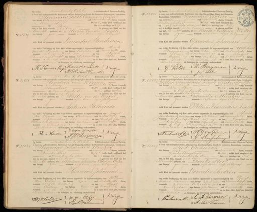 No. 12019 Op heden zesentwintig October Achttienhonderd Zeven-en-Tachtig is voor ons ondergeteekende Ambtenaar van den Burgerlijken Stand der Gemeente Amsterdam, verschenen: Henricus Jacob Canne Meijer van beroep Timmerman oud negenentwintig Jaren, wonende Marnixstraat No. 193, welke heeft verklaard dat Heden des voormiddags ten Vijf ure, in het huis, staande als boven is geboren een Kind van het Mannelijk geslacht, uit Maria van der Linde van beroep geen wonende als boven, zijne Echtgenoot welk Kind zal genaamd worden Leonardus Hendricus.van welke Verklaring wij deze Akte hebben opgemaakt in tegenwoordigheid van Hendrik van der Linde van beroep schilder oud zevenenviftig Jaren, wonende Anjeliersstraat 25 en van Hendrik homas van Munster van beroep Tabakswerker oud vijftig Jaren, wonende Marnenstraat 193 en is deze Akte door ons, benevens DenVader en de Getuigen, na voorlezing onderteekend. H vander Linde Driessen H HCanne Meijer Htle Jan Renster No. 12025 Op heden Zesentwintig October Achttienhonderd Zeven-en-Tachtig, is voor ons ondergeteekende Ambtenaar van den Burgerlijken Stand der Gemeente Amsterdam, verschenen: Gerardus, Pootiervan beroep Timmerman oud vijfentwintig Jaren, wonende 1501n Bilderdijkstraat No. 99 welke heeft verklaard dat. 2 1 op vijfentwintig dezer des voor middags ten Vyf ure, in het huis, staande als boven, is geboren een Kind van het Mannelijk geslacht, uit Maria Antonia Wettig van beroep geen wonende als boven zijne Echtgenoot welk Kind zal genaamd worden Gerardus Johannes van welke Verklaring wij deze Akte hebben opgemaakt in tegenwoordigheid van Wilhelmu Brugman — van beroep schoenmaker oud zesendertig Jaren wonende Nieuwe Zyds voorburgwal 90 en van Johannes Bakker van beroep werkman oud zesendertig Jaren wonende Dirk van Hasseltsteeg 28 en is deze Akte door ons, benevens Den vaderen de Getuigen, na voorlezing onderteekend. G. Violier 2 W. Brugman Driessen Jakker No. 12.021 Op heden Zesentwintig Oetster Achttienhonderd Zoven-en-Tachtig is voor ons ondergeteekende Ambtenaar van den Burgerlijken Stand der Gemeente Amsterdam, verschenen Hendrik van Werven van beroep werkman oud vierentwintig Jaren, wonende Bloemstraat No. 111, welke heeft verklaard dat op Drie en twintig dezer des na middags ten drie ure, in het huis, staande als boven is geboren een Kind van het Vrouwelyk geslacht, uit Hiltje van der Geestvan beroep geen wonende als boven zyne chtgenoot welk Kind zal genaamd worden Antonia Hillegonda van welke Verklaring wij deze Akte hebben opgemaakt in tegenwoordigheid van Jannes van Werven van beroep werkman oud achten vijftig Jaren, wonende Bloemstraat 185 en van Hendrik Jan Willem Susanna van beroep werkman oud Tweeen vijftig Jaren, wonende Elandsgracht 99 en is deze Akte door ons, benevens Den Vaderen de Getuigen, na voorlezing onderteekend. H. v. Werven 2 J van Werven Driecsen HJW Susanna No. 12027 Op heden Zesentwintig October Achttienhonderd zeven-en-Tachtig 4 is voor ons ondergeteekende Ambtenaar van den Burgerlijken Stand der Gemeente, Amsterdam, verschenen Willem Franciscus Joseph Trubendorf Ver van beroep Bediende oud drieentwintig Jaren wonende Bloemstraat No. 33, welke heeft verklaard dat op Vijf en twintig dezer des na middags ten Vijf ure, in het huis, staande als boven, is geboren een Kind van het Mannelik geslacht, uit Barendje Mombers van beroep geen wonende als boven zijne Echtgenot welk Kind zal genaamd worden Willem Franciscus Joseph van welke Verklaring wij deze Akte hebben opgemaakt in tegenwoordigheid van Hendrik Jacobus van Greuningen van beroep werkman oud negenendertig Jaren wonende Anjeliersstraat 107 en van Gerardus Hesseling van beroep Koperslager oud Tweeen veertig Jaren, wonende Nieuwe Nieuwstraat 13 en is deze Akte door ons, benevens Den Vaderen de Getuigen, na voorlezing onderteekend. Dreessen Trerbensertseg H: J Van Greeningin 3 G Hesseling No. 12023 Op heden Zesentwintig October Achttienhonderd Zeven-en-Tachtig is voor ons ondergeteekende Ambtenaar van den Burgerlijken Stand der Gemeente Amsterdam, verschenen: Henricus Johannes Wessels van beroep Handelaar oud negenentwintig Jaren, wonende Bomolen Straat No. 19, welke heeft verklaard dat op Vieren twintig dezer des na middags ten Zeven ure, in het huis, staande als boven is geboren een Kind van het llannelijk geslacht, uit Alberdina Johanna Ciiza van Essen van beroep geen wonende als boven, zijne Echtgenoot welk Kind zal genaamd worden Henricus Johannes van welke Verklaring wij deze Akte hebben opgemaakt in tegenwoordigheid van Willem van Eessen van beroep Geen oud zesenzestig Jaren, wonende als de Oudersg en van Event van Oostveen van beroep geen oud zesenVeertig Jaren, wonende als de Ouders 9 en is deze Akte door ens, benevens Den vaderen de Getuigen, na voorlezing onderteekend. Driessen WJ Weele W van Elfer 3 En Oostven No. 12029 Op heden Zesentwintig October Achttienhonderd Zeven-en-Tachtig is voor ons ondergeteekende Ambtenaar van den Burgerlijken Stand der Gemeente Amsterdam, verschenen: Piet Cahuzak van beroep Werkman oud drie en dertig Jaren, wonende Goudsbloemstraat No. 130, welke heeft verklaard dat op zesentwintig dezer des voor middags ten zes ure, in het huis, staande als boven is geboren een Kind van het Mannelijk geslacht, uit Doortje Sloot van beroep geen wonende als boven zijne Echtgenoot welk Kind zal genaamd worden Cornelis Andries van welke Verklaring wij deze Akte hebben opgemaakt in tegenwoordigheid van Cornelis Andries Purmer van beroep werkman oud zevenentwintig Jaren wonende Niuwe Leliestraat 148 en van Adrianus van Viersen van beroep werkman oud drieendertig Jaren wonende Goudsbloemstraat 130 en is deze Akte doorons, beneven Lentaderen de Getuigen, na voorlezing onderteekend. Driesse Cnhrezak. HC Nourmer 3 A. Van Viersen