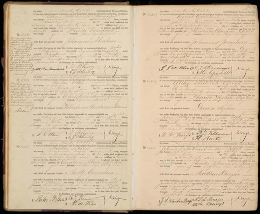 .12031 Dit kindisden Dirk Justenus Alexander van der Koppel, in Leentje Cornwall volgens uittreksel uit het huwelyks register der gemeente. Nieuwer amstel bij huwelyk aldaar tusschen hen vilek. ken op 6 October. 1806 drie ennegentig voor het hunne erktug 1800 drie en negentig. Amsterdam 1 Octo ber Schitvinch Op heden Zesentwinti October Achttienhonderd Zeven-en-tachtig, is voor ons ondergeteekende Ambtenaar van den Burgerlijken Stand der Gemeente Amsterdam, verschenen. Maria Wilhelmina van Raamsdonk van beroep voordvrouw oud zevenenveertig Jaren, wonende N Huidekopersstraat No. 10, welke heeft verklaard dat in haarbijren op vierentwintig dezer des voor middags ten negen ure, in het huis, staande Qluellijnsttraat 155 is geboren een Kind van het dannelijk geslacht, uit Leentje Cornwall van beroep geen wonende Quellijnstraat 155 ten welk Kind zal genaamd worden Johannes Abraham Ge Blesing van beroep Ligarenmaker oud vierenveertig Jaren, 2 van welke Verklaring wij deze Akte hebben opgemaakt in tegenwoordigheid van Jacobus wonende Palmsstraat 82 en van Coenraad Johannes Blesing van beroep Figarenmaker oud Tweeendertig Jaren, k, wonende Hermietenstegg 5. en is deze Akte door ons, benevens De aangeefsteren de Getuigen, na voorlezing onderteekend. t Md: Van Raarddenh 2 J. Blesing Driessen 3 CJ. Blering No. 12037 Op heden Zesentwintig October Achttienhonderd Zeven-en-tachtig is voor ons ondergeteekende Ambtenaar van den Burgerlijken Stand der Gemeente Amsterdam, verschenen: Gerrit Geerens van beroep Kuiper oud drieenveertig Jaren, wonende Jacobvan Lennipstoet No. 82, welke heeft verklaard dat op Vijfentwintig dezer des na middags ten acht ure, in het huis, staande als boven is geboren een Kind van het Mannelijk geslacht, uit Hendrika Clasina Lagad van beroep geen wonende als boven: Zijne Echtgenoot welk Kind zal genaamd worden Johannes Josephus van welke Verklaring wij deze Akte hebben opgemaakt in tegenwoordigheid van Cornraad Johannes Stroominger van beroep Geen oud achtenvijftig Jaren, wonende Daniel Stalpertstraat 87 en van Flous Hermanus van Assendelft van beroep werkman oud zesendertig Jaren, wonende 1 Lijnbaansgracht 90 en is deze Akte door ons, benevens Den Vvader de Getuigen, na voorlezing onderteekend. C Geerken & C J Stroomenyen Driessen 3 F H HHendelft No. 12033 Dit kind is door Aart Roest; en Christina Anna Herina bij huwelyk alhier op heden bol. trokken, voor het hunne erkend— Amsterdam 20 Juli 1800 drieen negentig Reeker Op heden zesentwintig Octster Achttienhonderd Zeven-en-Tachtig is voor ons ondergeteekende Ambtenaar van den Burgerlijken Stand der Gemeente Amsterdam, verschenen Sophia Otten van beroep vroedvrouw oud negenentwintig Jaren, wonende „„ 1 Frans Halsstraat No.30, welke heeft verklaard dat zen haar bijeim op Vijfentwintig dezer des voormiddags ten zeven ure, in het huis, staande Suenzedamstraat 4 is geboren een Kind van het Mannelijk geslacht, uit Christina Anna Htering van beroep geen wonende Saenredamstraat 4 Geld welk Kind zal genaamd worden Wilhelmus Hendricus Adrianus Blesing van beroep sigarenmaker oud vierenertig Jaren, van welke Verklaring wij deze Akte hebben opgemaakt in tegenwoordigheid van Jacobus werende Palhnstraat 82 en van Coenaald Johannes Blesing van beroep sigarenmaker oud Tweeendertig Jaren, wonende Hermietensteeg 3. en is deze Akte door ons, benevens De aangeepter ende Getuigen, na voorlezing onderteekend 2 J Blering Driessen S Otten. 36 J Blesing No. 12039 Op heden Zesentwintig October Achttienhonderd Zeven-en-Tachtig, is voor ons ondergeteekende Ambtenaar van den Burgerlijken Stand der Gemeente Amsterdam, verschenen: Willem Frecerik Cerryk van beroep Onrichter oud vijfendertig Jaren, wonende Gerard Doustraat No 155, welke heeft verklaard dat op zesentwintig dezer des viermiddags ten Negen ure, in het huis, staande als boven s geboren een Kind van het Vrouwelijk geslacht, uit Louisa Sophia Riebel van beroep geen wonende als boven zijne Echtgenot welk Kind zal genaamd worden Louisa Sonhia van welke Verklaring wij deze Akte hebben opgemaakt in tegenwoordigheid van Francisal Johannes Veltman van beroep Timmermaond viftig Jaren wonende Tweede Aupliers Zwarsstraat 1 en van W.Hendrik Bante, van beroep Timmmerman oud vijfenzestig Jaren wonende Rapenburg 67 en is deze Akte door ons, benevens Ten Vaderen de Getuigen, na voorlezing onderteekend. 12 W. F Verrijk vyf Veltman Duiesse 31: Bandd No. 12035 Op heden zesentwintig Oectober Achttienhonderd Zeven-en-Tachtig is voor ons ondergeteekende Ambtenaar van den Burgerlijken Stand der Gemeente Amsterdam, verschenen Pieter Klein van beroep Timmerman oud zesen dertig Jaren, wonende Tweede Spaarndammerstraat No. 63, welke heeft verklaard dat op vijfen twintig dezer des na middags ten tin ure, in het huis, staande als boven, is geboren een Kind van het nouwelijk geslacht, uit Engelina Alida Tiersten van beroep geen wonende als boven zijne Echtgenoot welk Kind zal genaamd worden Aaltje Gerardina van welke Verklaring wij deze Akte hebben opgemaakt in tegenwoordigheid van Heuri Jacob Timman van beroep Makelaar oud vierendertig Jaren, wonende Eerste Nassaustraat 26 en van Kloes de Vries van beroep Timmerman oud zesentwintig Jaren, wonende Marnisskade 4 en is deze Akte door ons, benevens Denvaderen de Getuigen, na voorlezing onderteekend. O Driessen Pieter. Plein 2 Timmer I de Vries No. 1204 Op heden Zesentwintig Occtober Achttienhonderd Zeven-en-Tachtig is voor ons ondergeteekende Ambtenaar van den Burgerlijken Stand der Gemeente Amsterdam, verschenen: van beroep werkman oud dertig Jaren, wonende Johannes Antonius van den Bergh Tuinstraat No. 17, welke heeft verklaard da op vierentwintig dezer des viermiddags ten Vif ure, in het huis, staande als boven is geboren een Kind van het kannelijk geslacht, uit Jacoba Johanna de Buiei van beroep geen wonende als boven zijne Echtgenoot welk Kind zal genaamd worden Muttheus Casper van welke Verklaring wij deze Akte hebben opgemaakt in tegenwoordigheid van Johanne Jacobus d