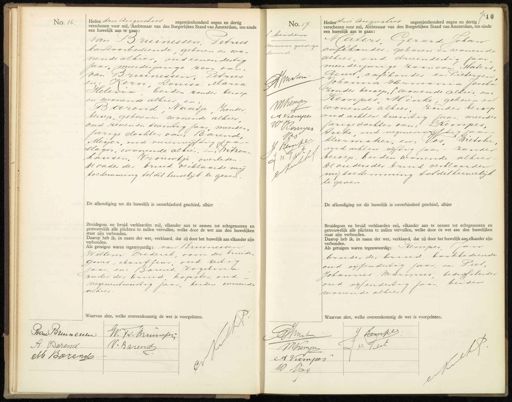 No. 16 Heden drie Augustus negentienhonderd negen en dertig verschenen voor mij, Ambtenaar van den Burgerlijken Stand van Amsterdam, ten einde een huwelijk aan te gaan van Bruinessen Petrus kandoorbediende, geboren en wo„ nende alhier oud eenendertig jaar, meerderjarige zoon van van Bruinessen, Petris en: Kern, Louisa Maria Helina beiden zonder beroep en wonende alhier en: Barend Naatje, Zonderd beroep, geboren en wonende alhier oud zeven en twintig jaar meerder jarige dochter van: Barend, Meijer, oud vierenvijftig jaar. slagen, wonende alhier, en, Witzen. hausen, Vrouwtje overleden De vader der bruid verklaarde mij toestemming tot dit huwelijk te geven De afkondiging tot dit huwelijk is onverhinderd geschied, alhier. Bruidegom en bruid verklaarden mij, elkander aan te nemen tot echtgenooten en getrouwelijk alle plichten te zullen vervullen, welke door de wet aan den huwelijken staat zijn verbonden. Daarop heb ik, in naam der wet, verklaard, dat zij door het huwelijk aan elkander zijn verbonden. Als getuigen waren tegenwoordig: van Bruinessen Willem Frederik, oom des bruide„ Goms, charffeur oud zestig jaar en: Barend. Vogelina zuster der bruid kopster, oud negenentwintig jaar, beiden wonende alhier Waarvan akte, welke overeenkomstig de wet is voorgelez No. 17. beiden renvooi goedge keurd. Ppunten Whemp A Viemper W Kemryjes Kugt L W. vfhf. Heden drie Augustus negentienhonderd negen en dertig verschenen voor mij, Ambtenaar van den Burgerlijken Stand van Amsterdam, ten einde een huwelijk aan te gaan: laters, Gerard Johan cafehouder, geboren en wonende alhier, oud drieendertig jaar meerderjarige zoon van Maters Geurt, caféhouder en, Pietersen Johanna Hermania Jacoba zonder beroep, wonende alhier en Rempes Minke, geboren en wonende alhier, zonder beroep oud achten twintig jaar meerder jarige dochter van: Kempes¬ tuke, oud negenenvijftig jaar. kleermaker, en„ Vos Wietske oud acht en vijftig jaar- zonder beroep, beiden wonende alhier De ouders der bruid verklaarden mij toetemming tot dit huwelijk te geven De afkondiging tot dit huwelijk is onverhinderd geschied, alhier Bruidegom en bruid verklaarden mij, elkander aan te nemen tot echtgenooten en getrouwelijk alle plichten te zullen vervullen, welke door de wet aan den huwelijken staat zijn verbonden. Daarop heb ik, in naam der wet, verklaard, dat zij door het huwelijk aan elkander zijn verbonden. Als getuigen waren tegenwoordig: Rempes Jan broeder der bruid bankbediende oud vijfendertig jaar, en Peet, Johannes Marinus bedrifsleiden oud vijfendertig jaar beiden wonende alhier. Pan Bruinenen W. Jv. Krunmpen A: Barend. VBarend M Boerend J. Kompes. Spnat JH. Peet MRempe A Viemper W Vos