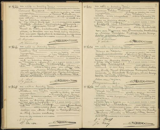 No. 3644 Heden acht en twintig Juni negentienhonderd zeven en twintig verschenen voor mij Ambtenaar van den burgerlijken stand van Amsterdam: van beroep Bernard Teijnders aanspreker oud drie en viftig jaren, wonende en Barend Voorenburg alhier van beroep aanspreker oud vijf en zeventig jaren wonende alhier die verklaarden, dat op zes en twintig dezer de na middags, ten half een ure, in de gemeente Amsterdam is overleden Jacoba Alida Georgma zonder „ echtgenoote van van Buyns beroep „geboren August Karel de Boer, beeldhouwer beiden wonende alhier, is bevallen van een knd dat zij als leven- loos aangeven. Goedgekeurd de doorhaling van vijf woorden Waarvan akte, welke overeenkomstig de wet is voorgelezen. B. Reijnders. Bnauver B. Dverenbury No. 3650 Heden acht en twintig Juni 3 negentienhonderd zeven en twintig verschenen voor mij Ambtenaar van den burgerlijken stand van Amsterdam: Herman Fokke Tillman van beroep aanspreker oud twee en veertig jaren, wonende en Jan Wacker alhier van beroep aanspreker oud drie en zeventig jaren wonende alhier, die verklaarden, dat op zeven en twintig dezer des voor middags ten negen ure, in de gemeente Amsterdam is overleden nere CS van Jrummeler Andrt ,wonende alhier zonder oud zes jaren geboren te Buiksloot zoon van Herman van Brummelen broodbakker en Maria Theodora Decnop, zonder beroep beiden wonende alhier Waarvan akte, welke overeenkomstig de wet is voorgelezen. H. F Villman 1 Hauver S Walker Heden acht en twintig Juni negentienhonderd zeven en twintig verschenen voor mij Ambtenaar van den burgerlijken stand van Amsterdam: van beroep Jacobus Fas oud een en zestig jaren, wonende tanspreker en Jan Wacker alhier van beroop aansprekers - oud drie en zeventig jaren